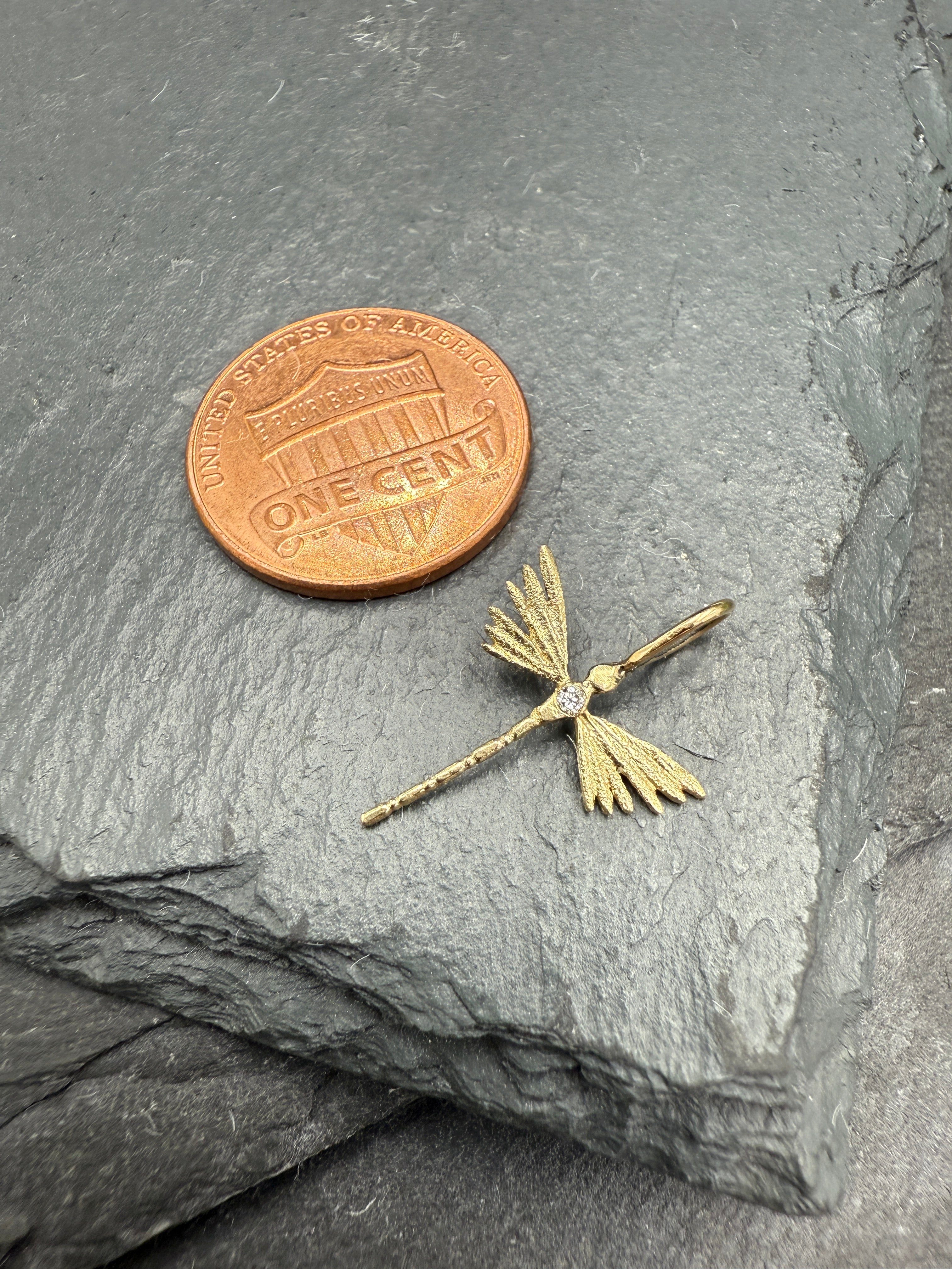 A textured 14K yellow gold and diamond tiny dragonfly charm is suspended on a gold bale. Chain sold separately. Charm measures just shy of an inch.