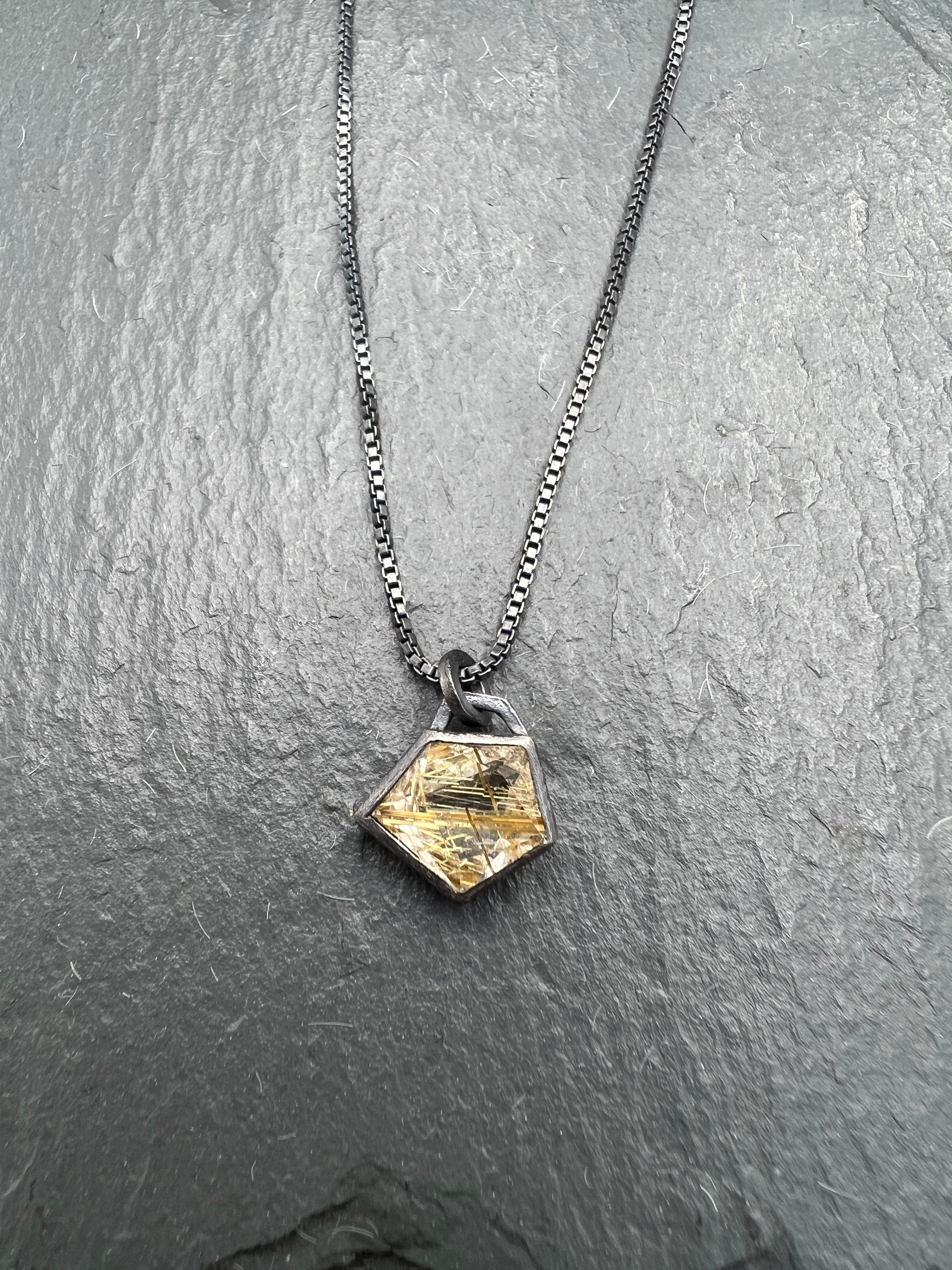 A perfect little necklace, this rutilated quartz is encased in an oxidized silver bezel, highlighting the unique geometric shape. The pendant hangs approximately half an inch from the 18" oxidized box chain.