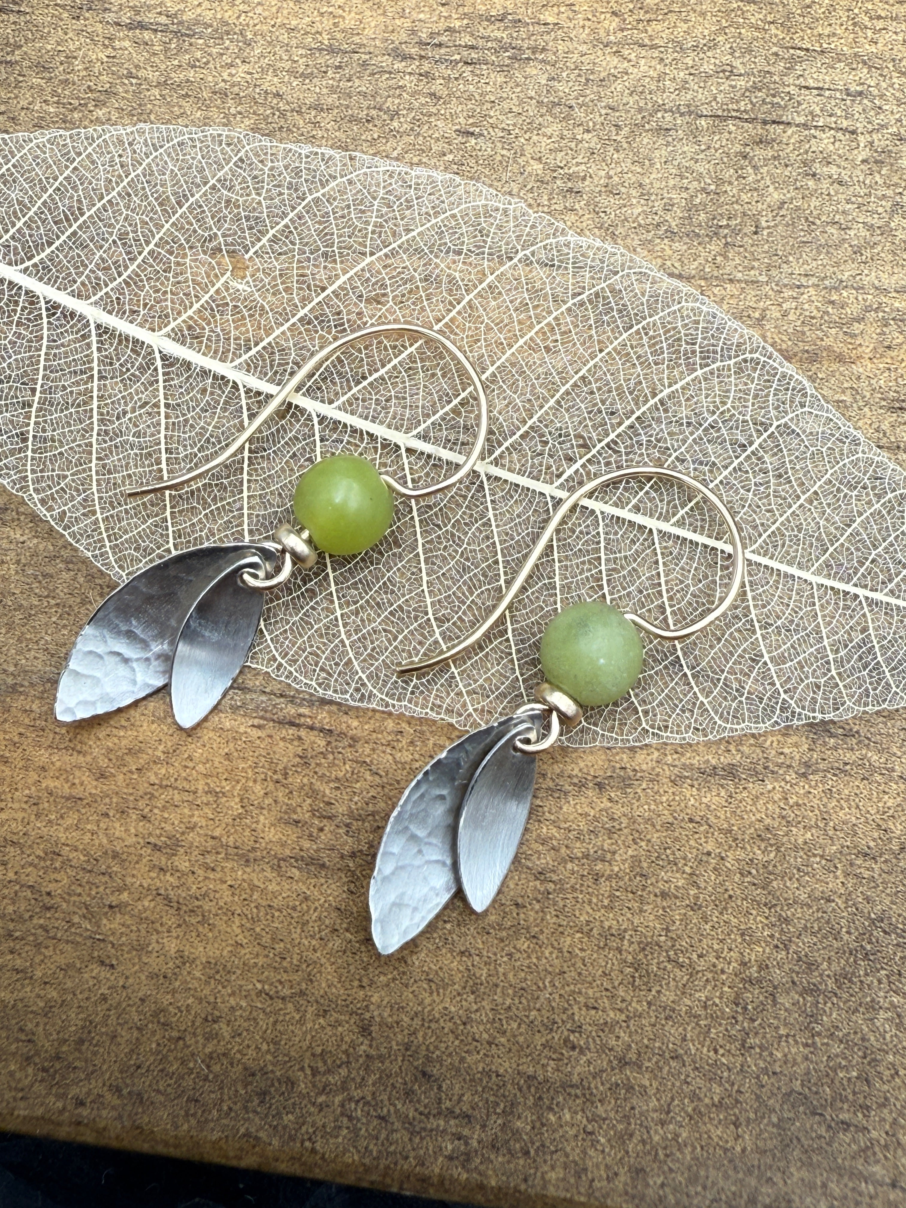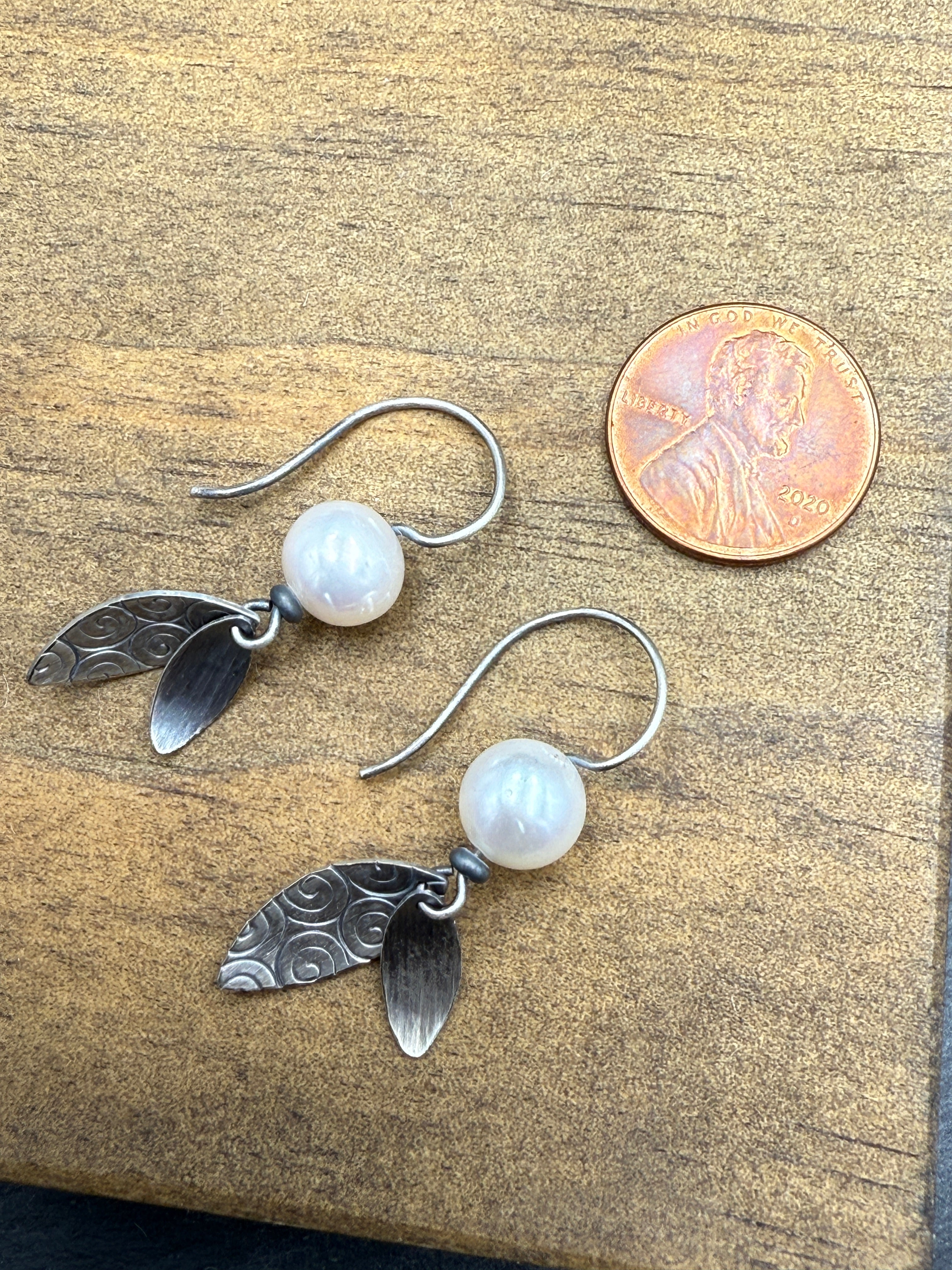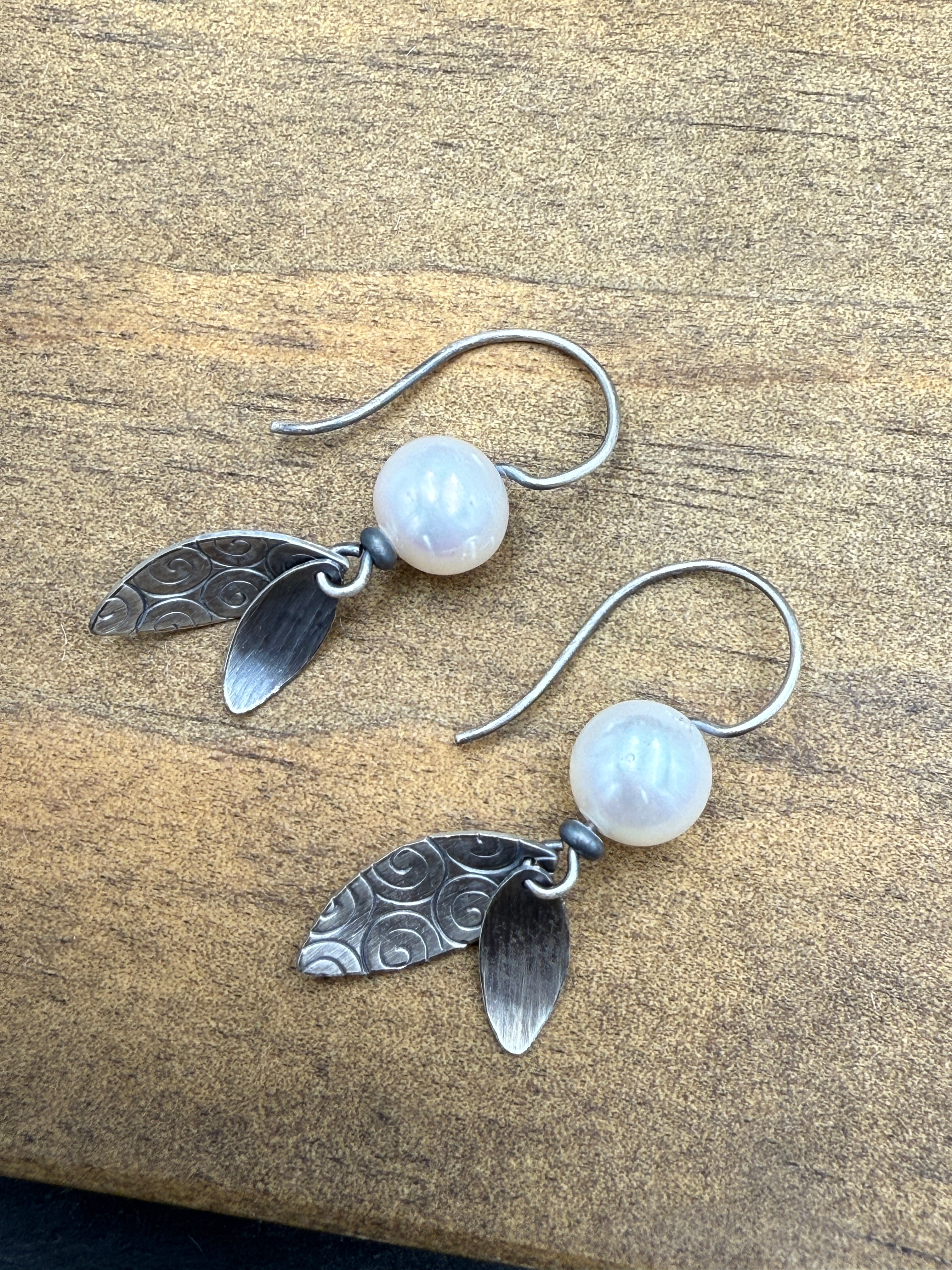These sweet everyday earrings feature either a freshwater pearl or a jade bead at the top with sterling silver leaves hanging down. The pearl set is all in sterling silver, with swirl details on the back leaves, with oxidization for visual interest. The jade set features shiny sterling silver leaves, with a hammered detail. The ear wires are gold vermeil.