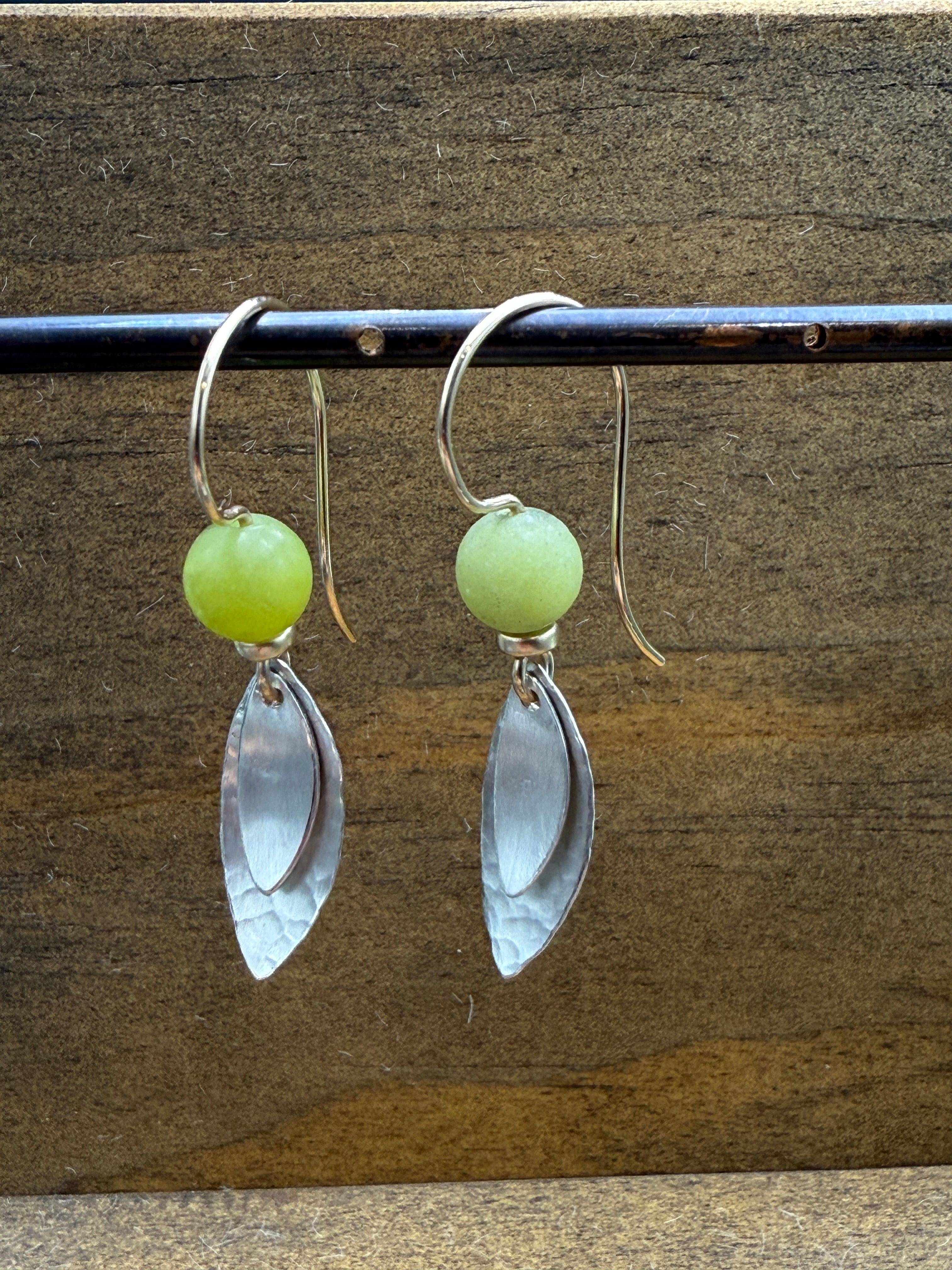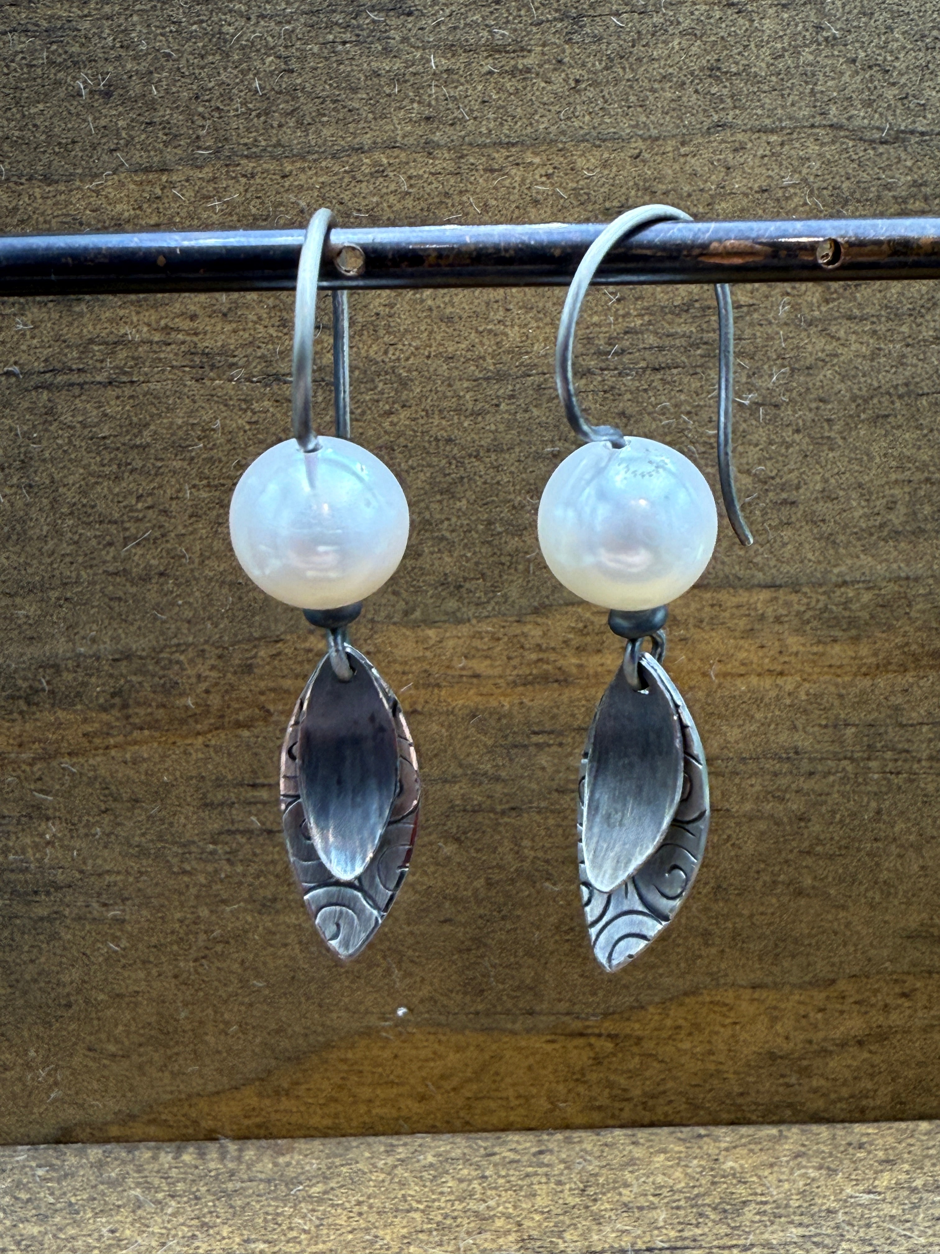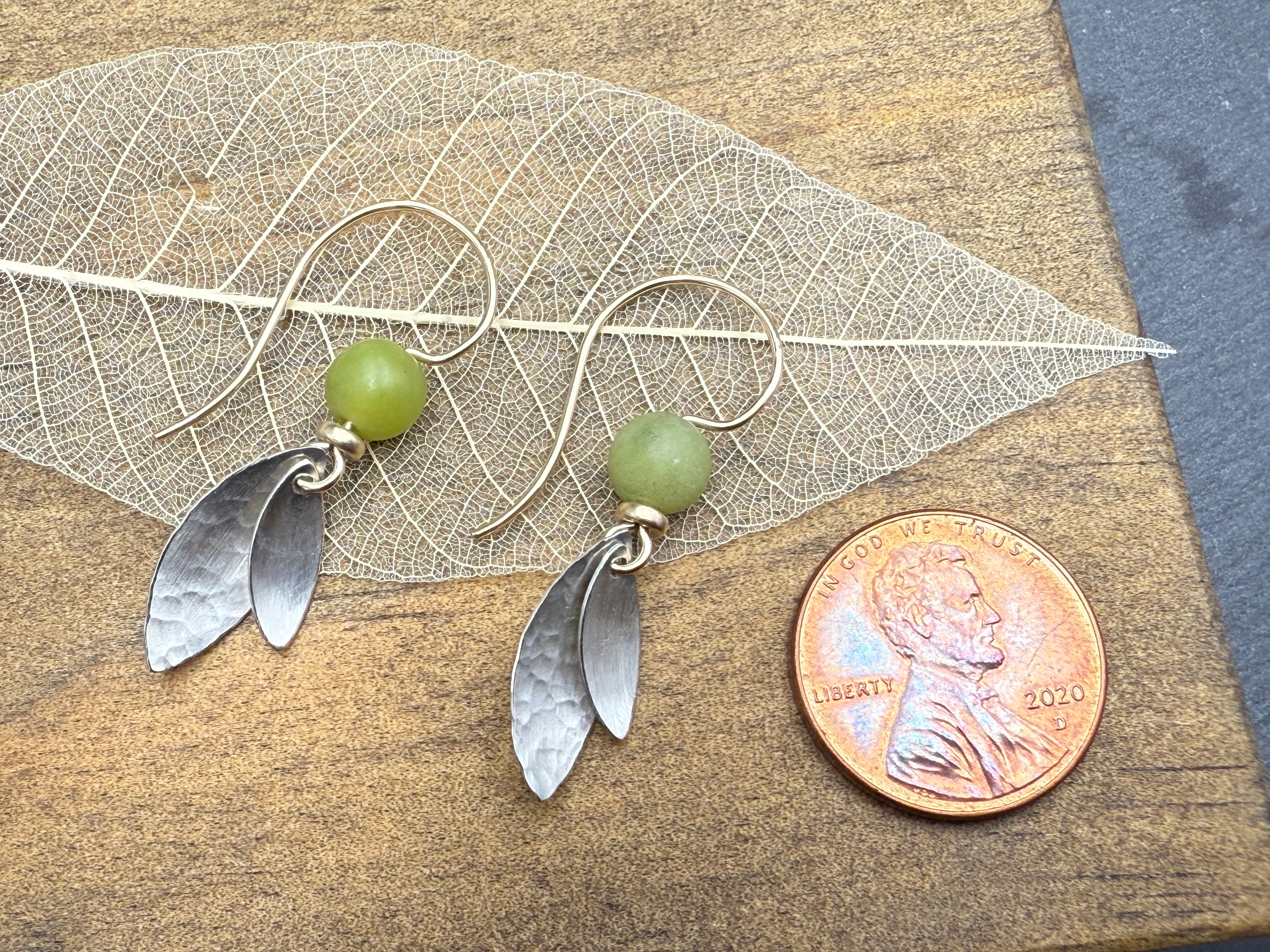 These sweet everyday earrings feature either a freshwater pearl or a jade bead at the top with sterling silver leaves hanging down. The pearl set is all in sterling silver, with swirl details on the back leaves, with oxidization for visual interest. The jade set features shiny sterling silver leaves, with a hammered detail. The ear wires are gold vermeil.