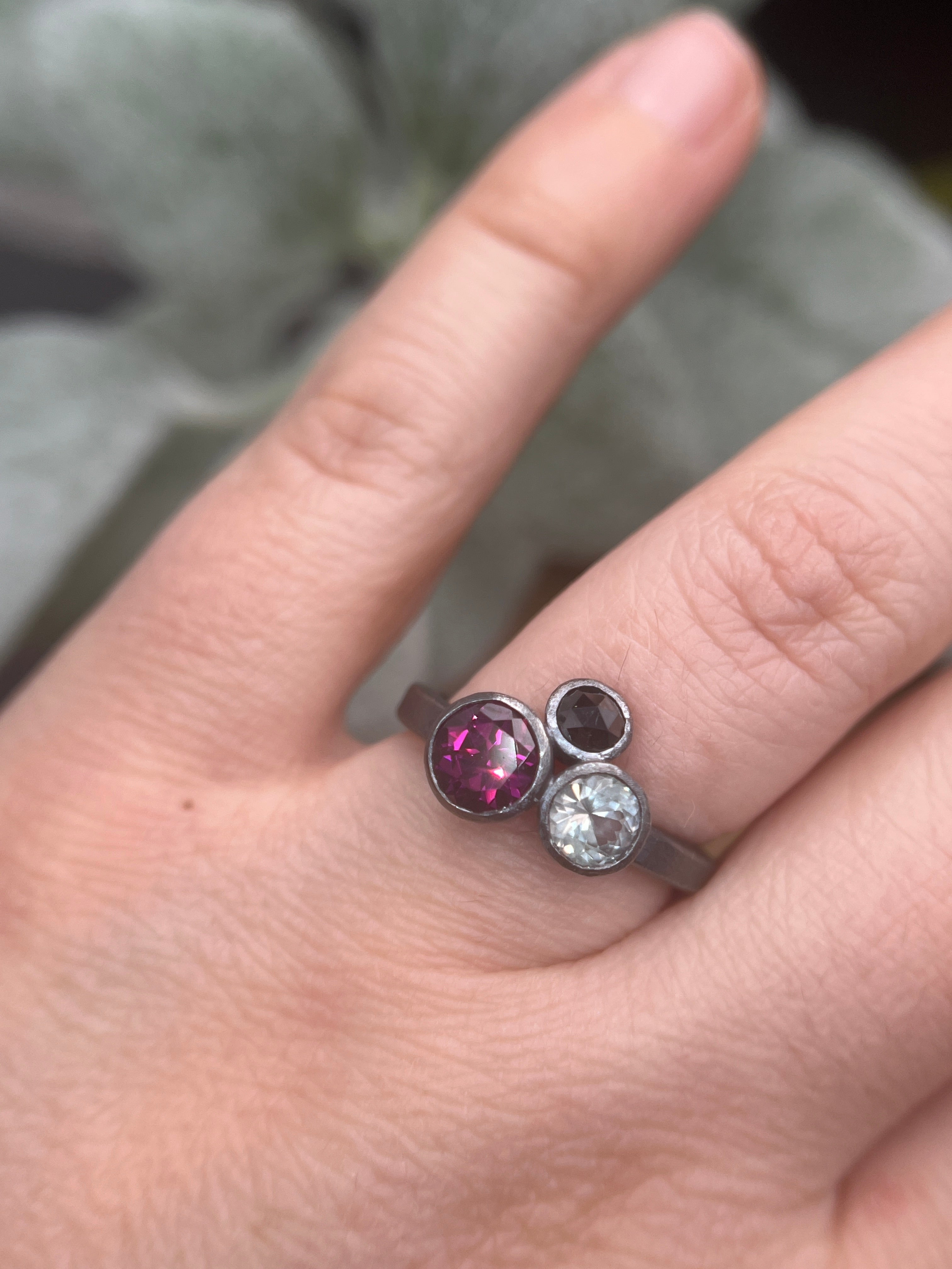 The best kind of cluster, this ring features a 6mm rhodolite garnet, a 4mm black diamond rose cut, and a 5mm gray sapphire that sometimes has green/blue undertones. All stones are bezel set in oxidized sterling silver.