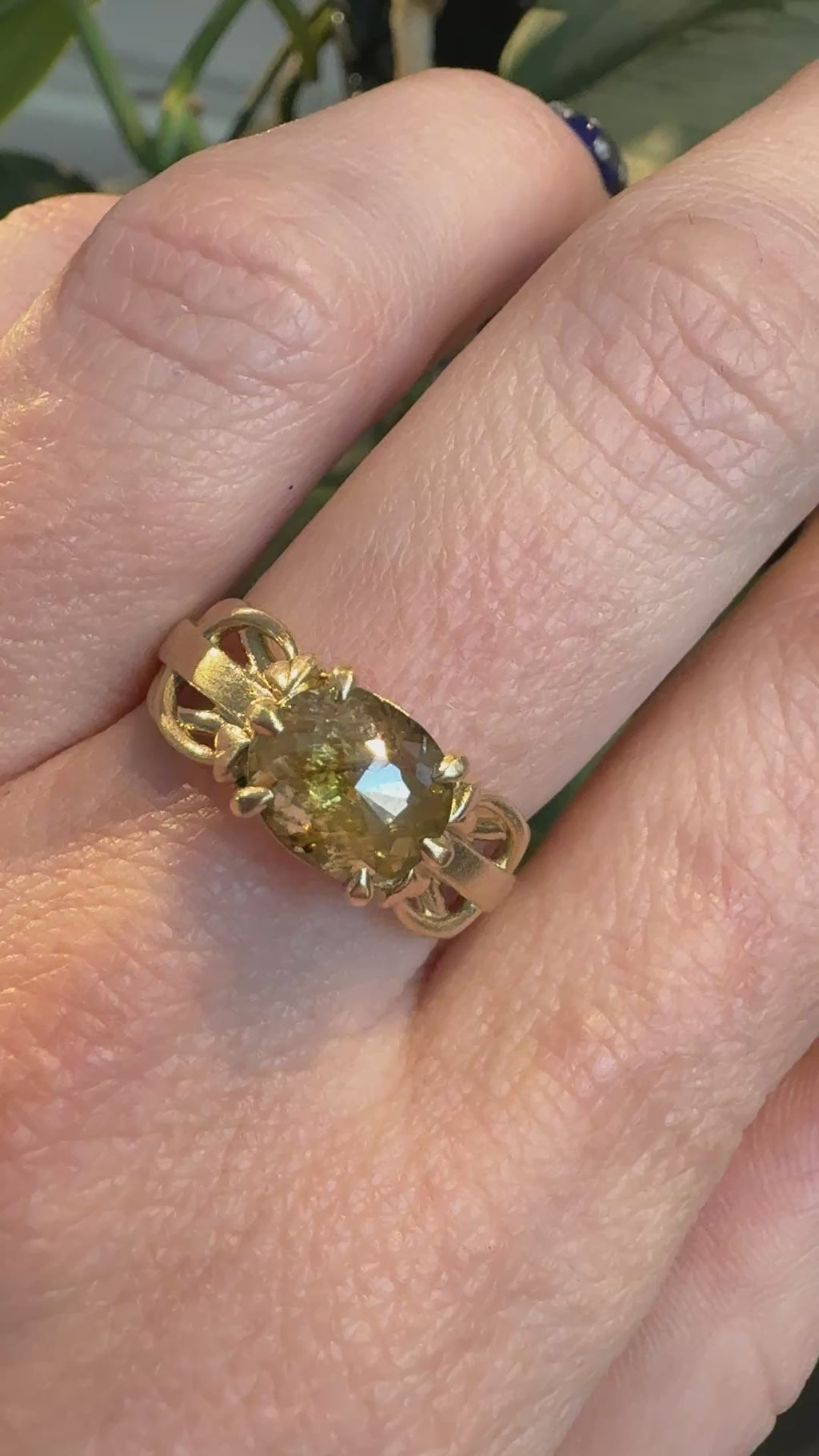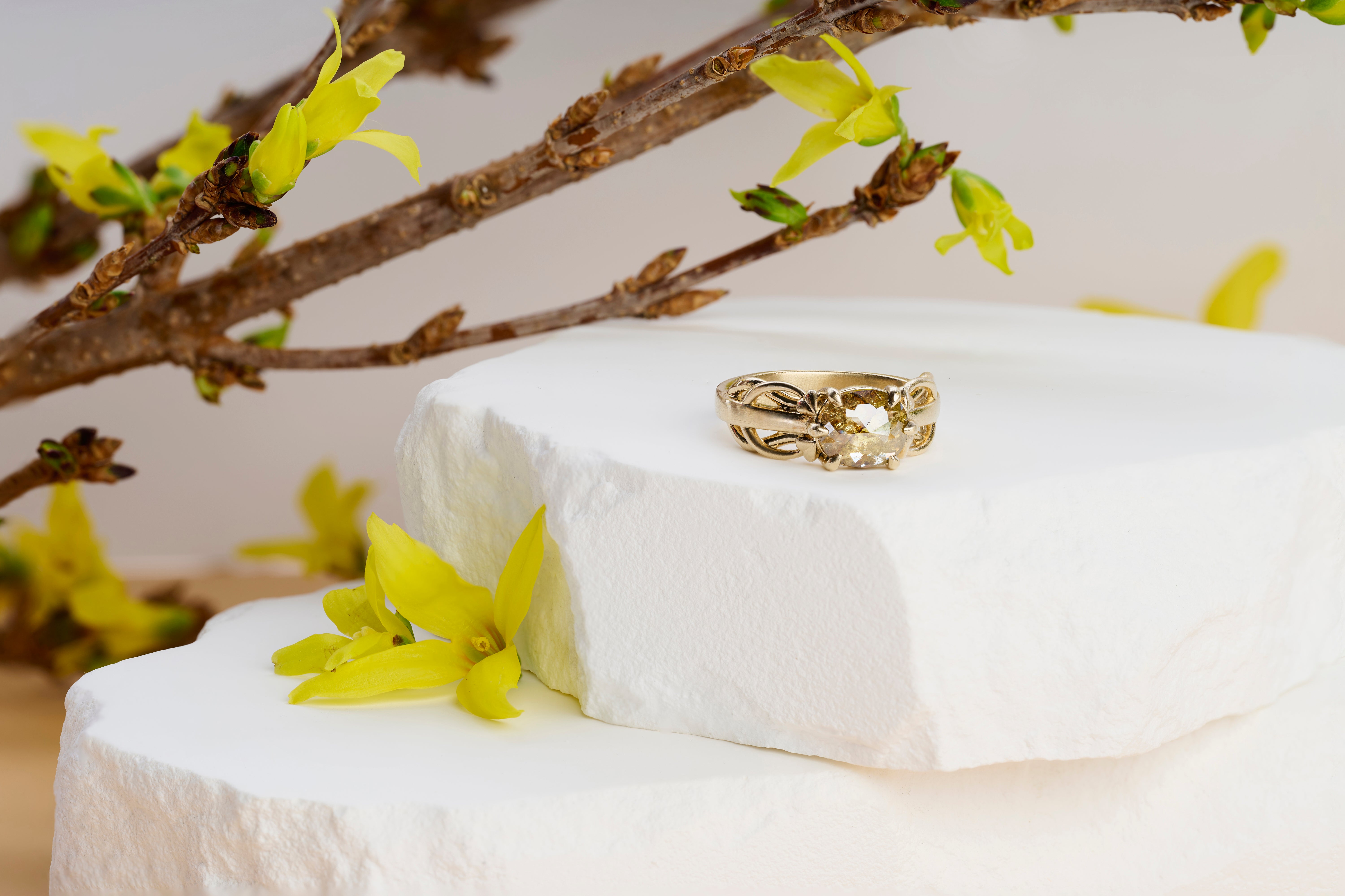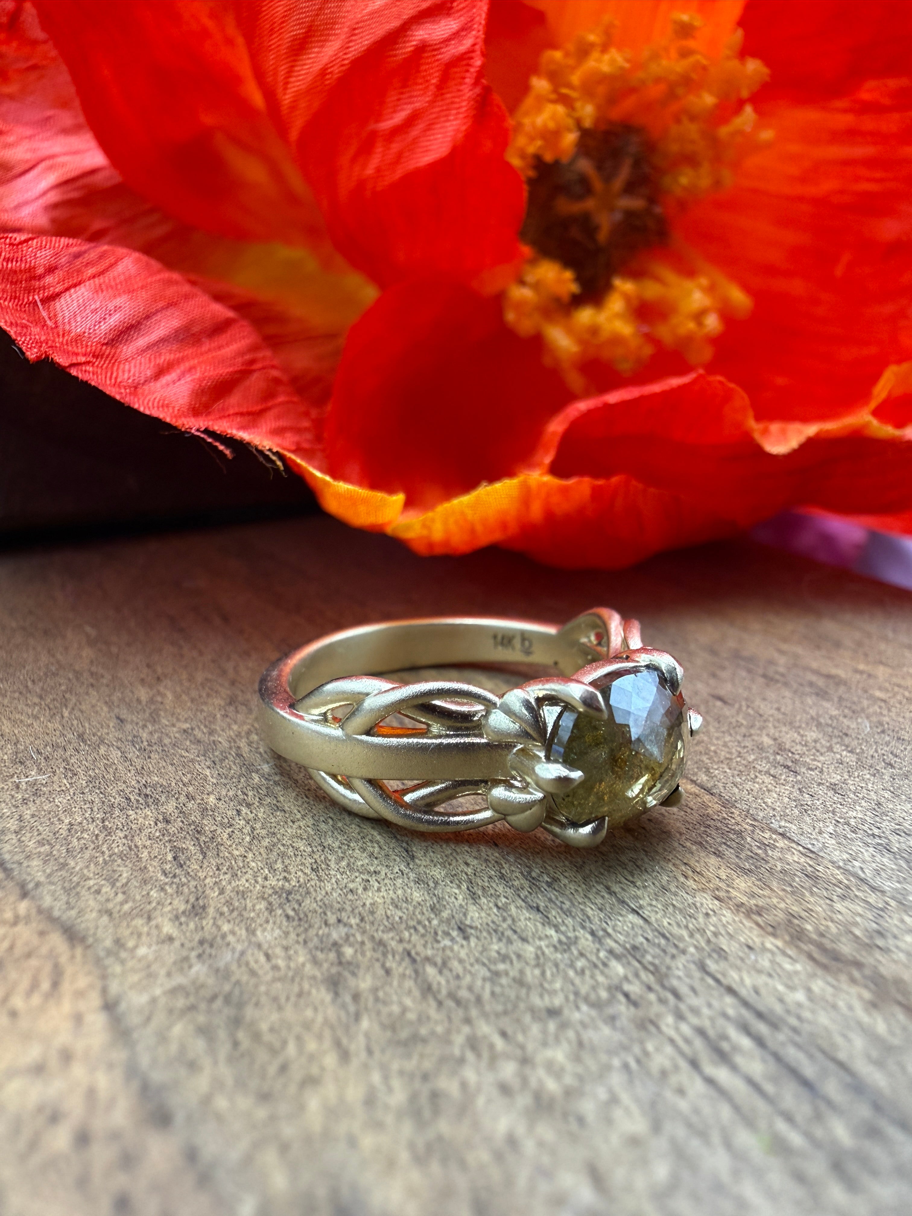 Entwined celebrates the beautiful complexity of natural connection through interwoven openwork that wraps the band like tangled vines. The 1.48ct rustic diamond at its center carries organic inclusions that echo the metalwork's natural influence. Set in warm yellow gold, this ring honors natural imperfection and the wild, unpredictable beauty of nature and connection.