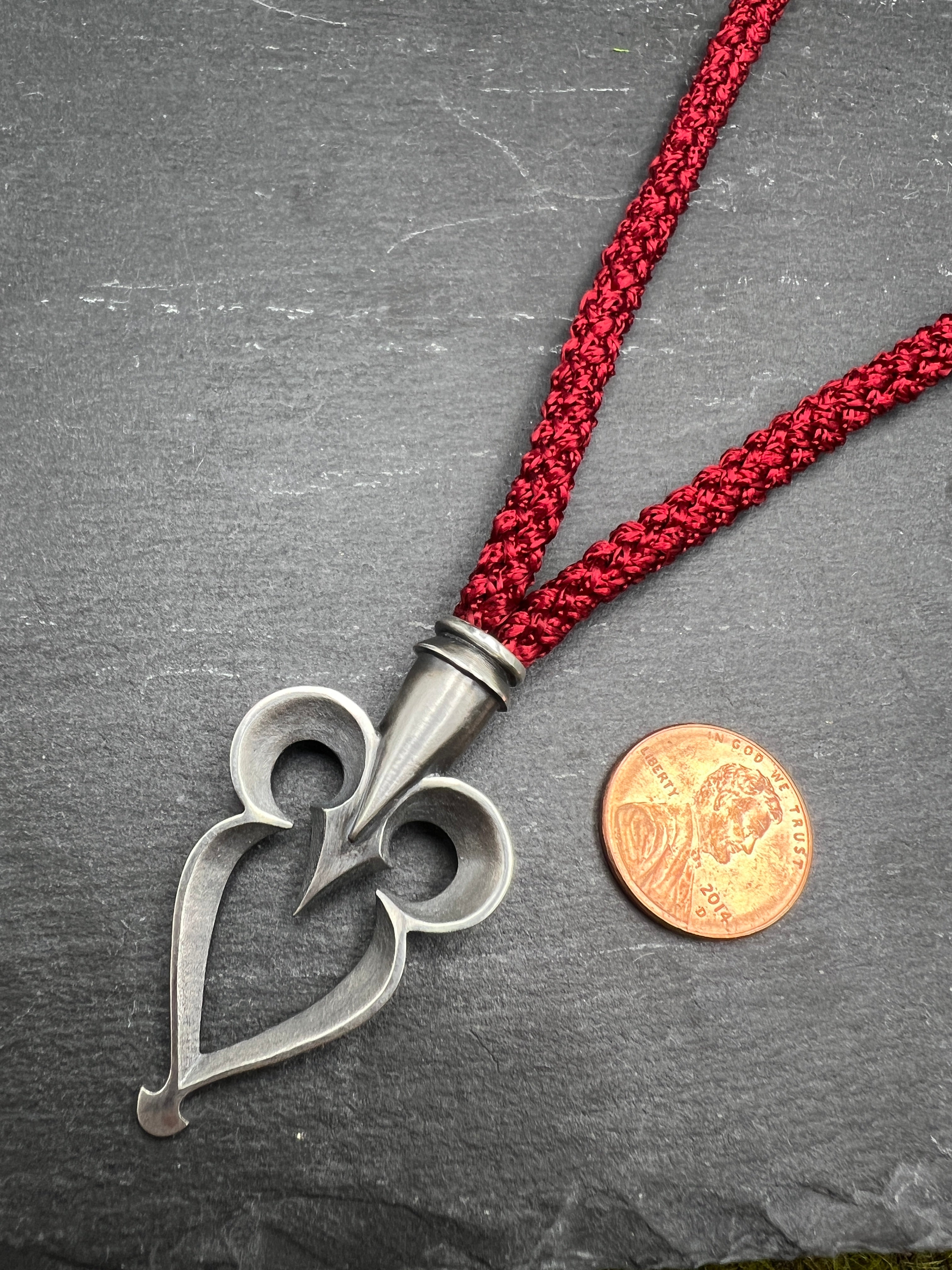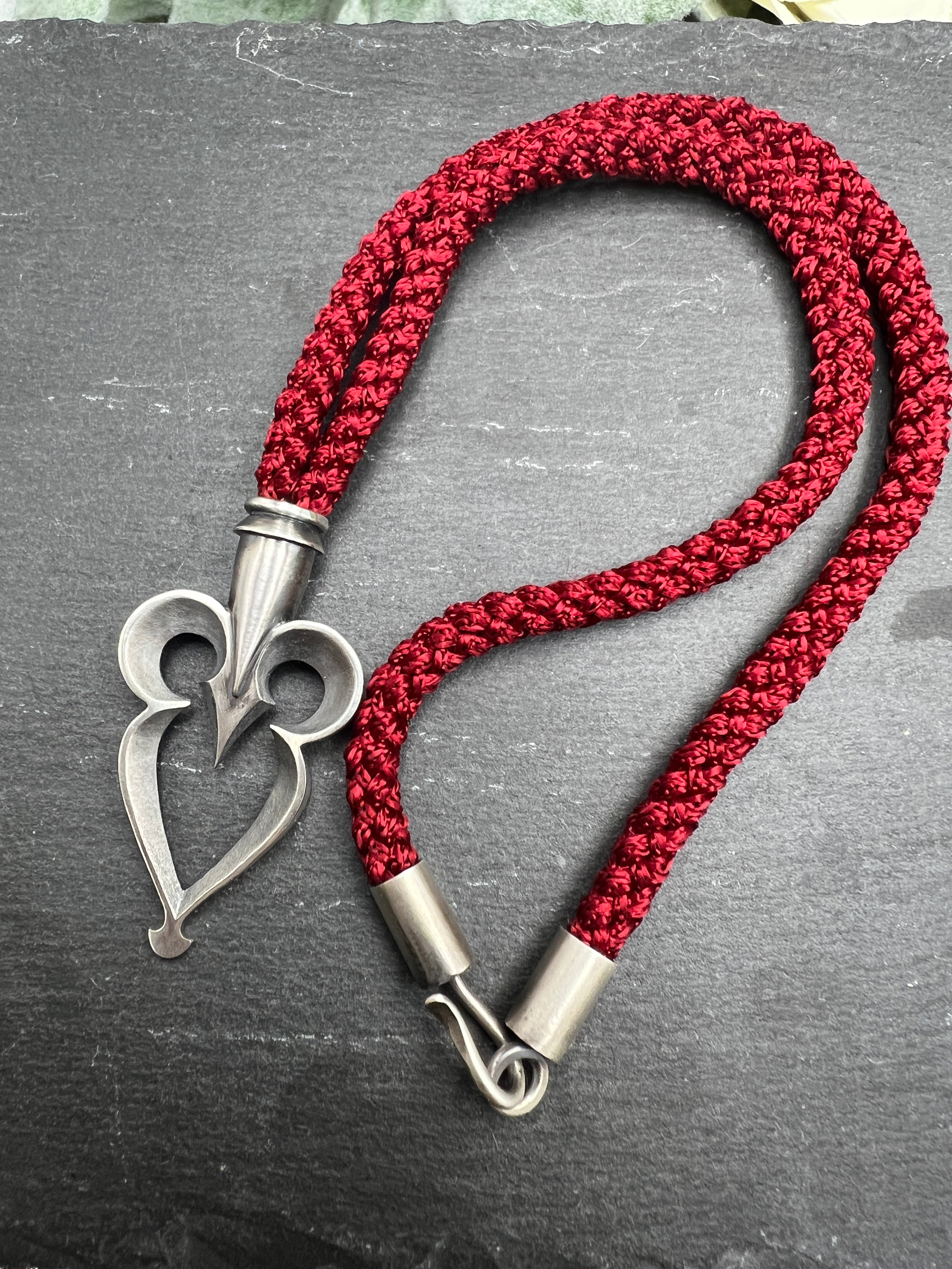 This statement necklace features a hand carved, cast and fabricated pendant in sterling silver. The dark red custom braided double cord measures 16" with sterling silver rear closure. The pendant measures 2" long and 1" across at its widest part.