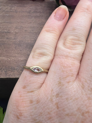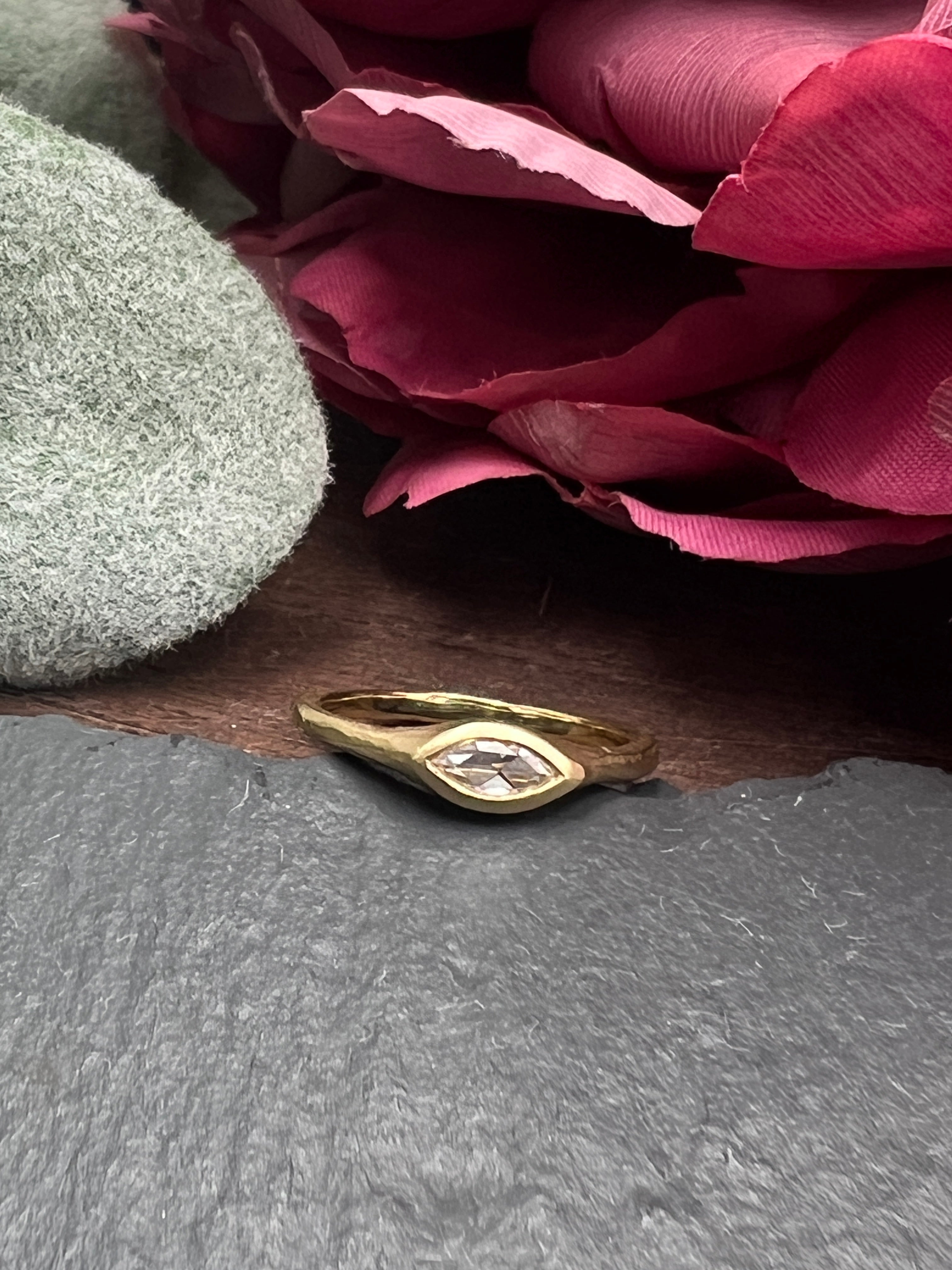 This organically shaped 14k yellow gold ring holds a lovely marquise .32ct natural diamond. A subtly elegant piece on its own as a non-flashy wedding ring or equally lovely on any finger for any occasion.