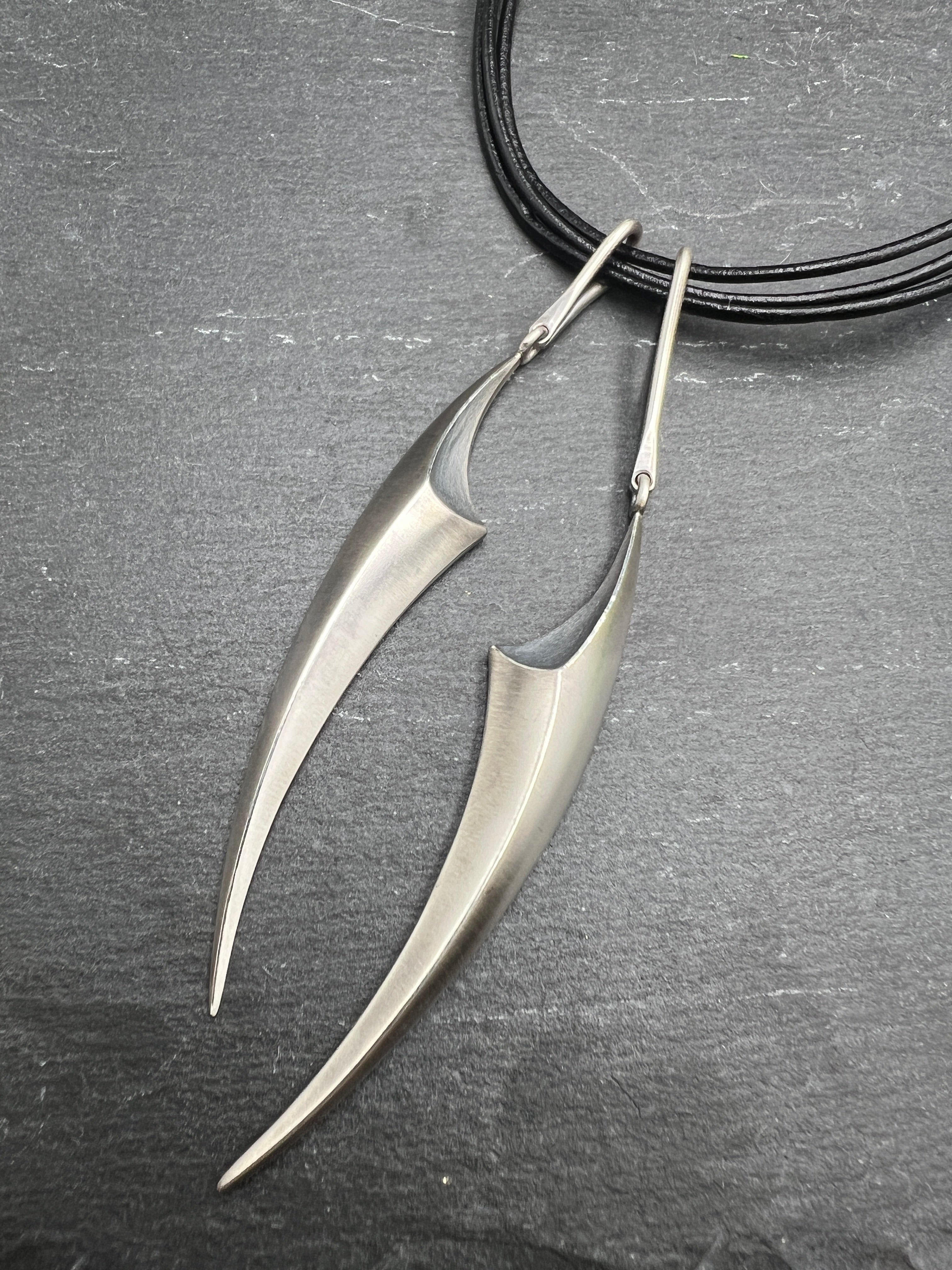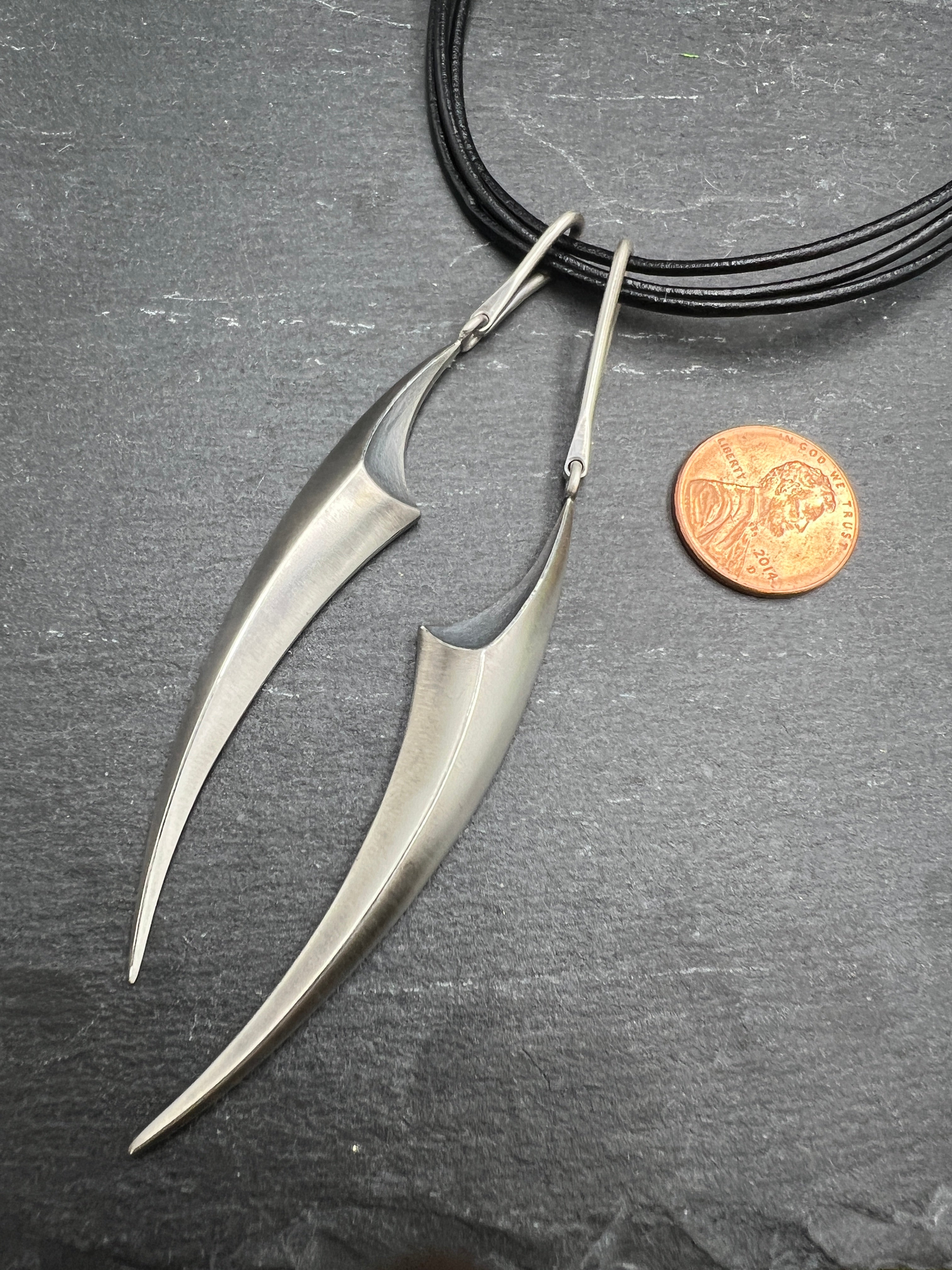 A cool necklace for a cool individual! Two sterling silver fangs hang offset from each other (3.5" and 4") from a triple black 16" leather cord with silver forged hook closure.