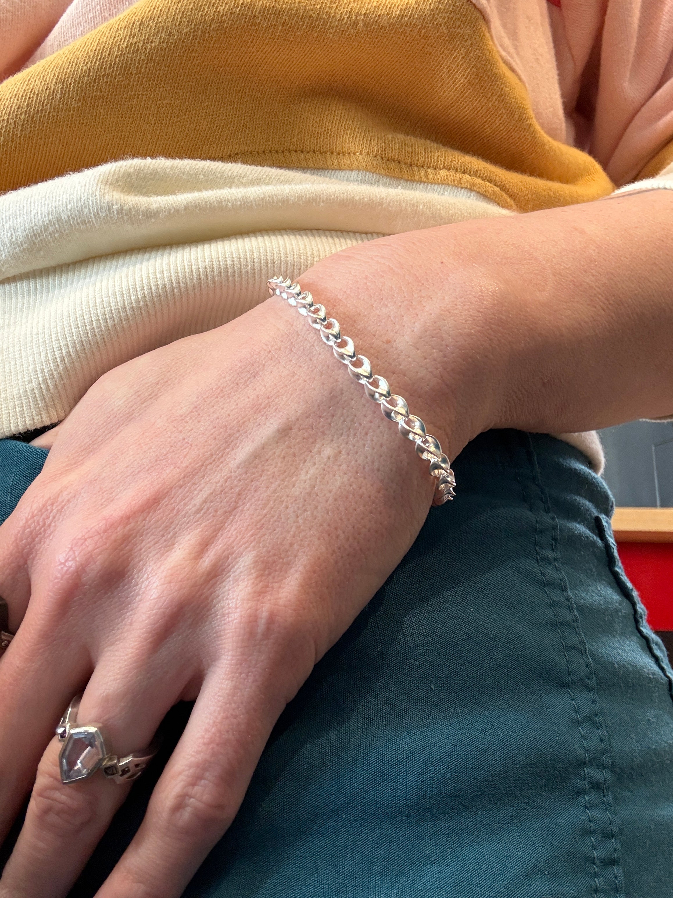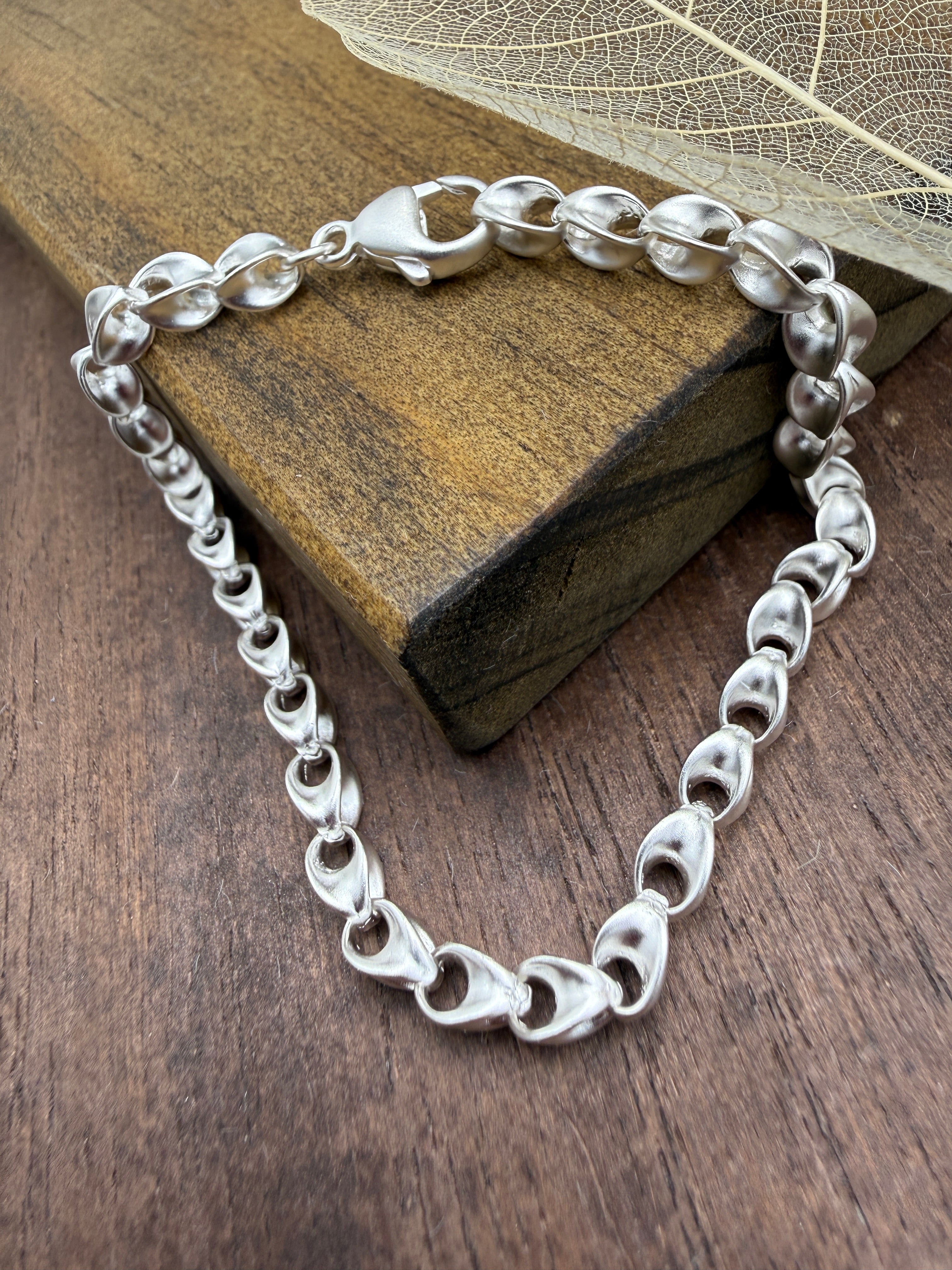 This unique bracelet features a Fishbone Link in sterling silver with a matte finish. The chain is 4.6mm wide, 7.25 inches in total length.