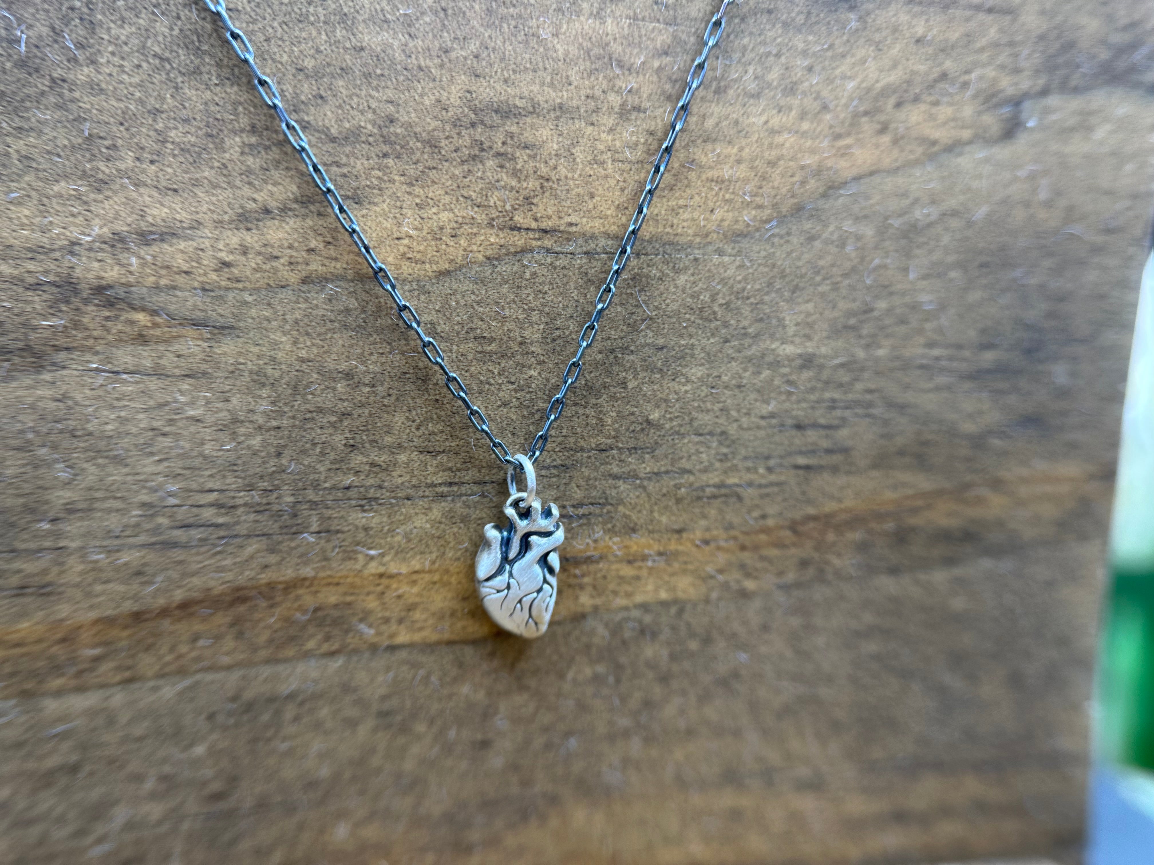 Keep your love's heart close to yours rather than in a desk drawer (for all Mary Shelley fans out there). This pendant features an anatomical heart, lightly oxidized with a brushed finish. It hangs on a classic oxidized sterling silver cable chain that is 20" long, but with stations at 18" and 16" as well for adjustability.