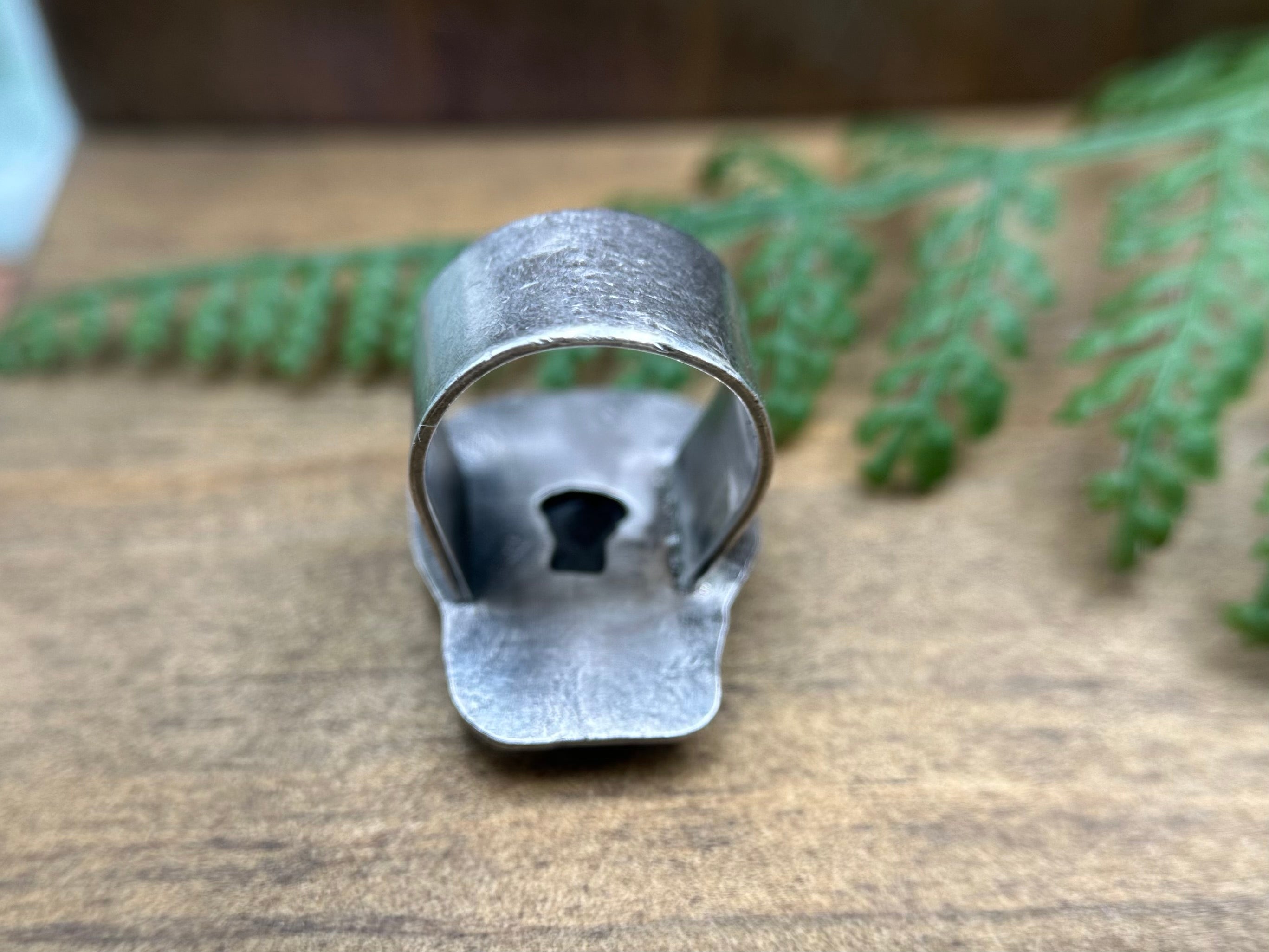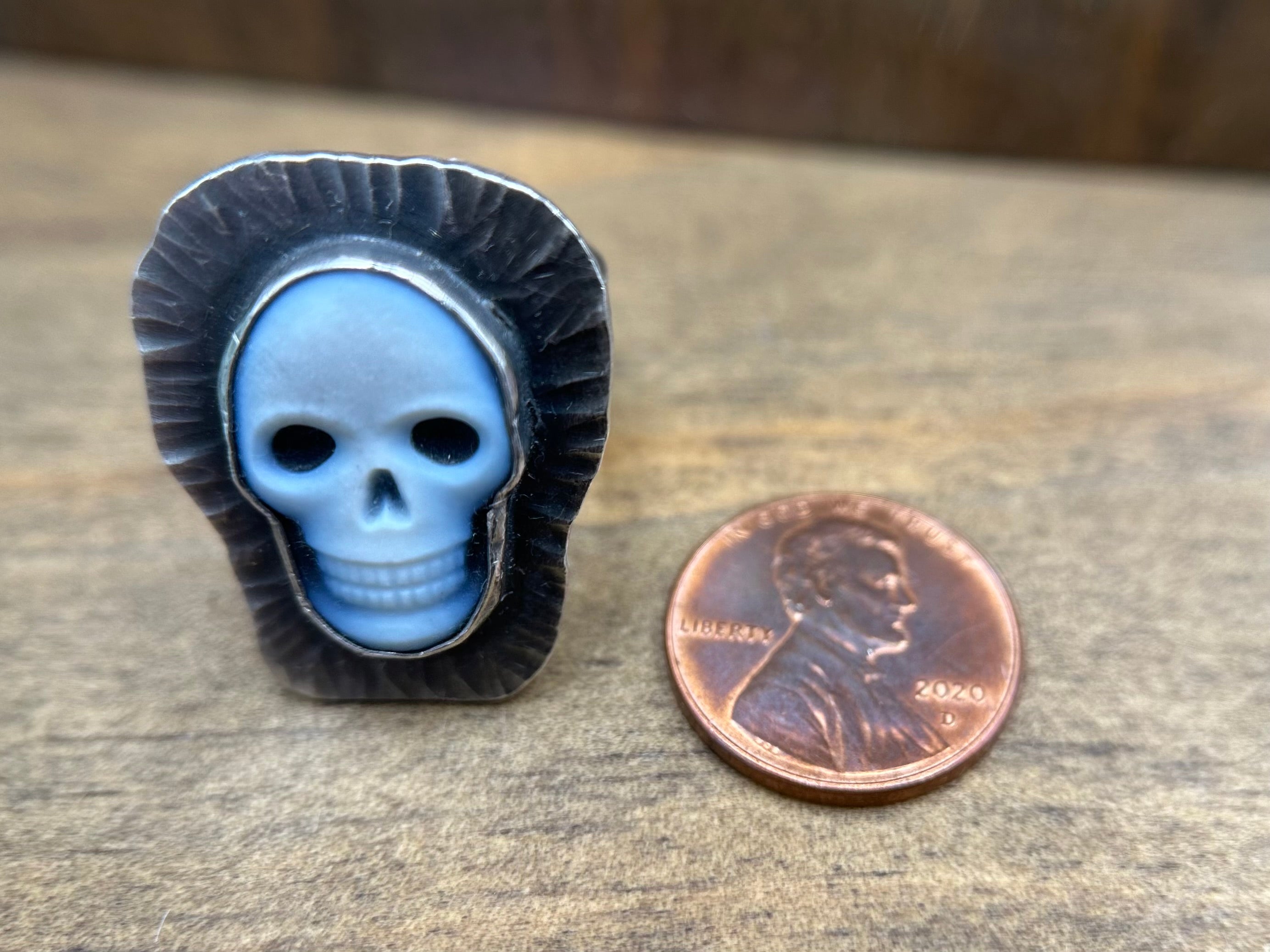 A hauntingly beautiful skull cameo takes center stage in this sterling silver statement ring, its ethereal blue-grey tones shifting between bone-white and shadow as light plays across the surface. The skull’s serene expression serves as a gentle reminder of life’s precious, fleeting nature—memento mori in its most wearable form.