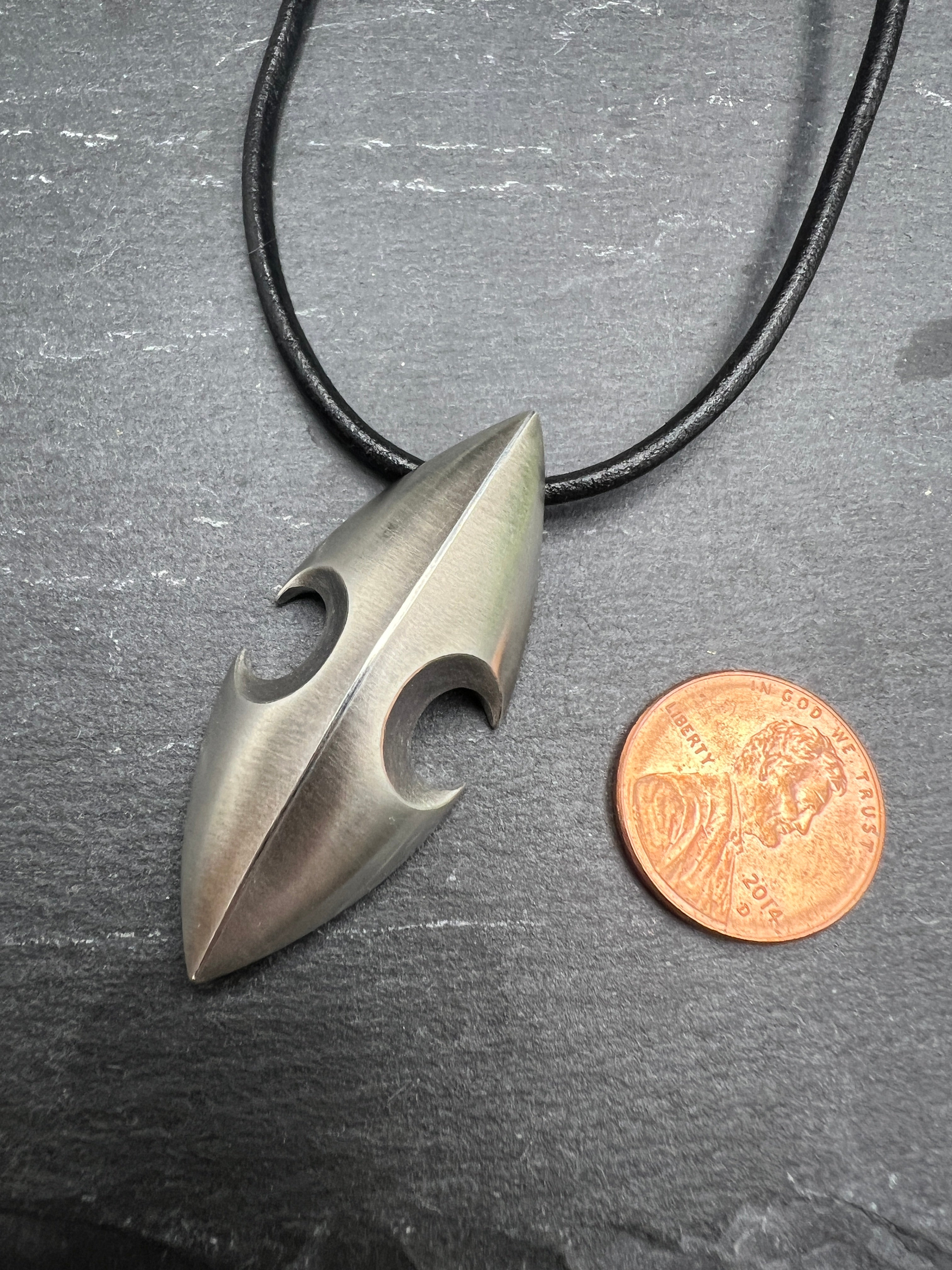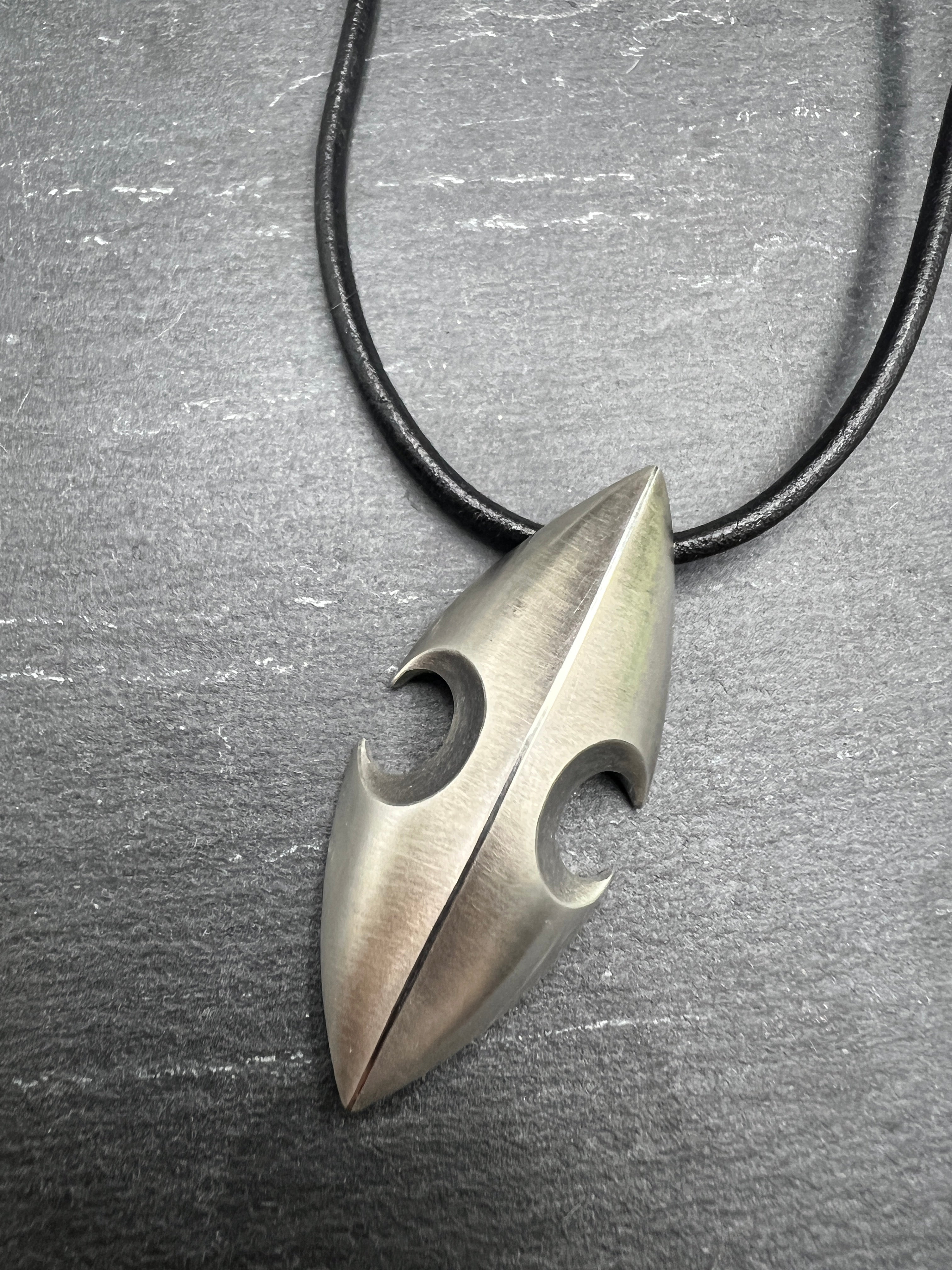 A simple statement piece, this unique hand cast sterling silver pod hangs 2" long from a single black 16" leather cord with silver forged hook closure.