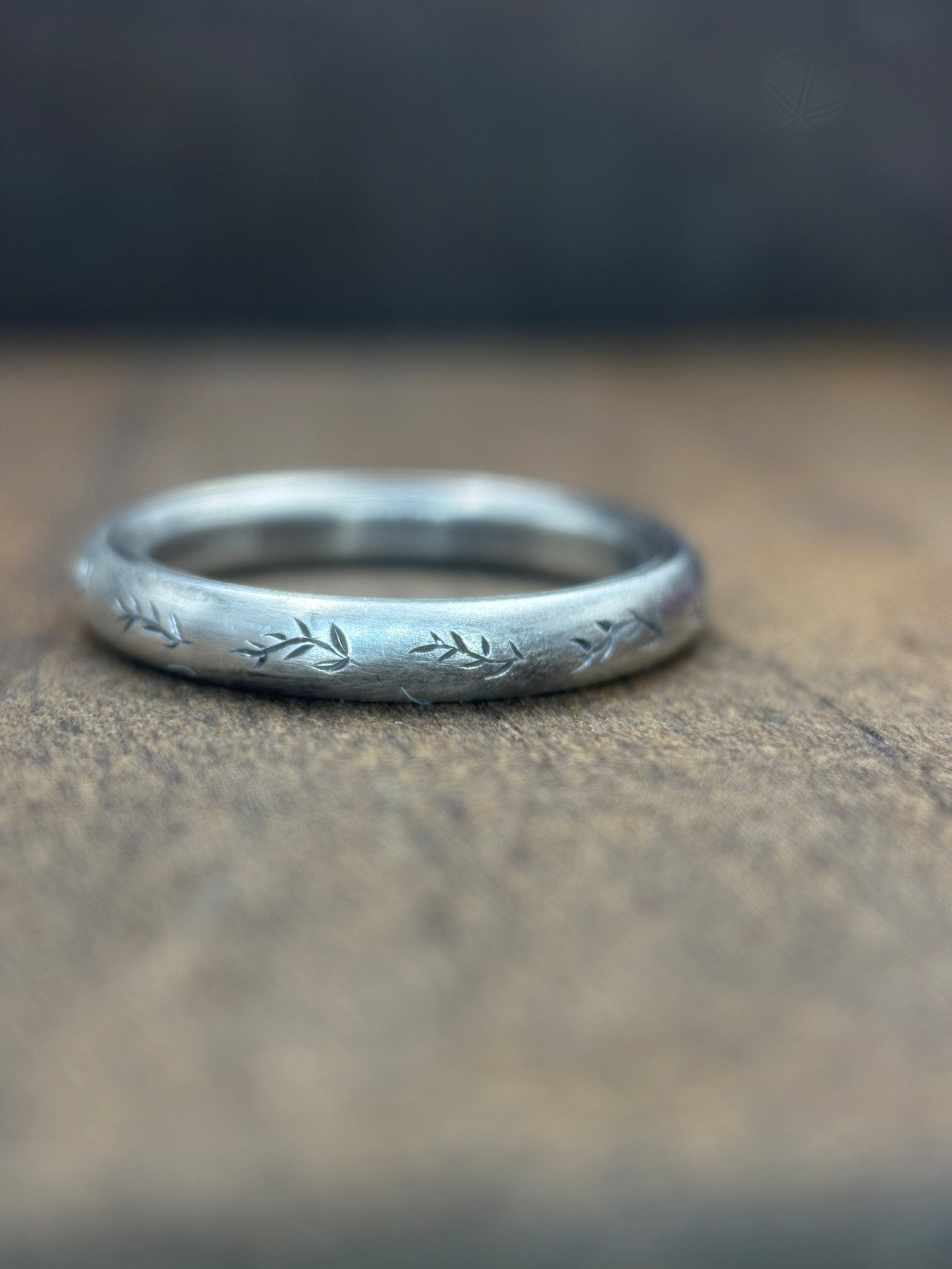 Simple yet beautiful, this stunning sterling silver ring features hand engraved olive branch details around the band. The band is half round in profile, comfort fit, and is 3mm wide. The ring is a size 5.5 and cannot be resized, but can be custom ordered in other metals and widths.