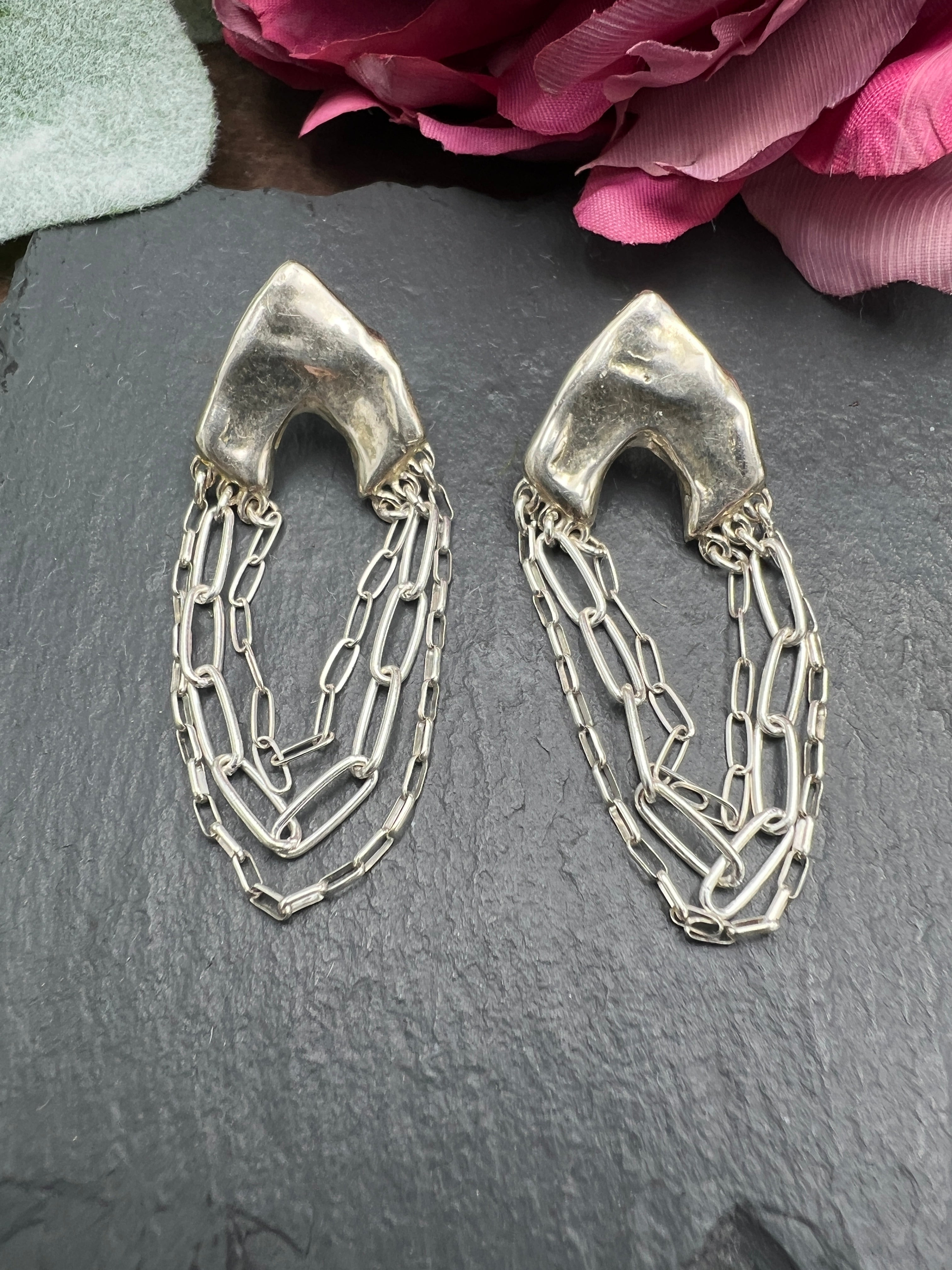 These handmade, beautiful Chevron shaped posts with trails of silver chain that sparkle as they dangle. Chains used for these earrings are all pieces of leftover scrap or ends of chain rolls that weren't quite long enough for a necklace. These parts all come together to become serious stunners. Set on sterling silver posts, these earrings measure almost 2" in length.