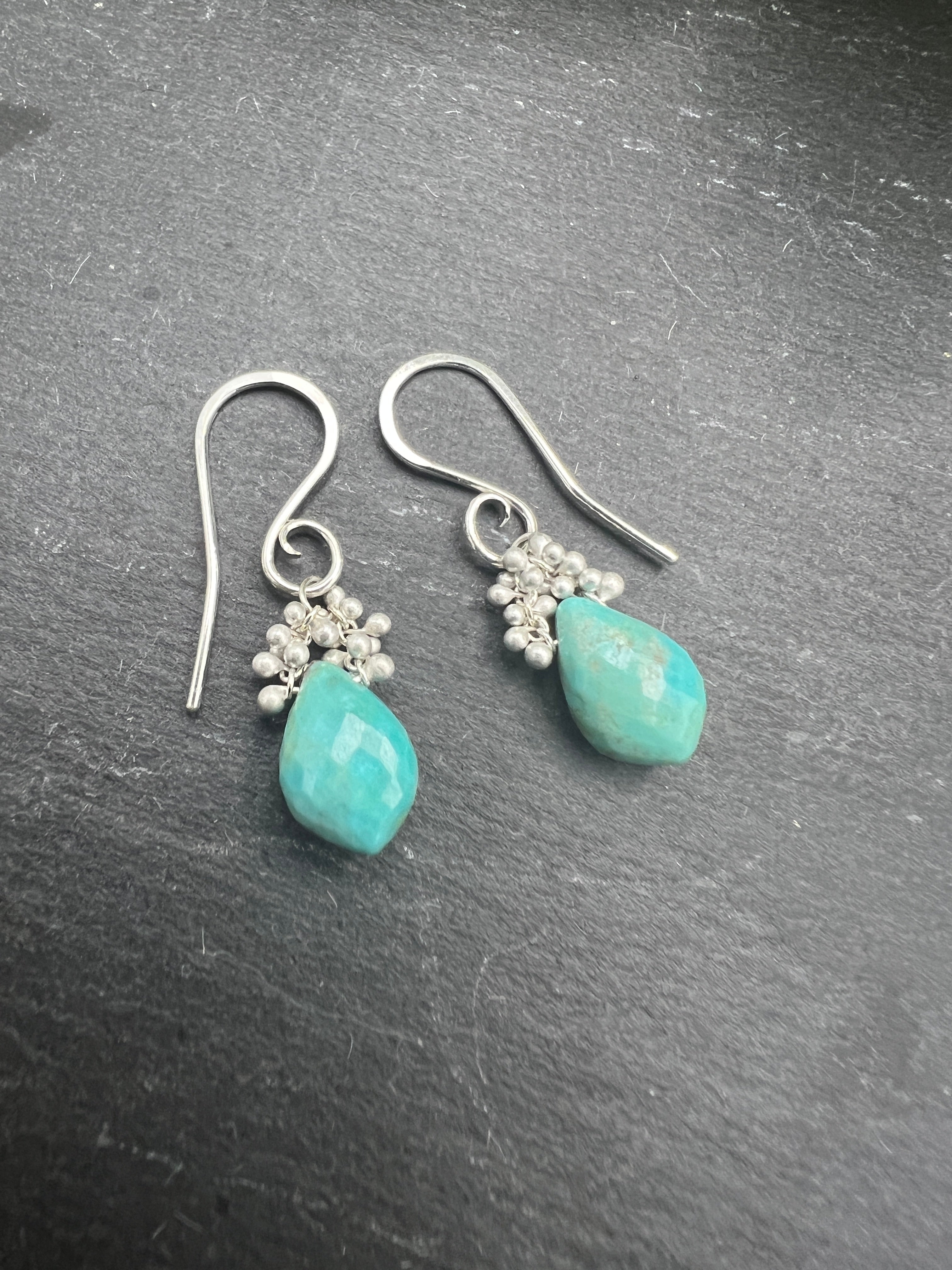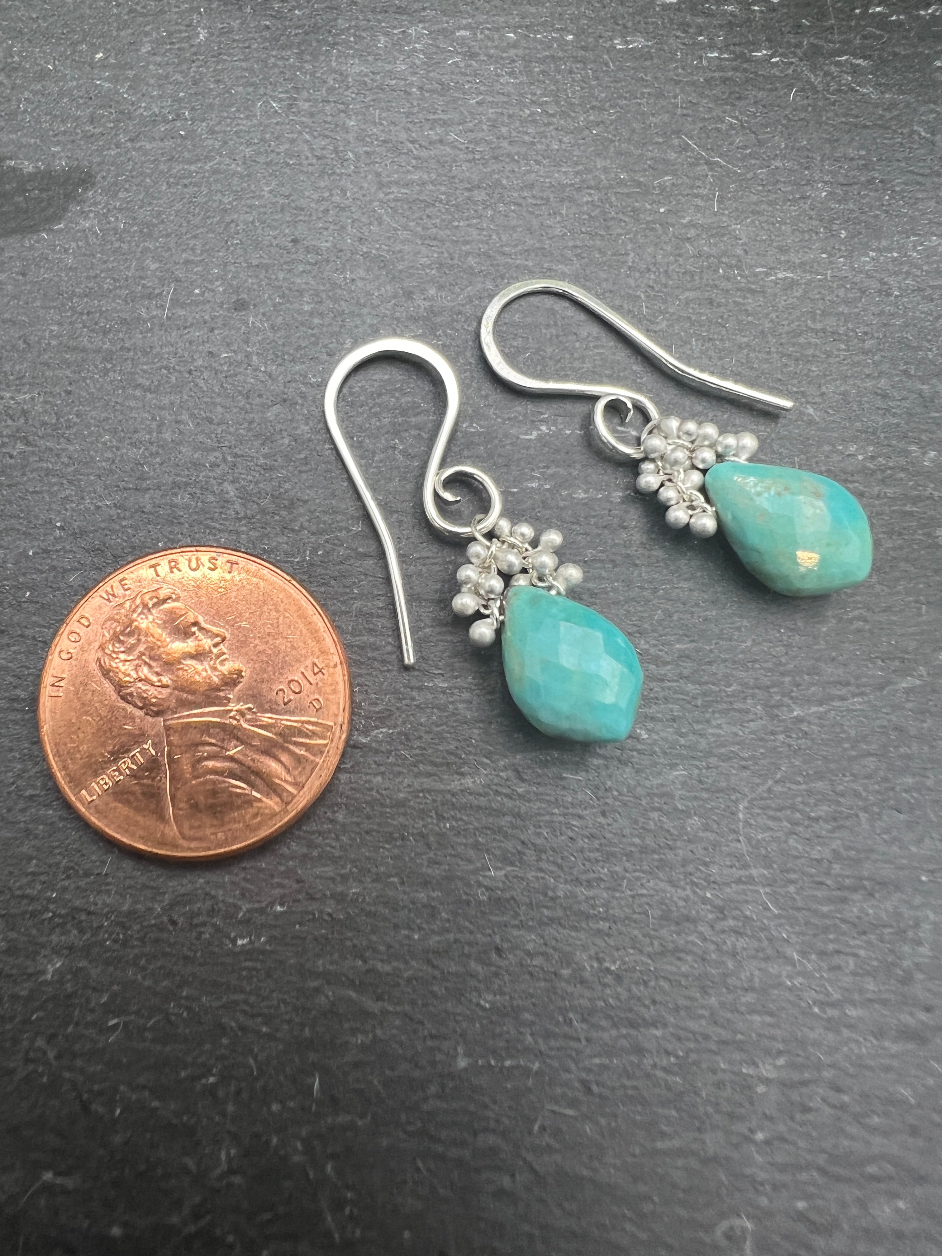 These dew drop shaped faceted turquoise shimmer and shine in any lighting, making these earrings an excellent addition for any occasion. A bright silver earring wire has been accented with beaded sterling silver. These earrings measure about 1" long.