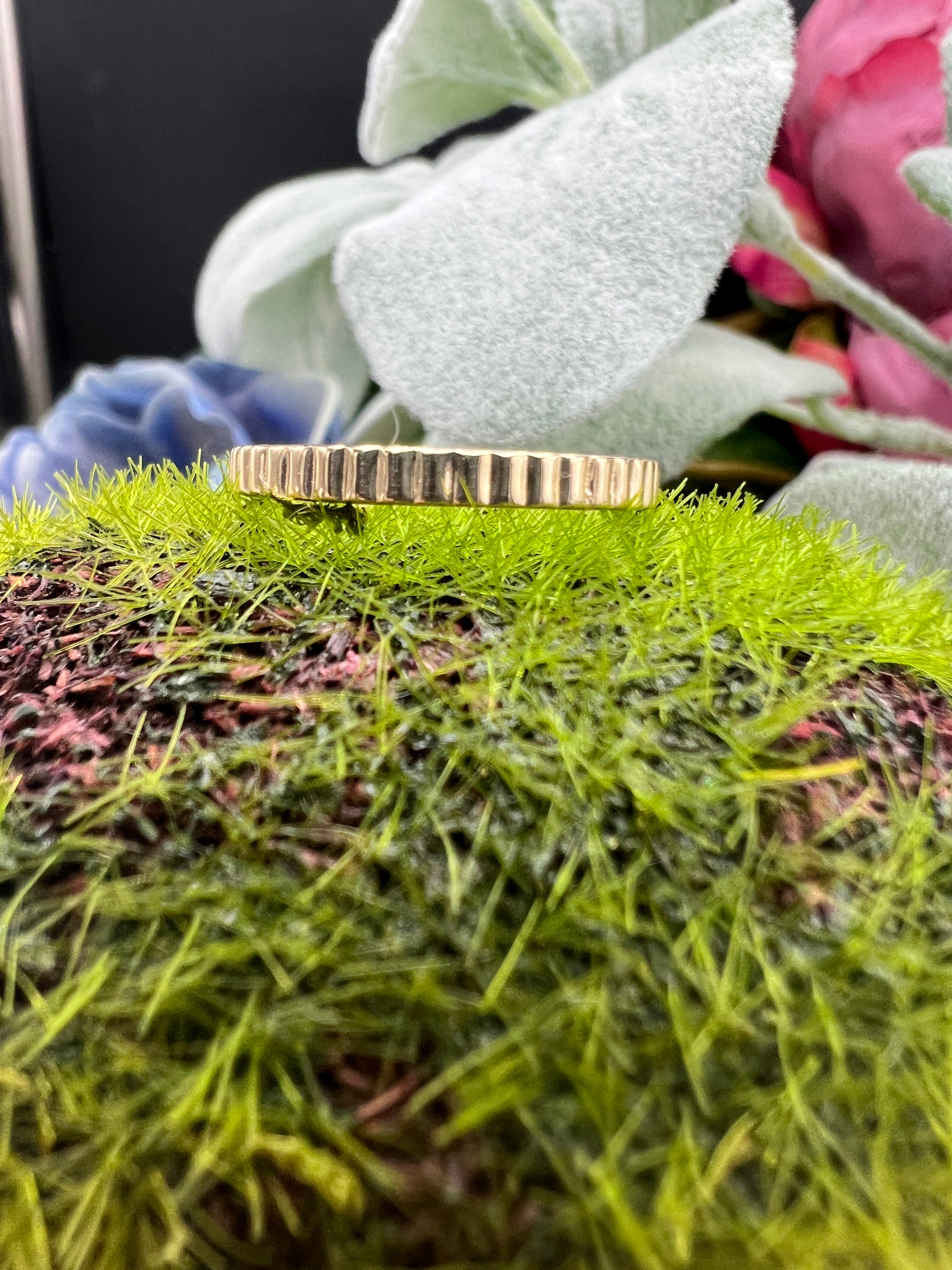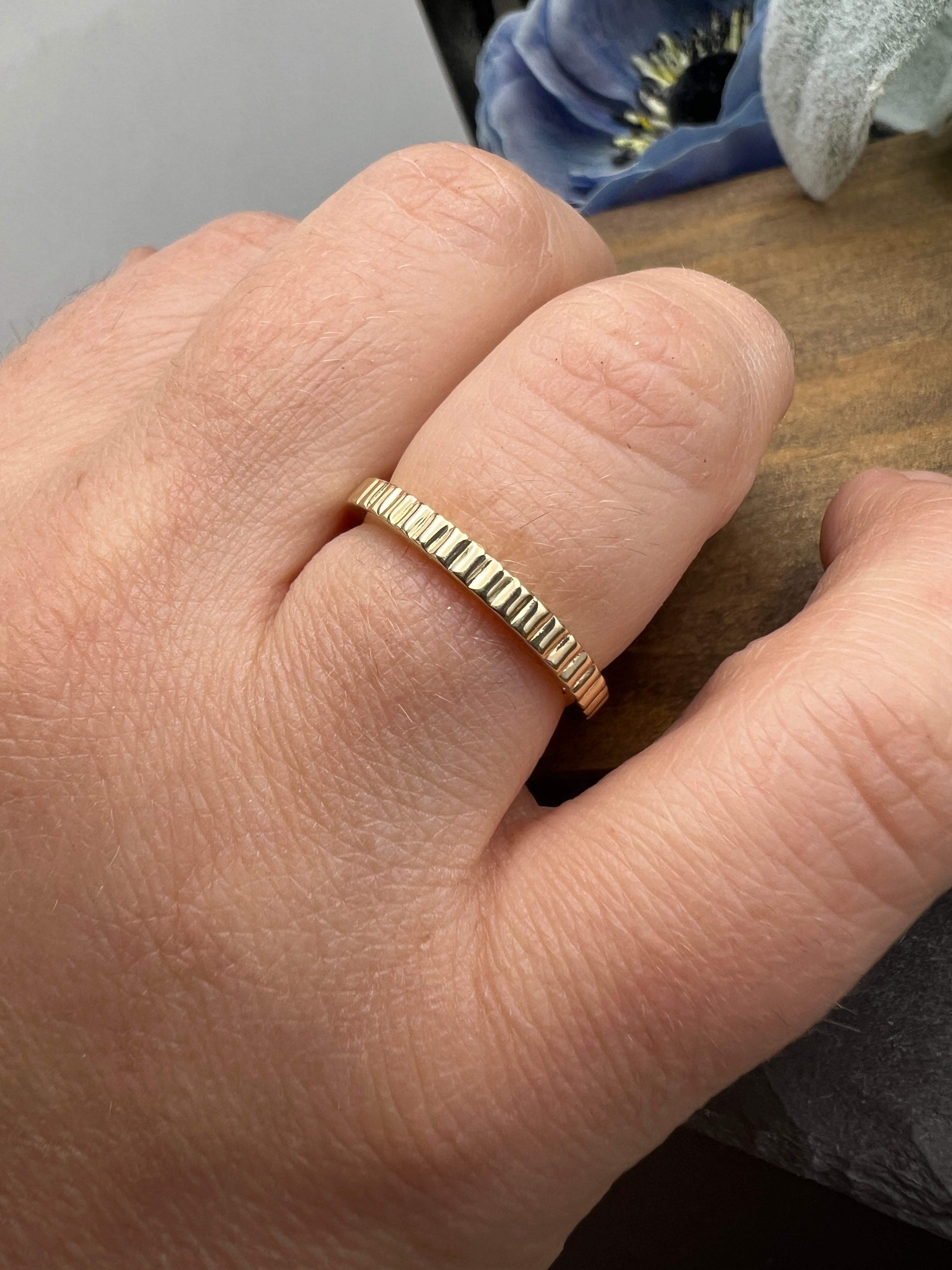 This 14k yellow gold 2mm band features a vertical ribbed texture all the way around the band This specific design can be ordered in different sizes and metals. This band is currently a size 6.