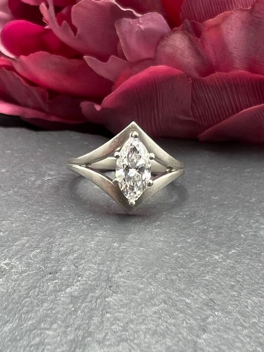 Simple, yet stunning, this gorgeous 14k white gold ring features a beautiful 1.04ct lab marquise diamond set in a split shank with a sandblasted finish. This ring is a size 6.5 and can be sized.