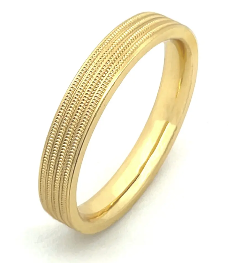 Delicate rows of milgrain run along the surface of this subtle yet bold ring. Available in numerous widths and materials so you can select your perfect custom combination. We will reach out requesting your ring size when we receive your order.