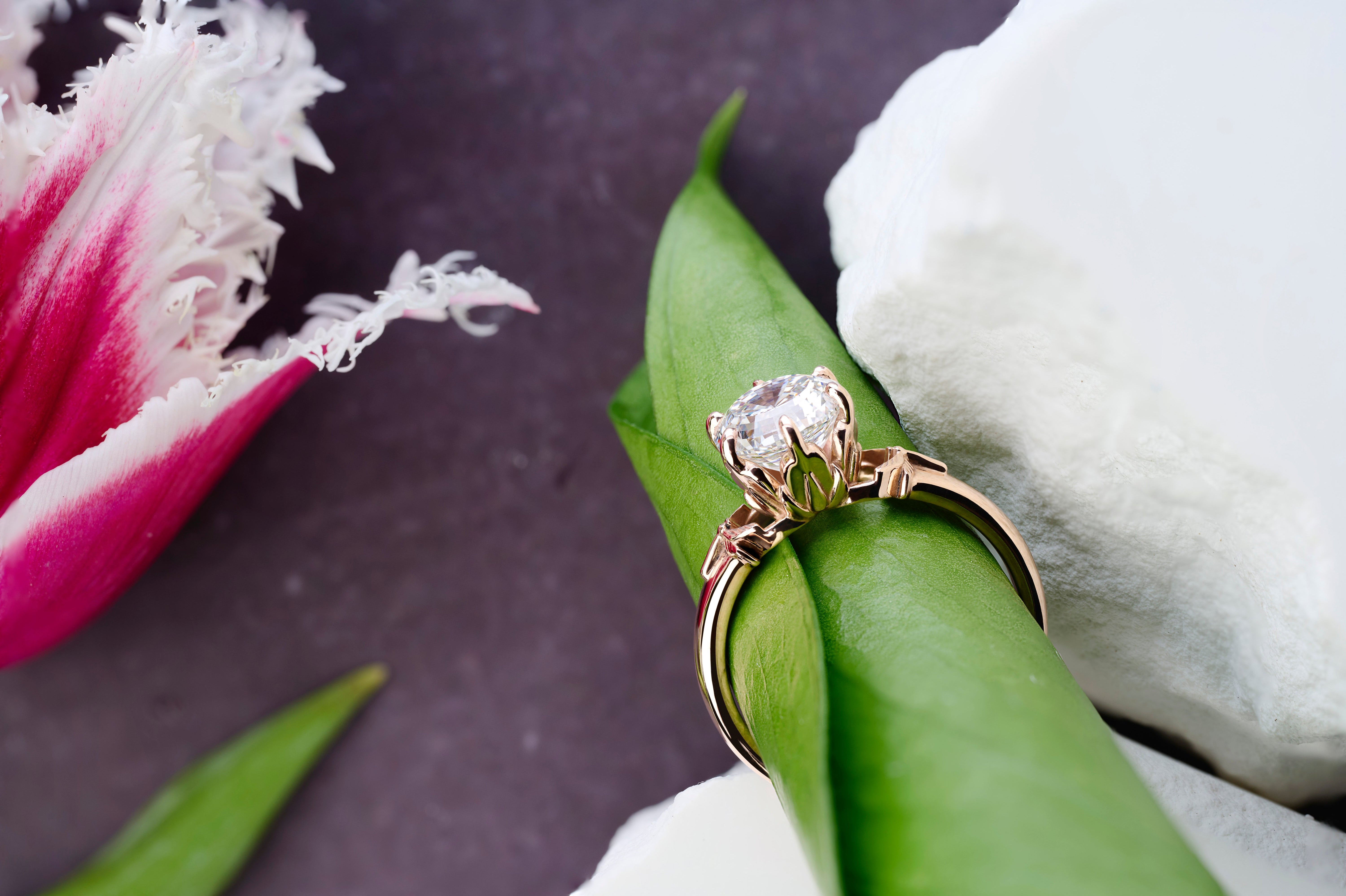 The moment a flower opens fully—that's Bloom. A lotus-inspired crown of petal prongs cradles a 2.17ct lab diamond in warm rose gold, creating a clean solitaire silhouette that reveals sculptural complexity underneath. The rose gold deepens the romantic warmth while the uniquely cut stone catches and returns every available light. Simple from a distance, intricate up close.