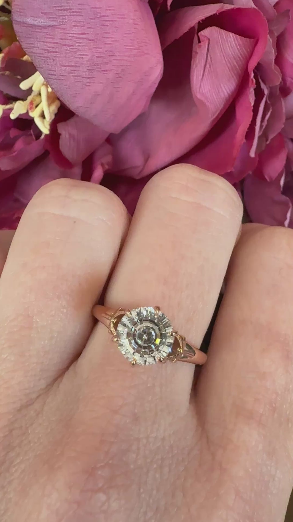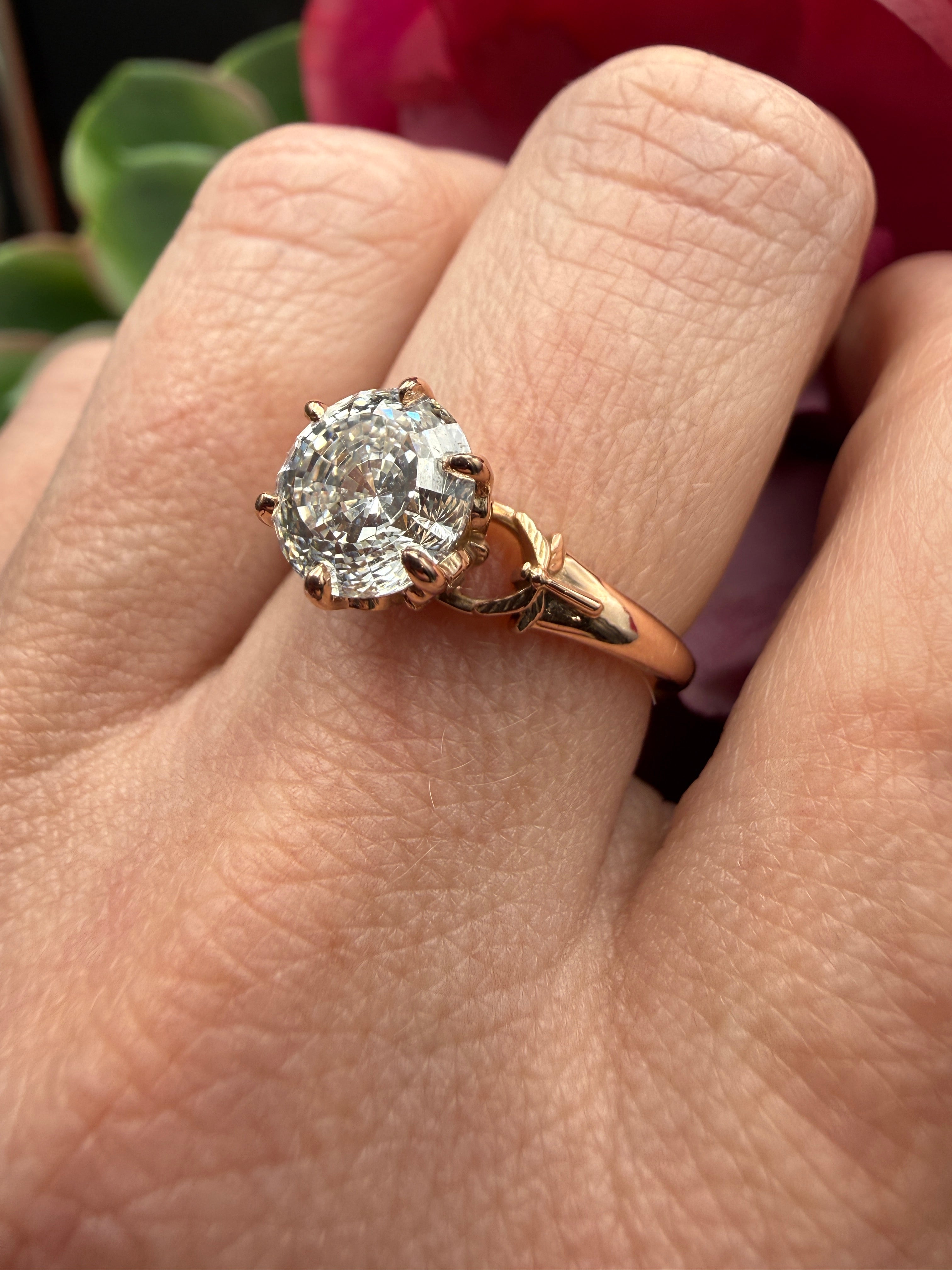 Metal: 14K rose gold Center Stone: 2.17ct F/VS1 round step-cut lab diamond Size: 7, but sizeable