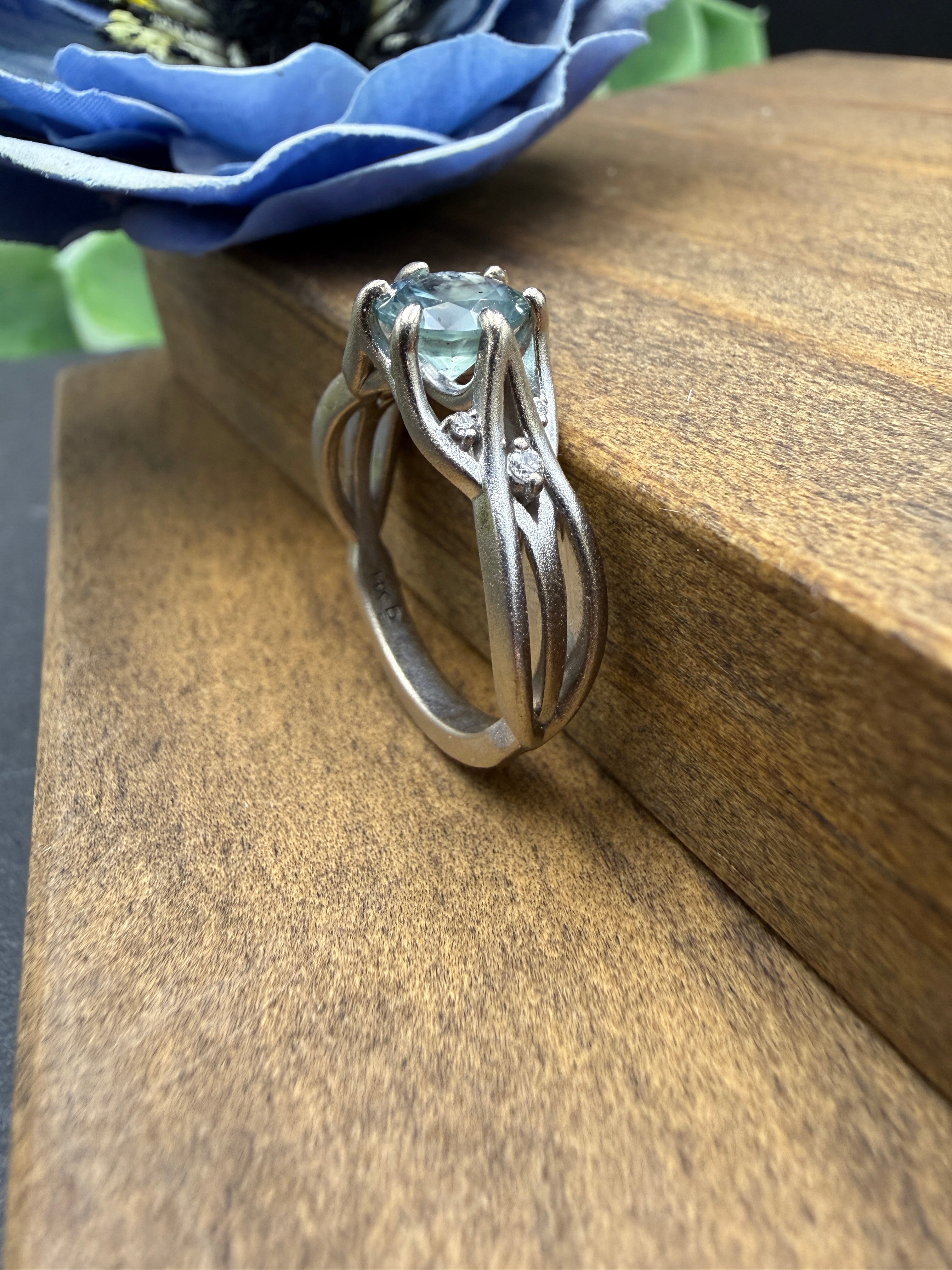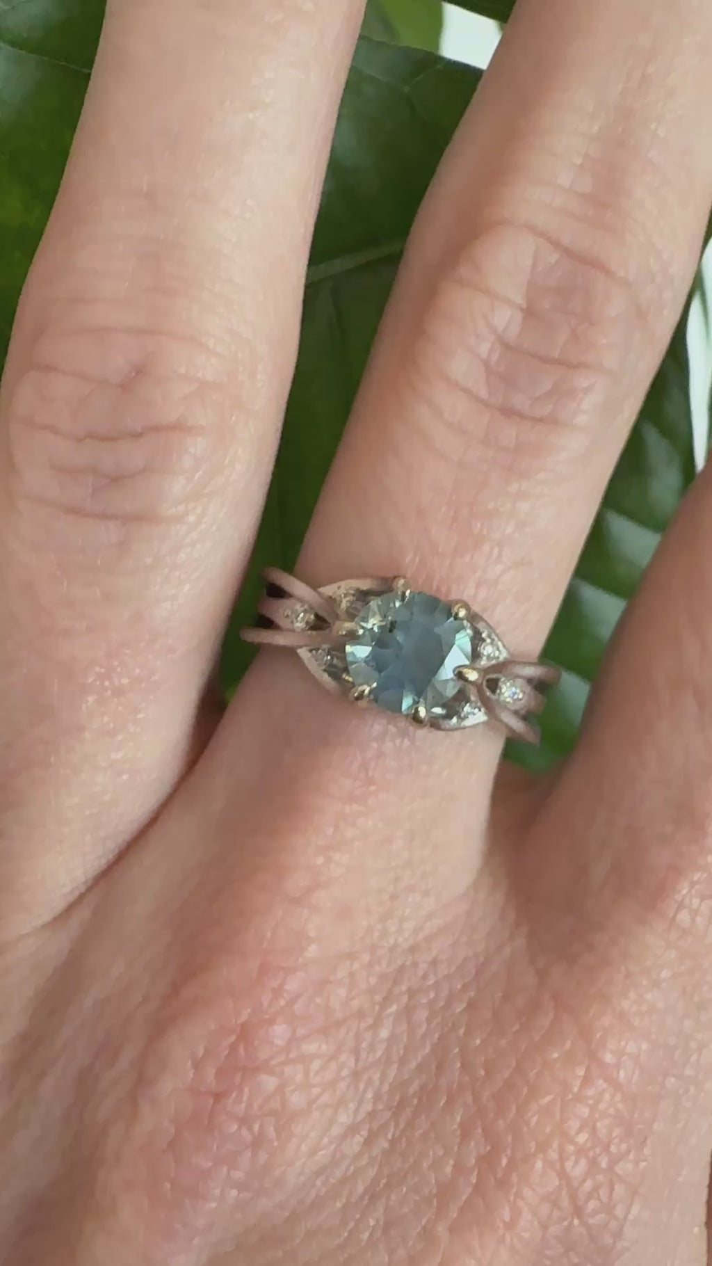 Metal: 14K palladium white gold Center Stone: 1.45ct Montana sapphire Accent Stones: .05ctw natural diamonds Size: 7, but sizeable