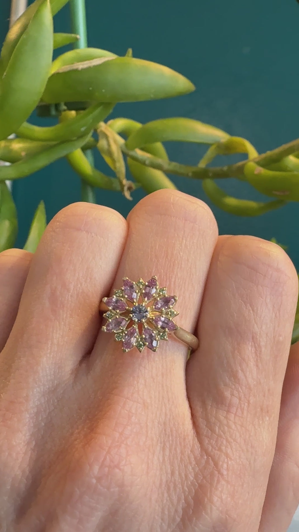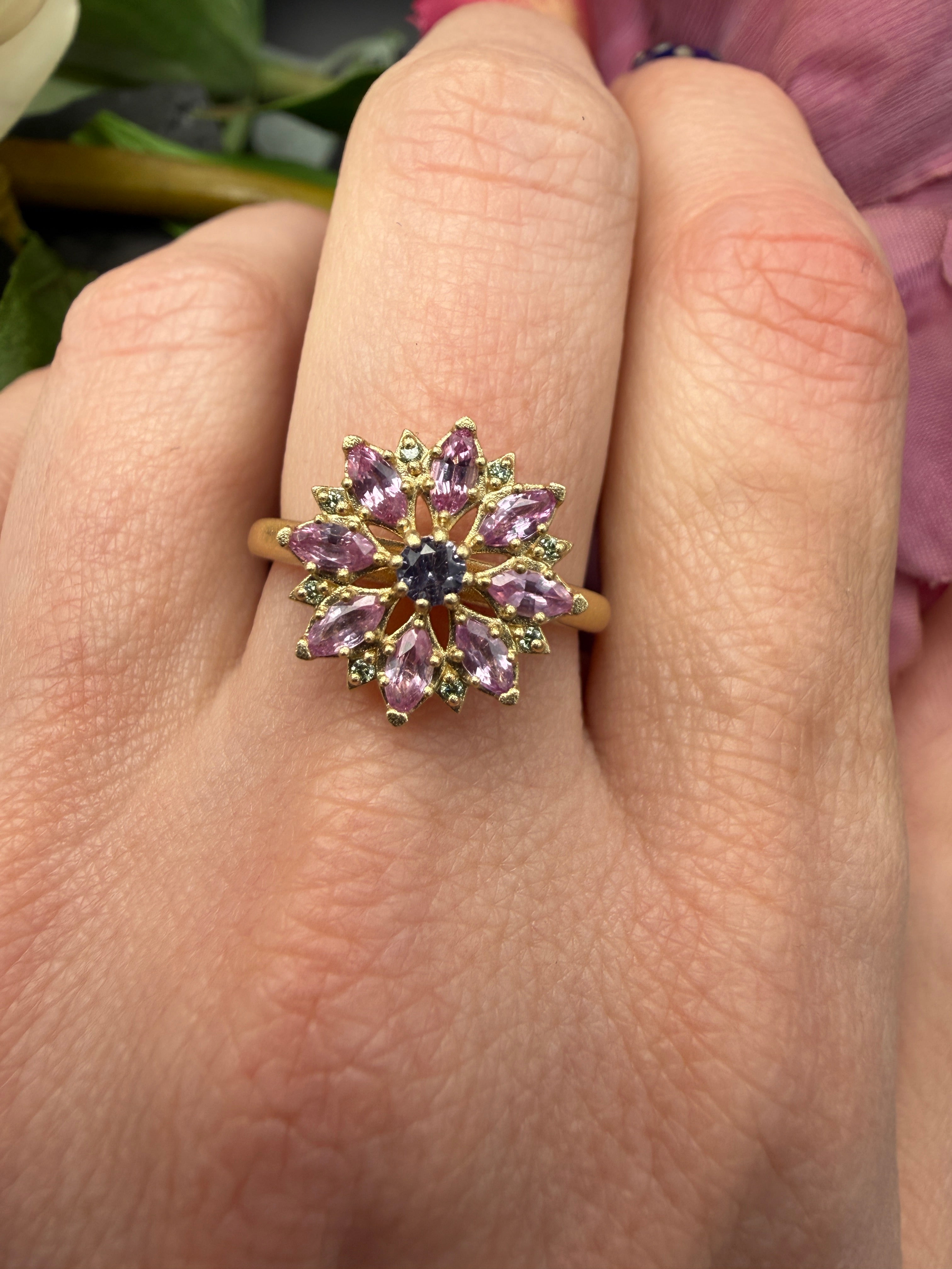 Named for both the delicate pink flower and the vast universe, Cosmos bridges earth and sky in a single bloom. Pink sapphires radiate from a central purple sapphire, accented with subtle green diamonds that catch the light like morning dew. The warm yellow gold setting cradles this botanical star-burst, creating a ring that celebrates the moment a flower reaches its peak and gestures toward something greater.