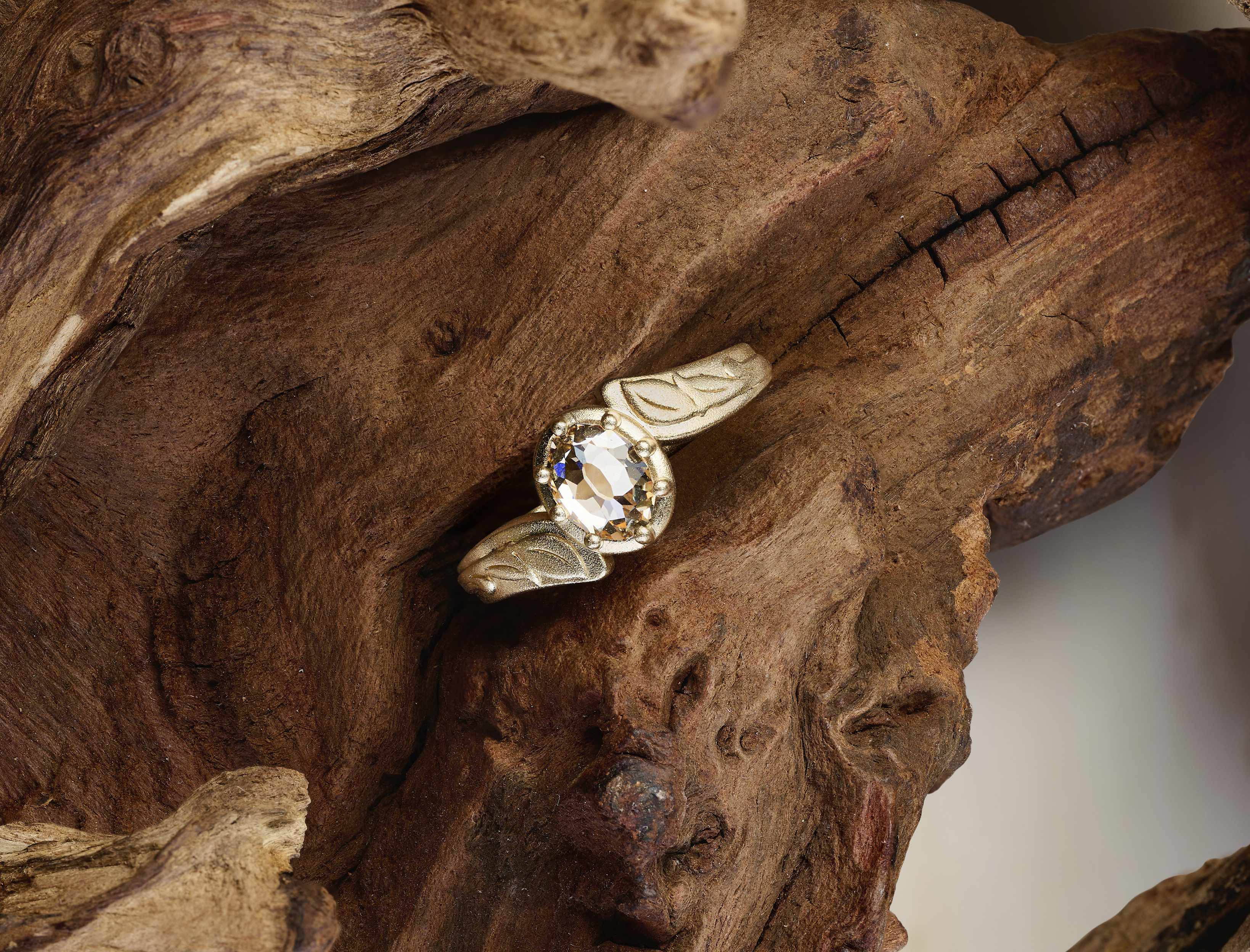 Late afternoon light through autumn leaves—that's the world Frond inhabits. A 1.12ct champagne Mughal diamond, an antique cut with decades of provenance, sits within a leaf-embellished band of warm yellow gold. The stone's natural warmth deepens against the golden setting, creating a ring that feels like golden hour made permanent. Graceful, aged, suffused with quiet warmth.