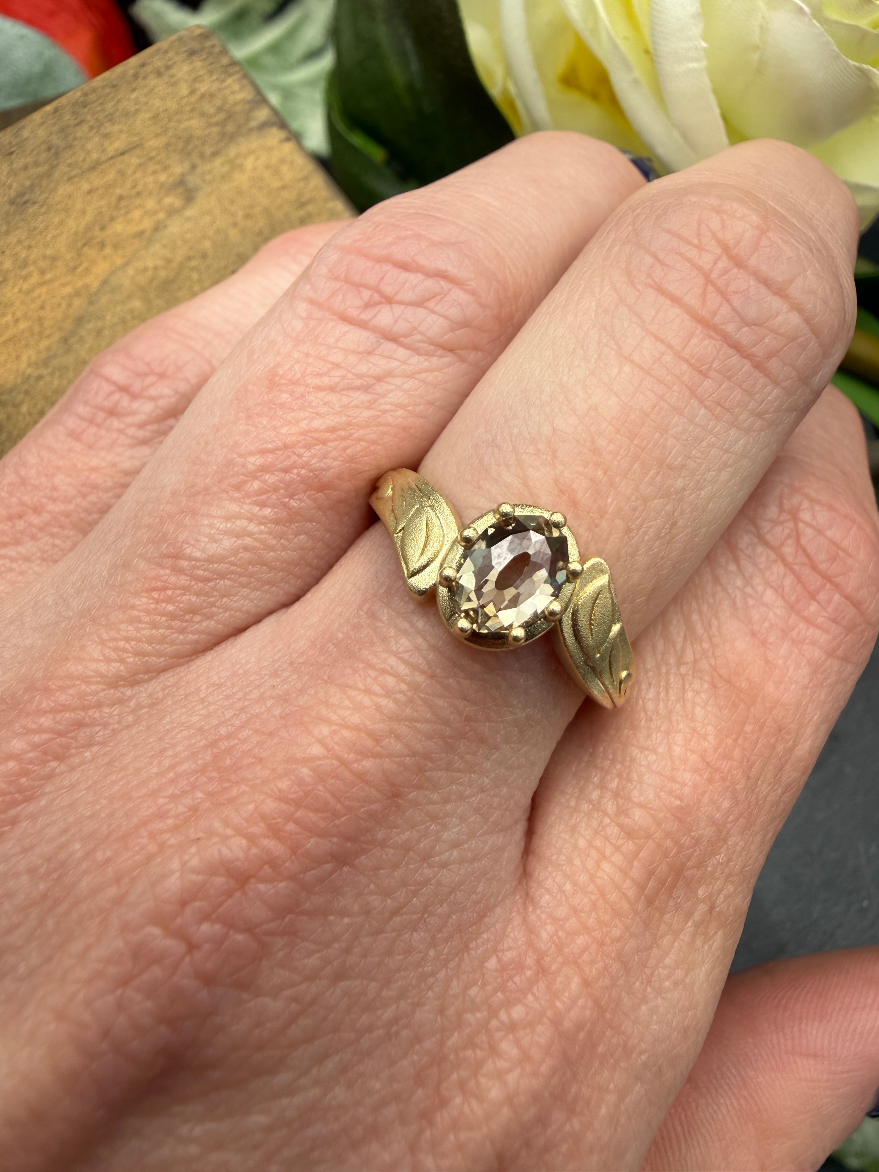 Metal: 14K yellow gold Center Stone: 1.12ct champagne oval Mughal diamond Size: 7, but sizeable