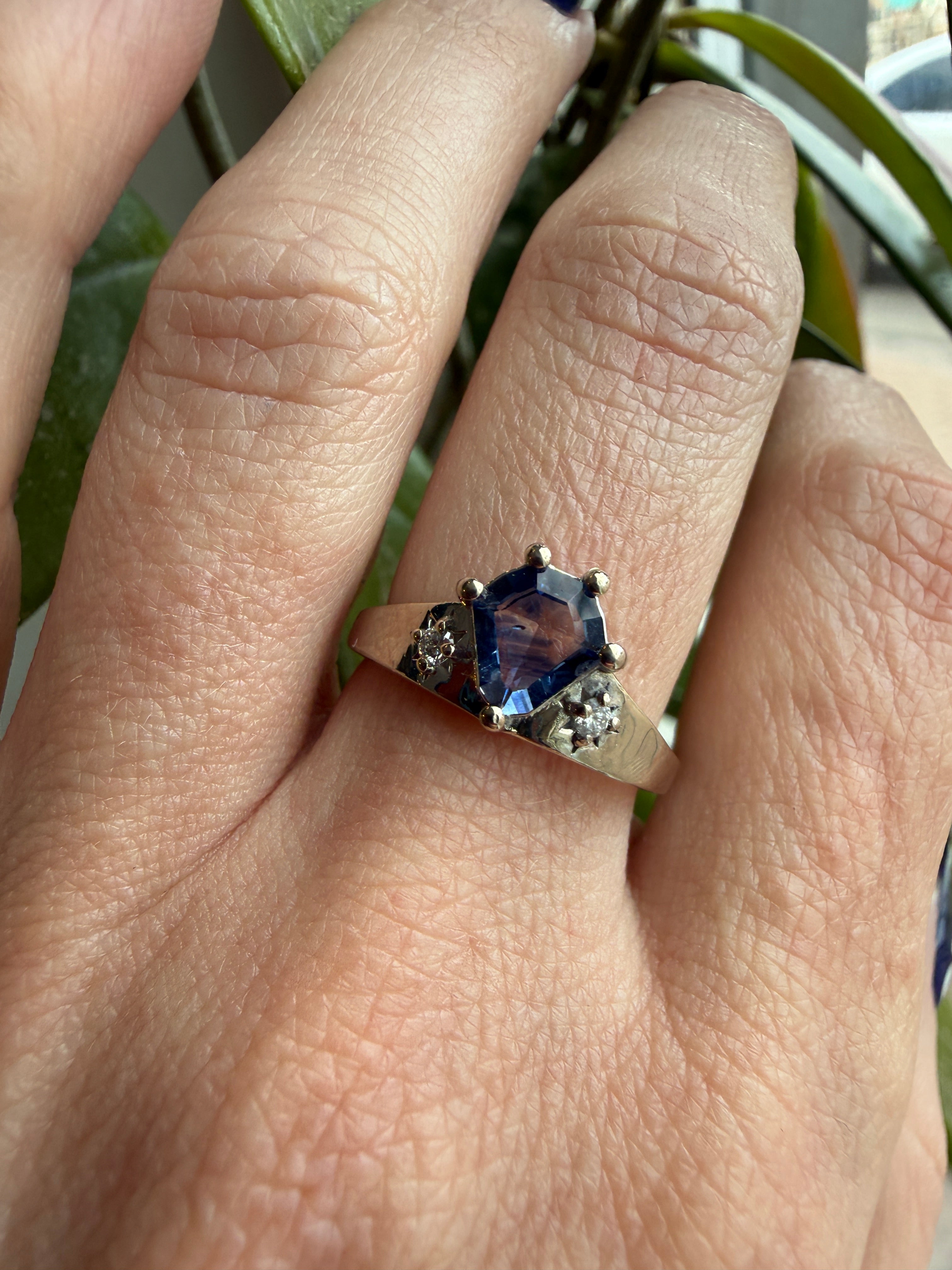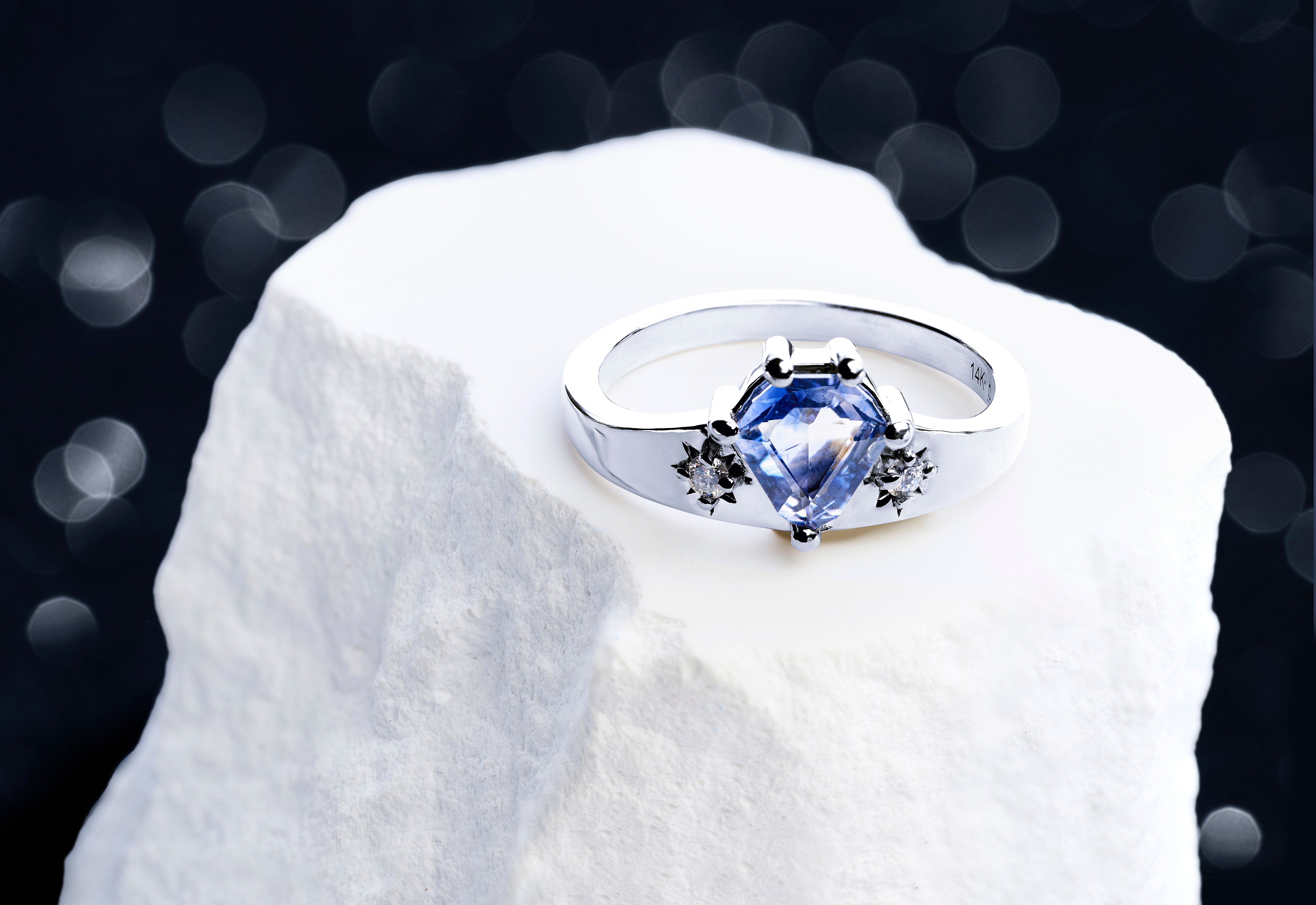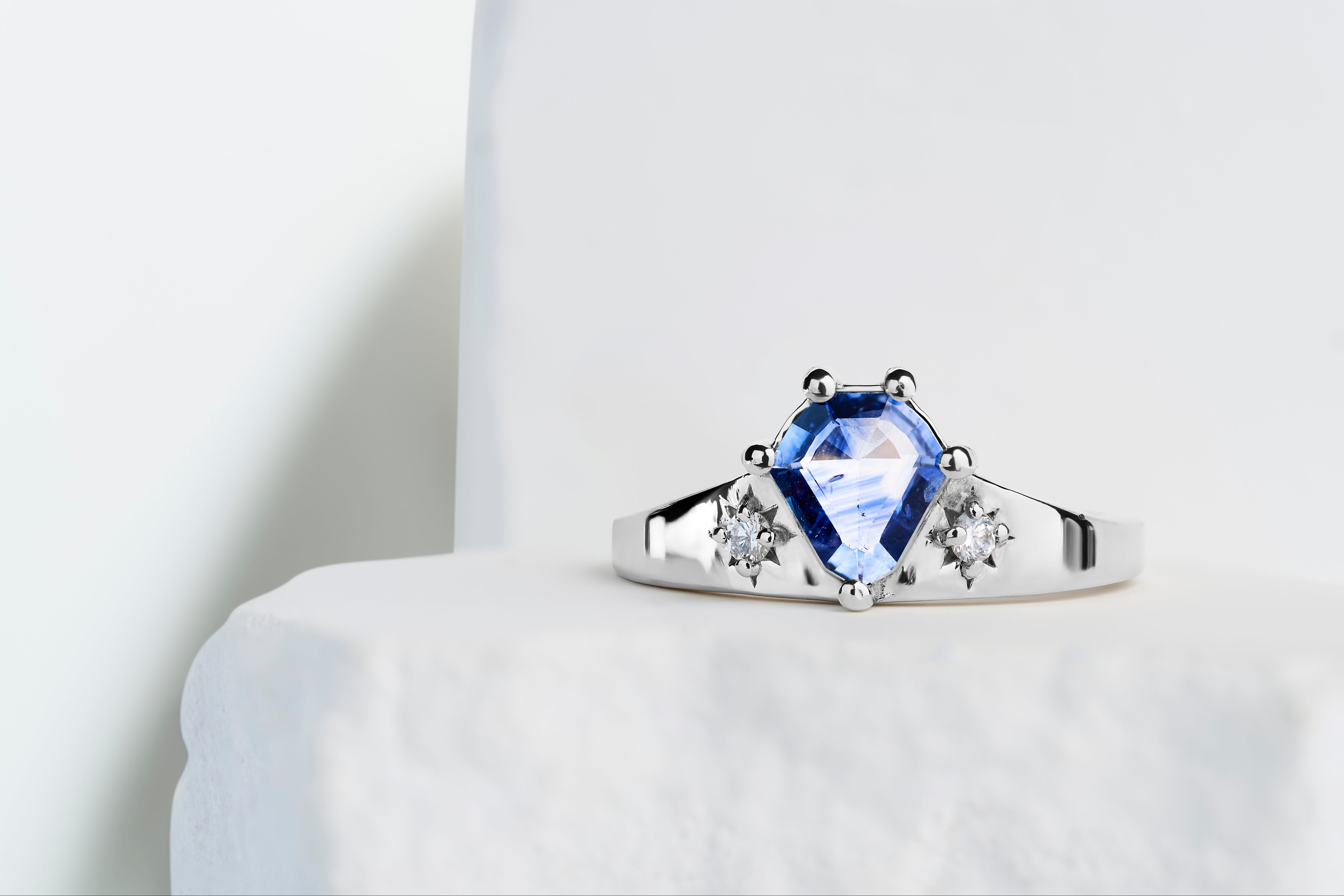 The day's last light fades into twilight. Nocturne captures that threshold moment with a bi-color Sri Lankan sapphire flanked by star-burst diamond details. The geometric precision of the white gold setting frames the shield cut center stone, while delicate diamond accents evoke the first stars appearing in the evening sky. Clean lines and celestial inspiration create a ring that's both architectural and serene.
