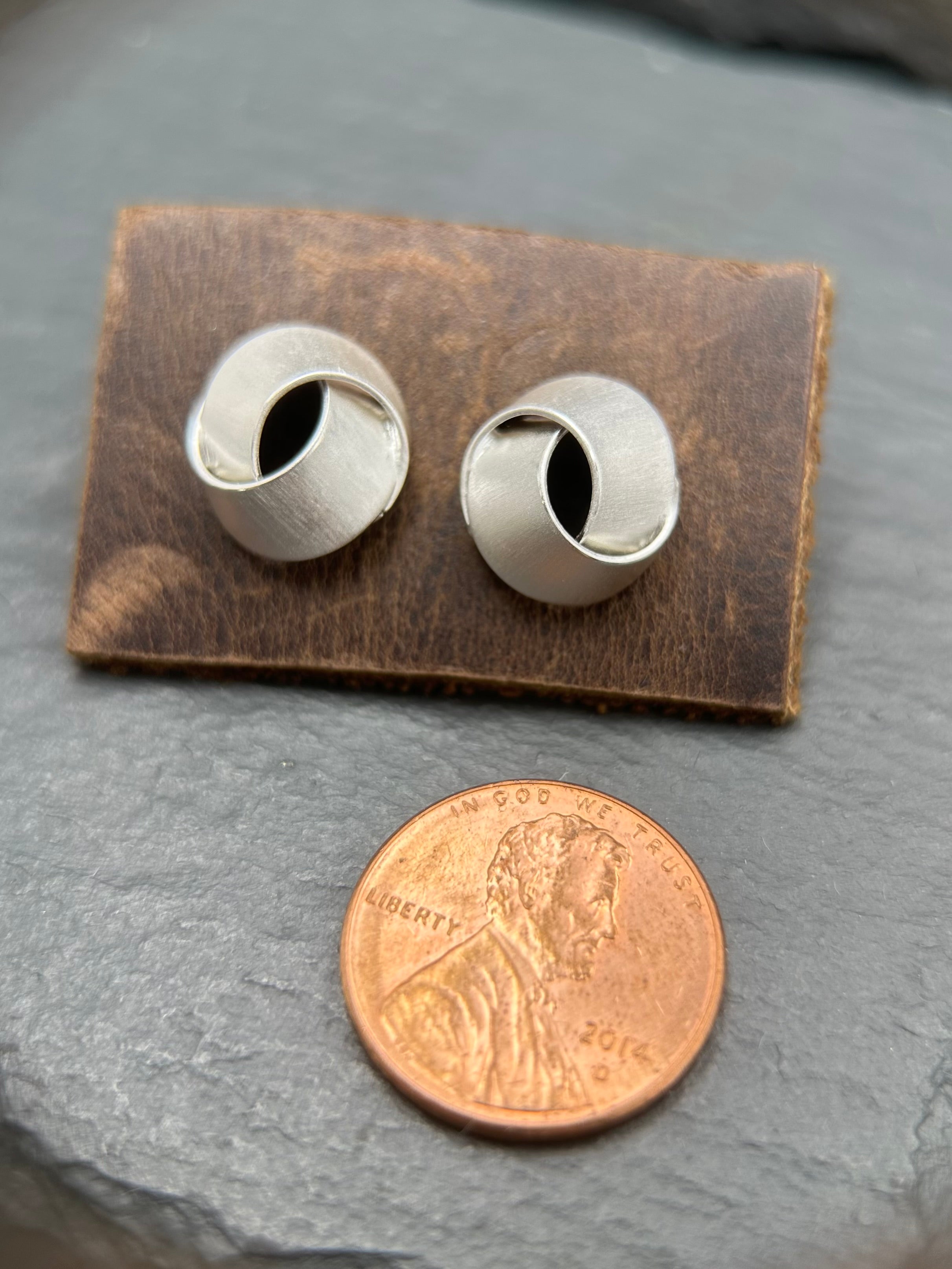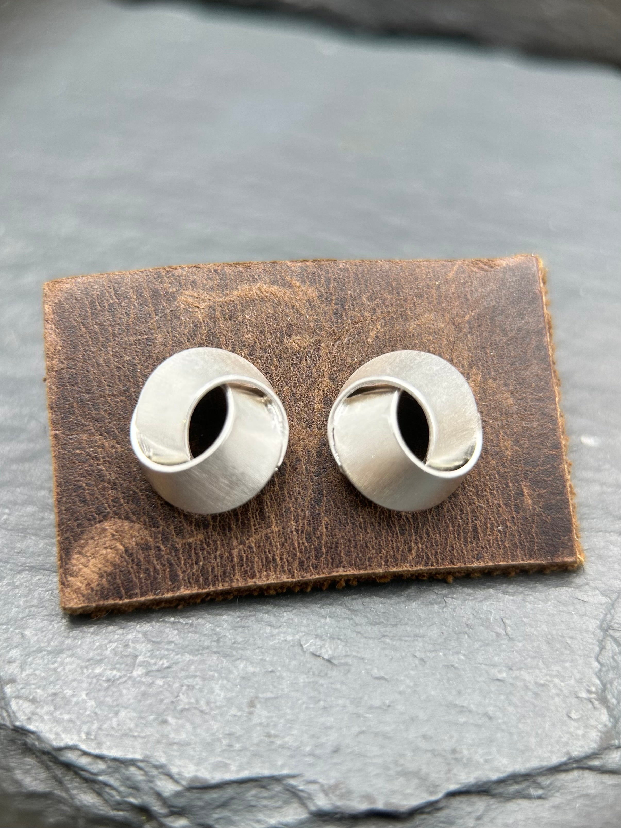 These sterling silver ear studs feature wide ribbon loops. These measure about a half inch across.