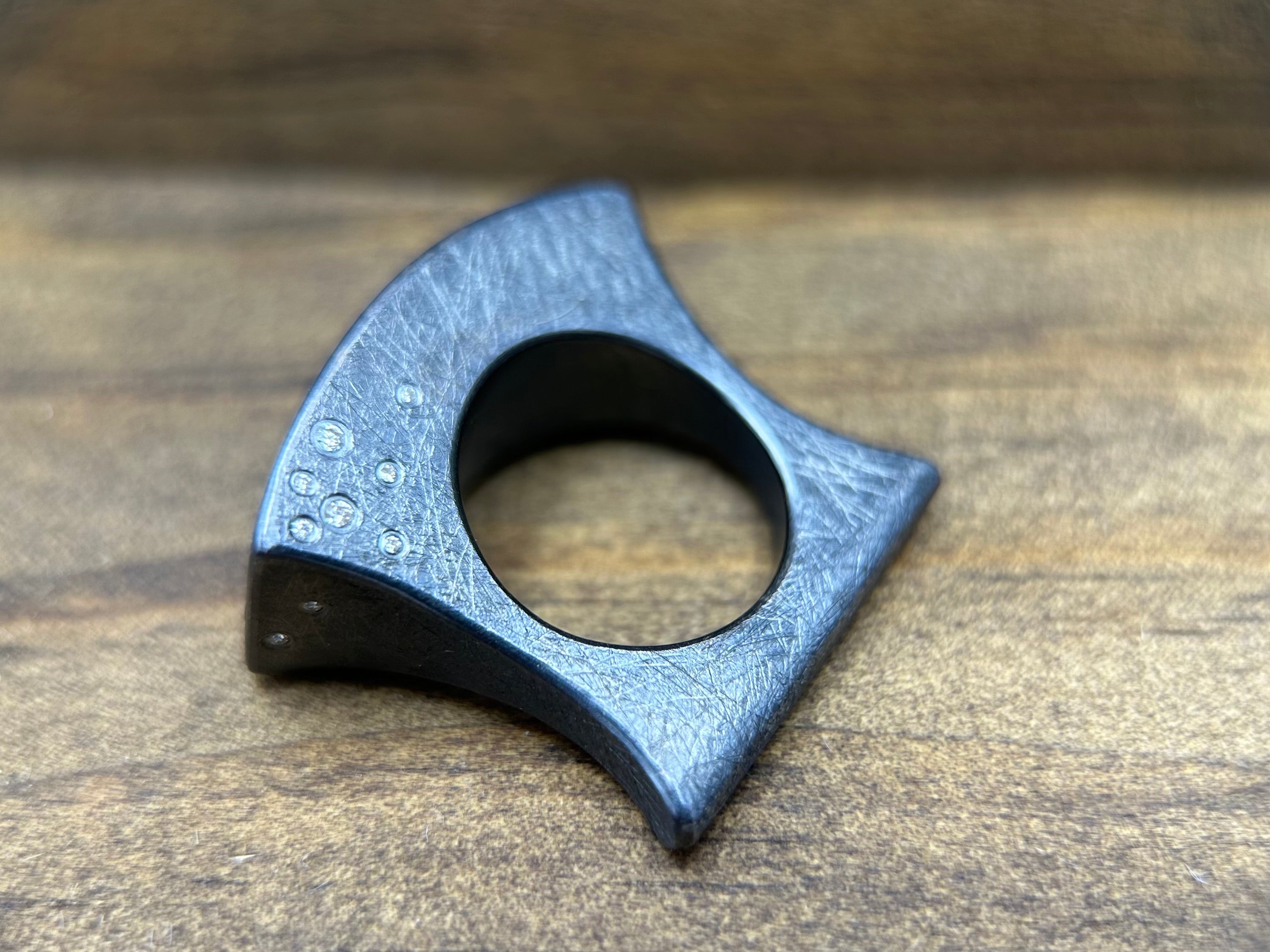 This oxidized silver ring is a structural wonder, with a unique flared top, and squared bottom to the ring. This ring features 38 white diamonds (0.33ctw), and a scratch texture for visual interest.