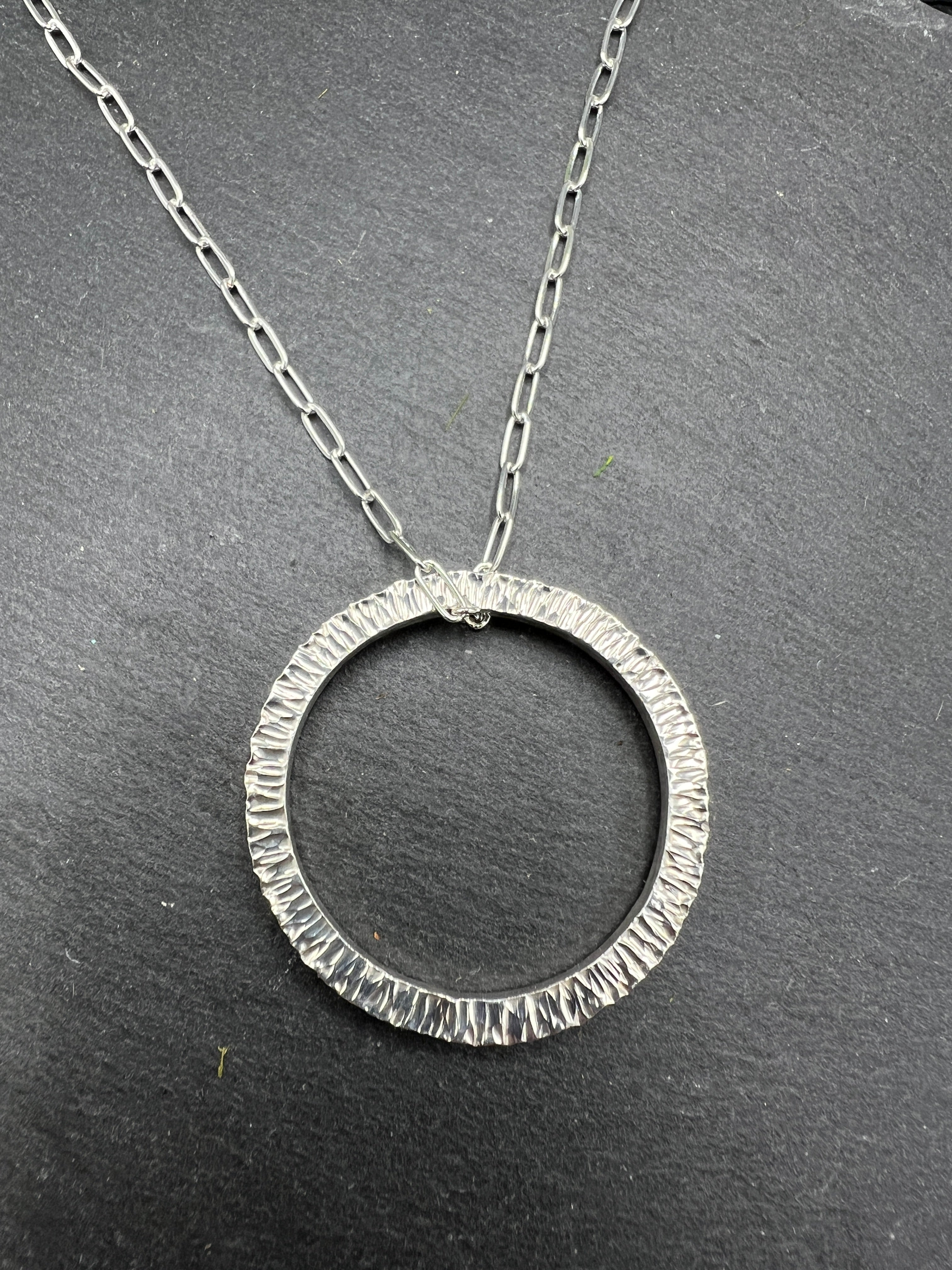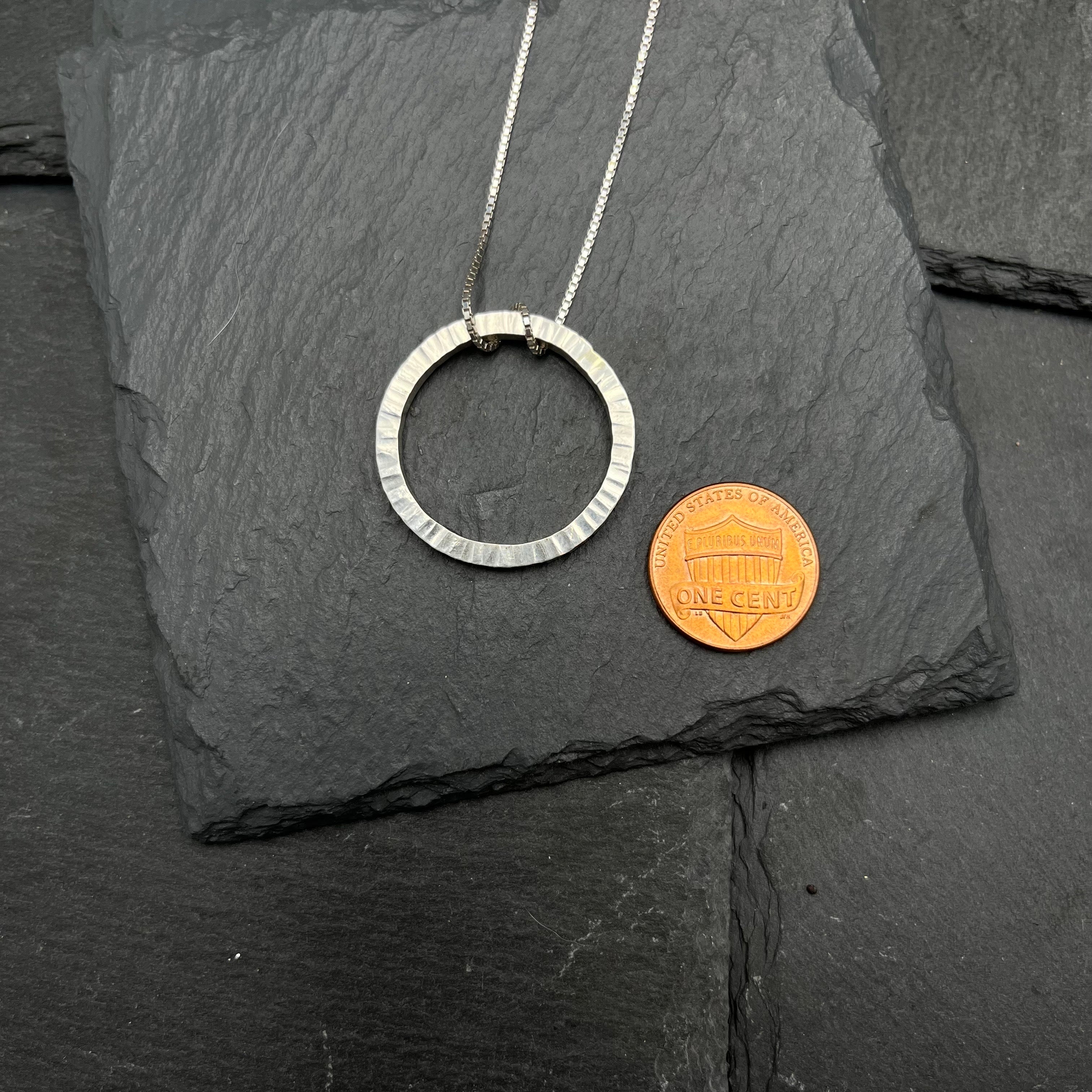 A minimal hammered sterling silver circle hangs on an 18 inch sterling silver chain. Chain may vary. Pendant measures 1.5 inches in diameter.