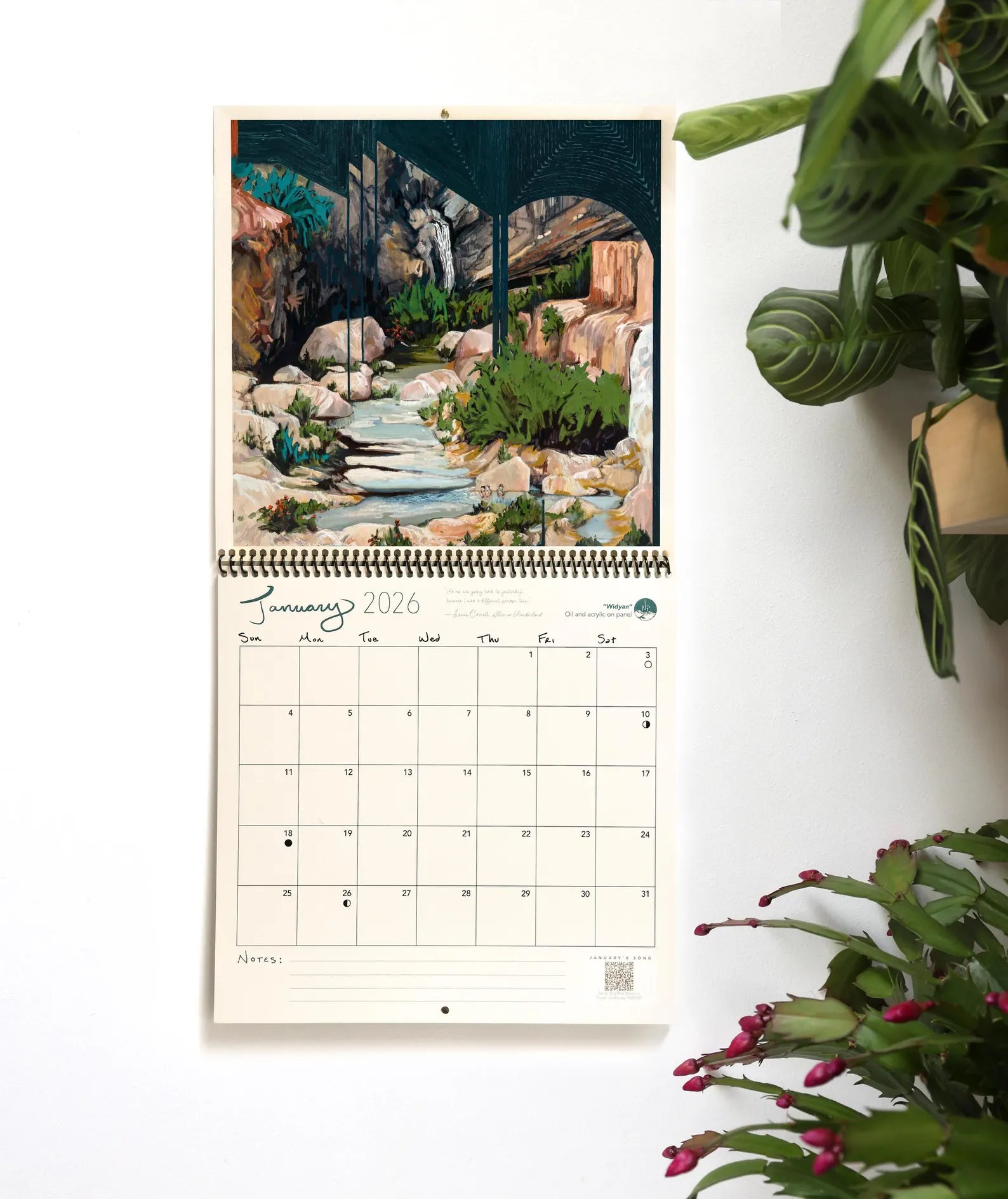 “This calendar is a compilation of reflections on the dreamlike haze we seem to be collectively moving through. Each month’s painting is paired with a Lewis Carroll quote reflecting the strangeness of our times, and a song chosen for the mood each season brings. As we look to 2026, may these images remind us to stay curious, question what we see, and choose to guide this shifting reality toward something hopeful.”