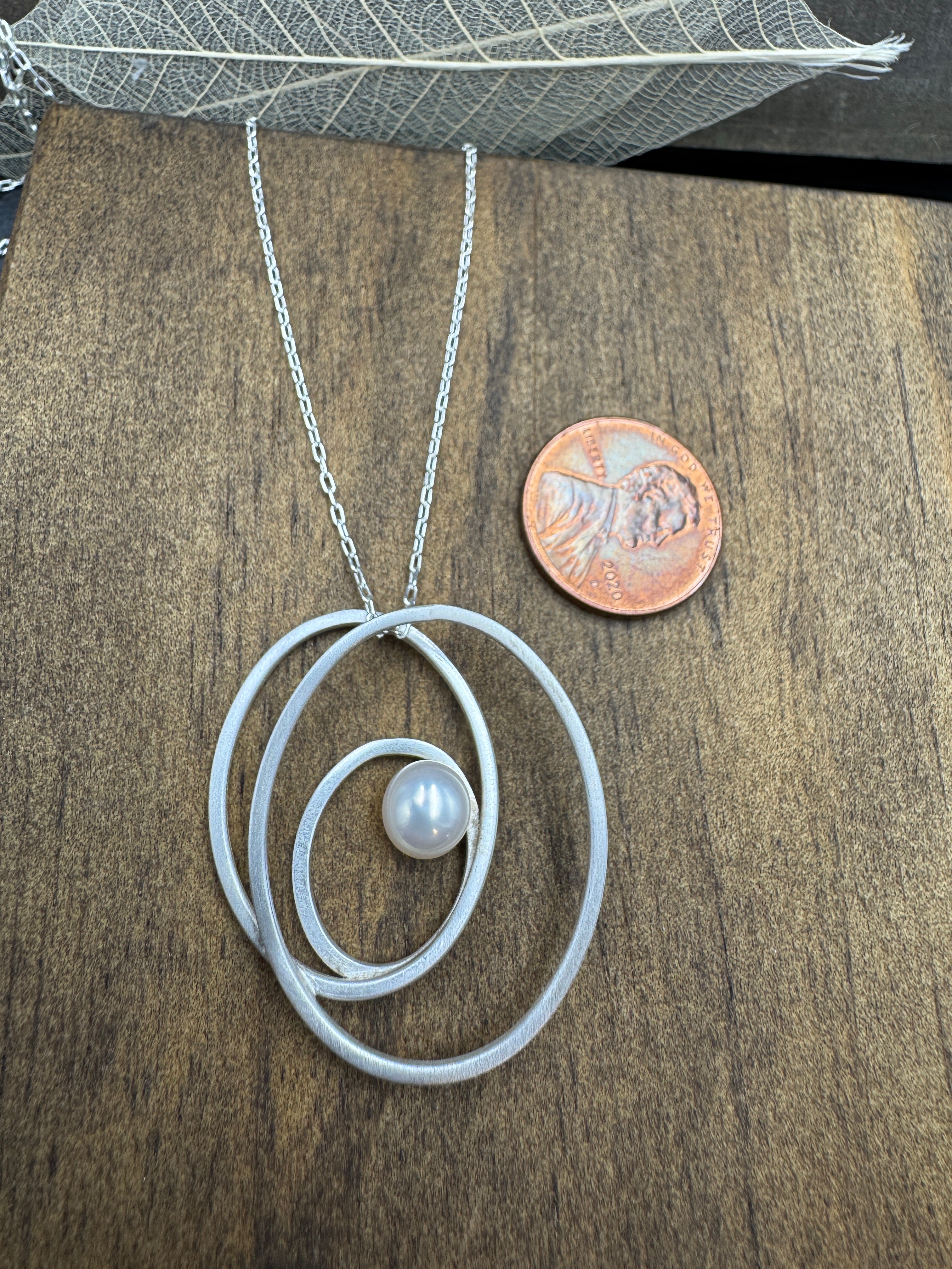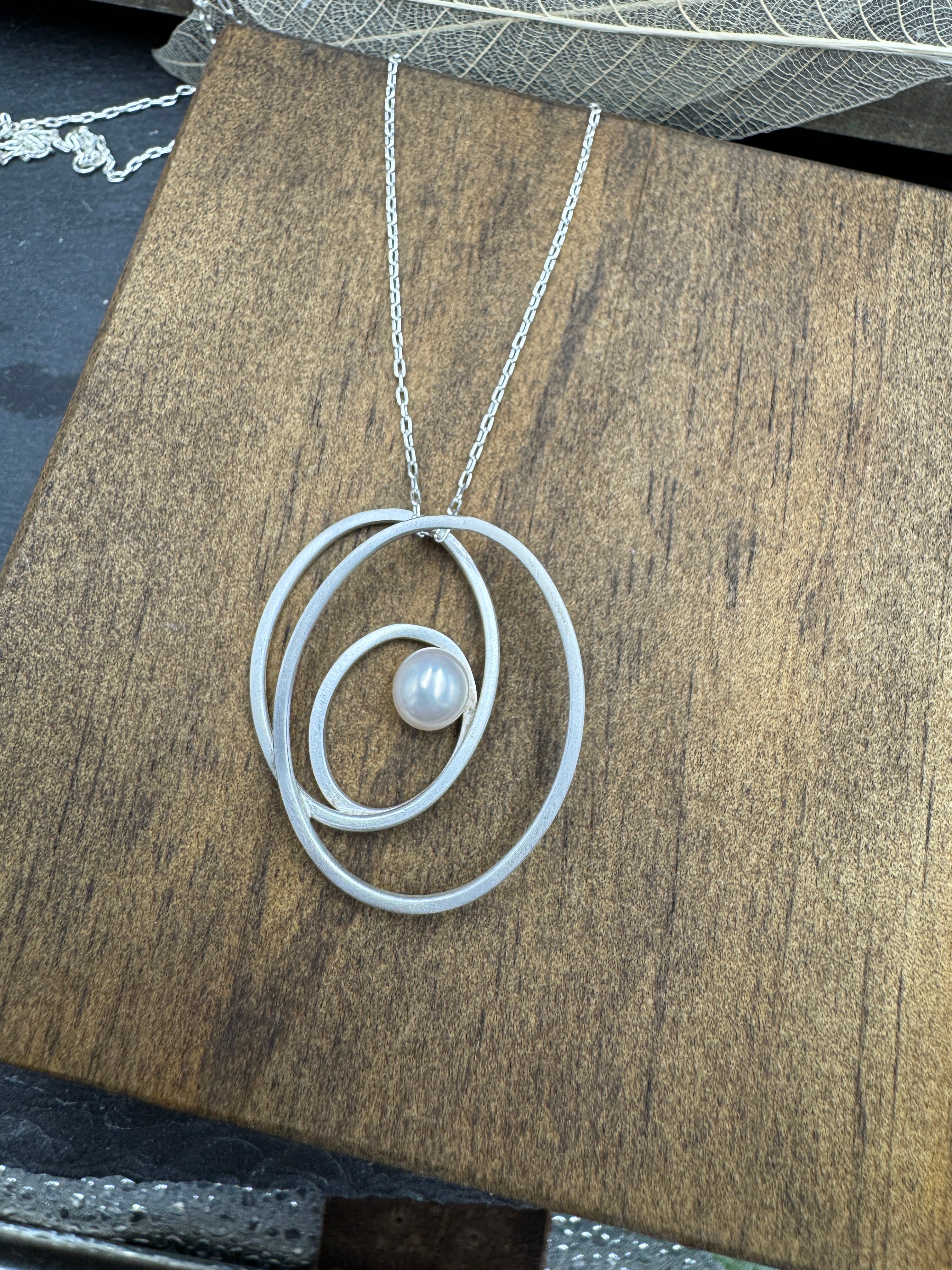 Three ovals of brushed sterling silver come together to emphasize a perfect freshwater pearl that seems to float inside the pendant. Pendant hangs from an 17 inch sterling silver chain.