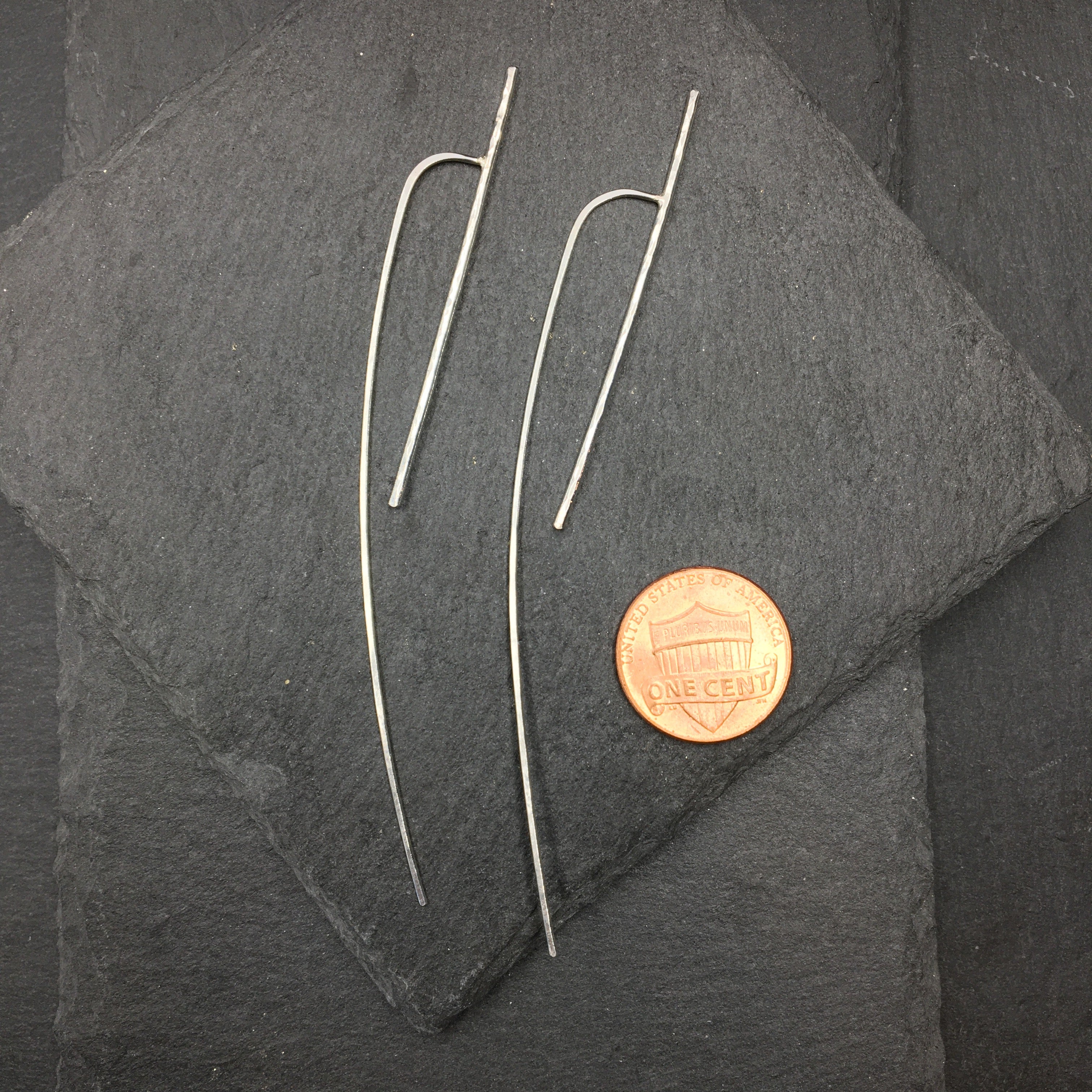 Simple hammered bars thread through the ear with a long and elegant hand-forged wire. These extra long version of the Bar Slide earrings are made in sterling silver and are about 3" long.