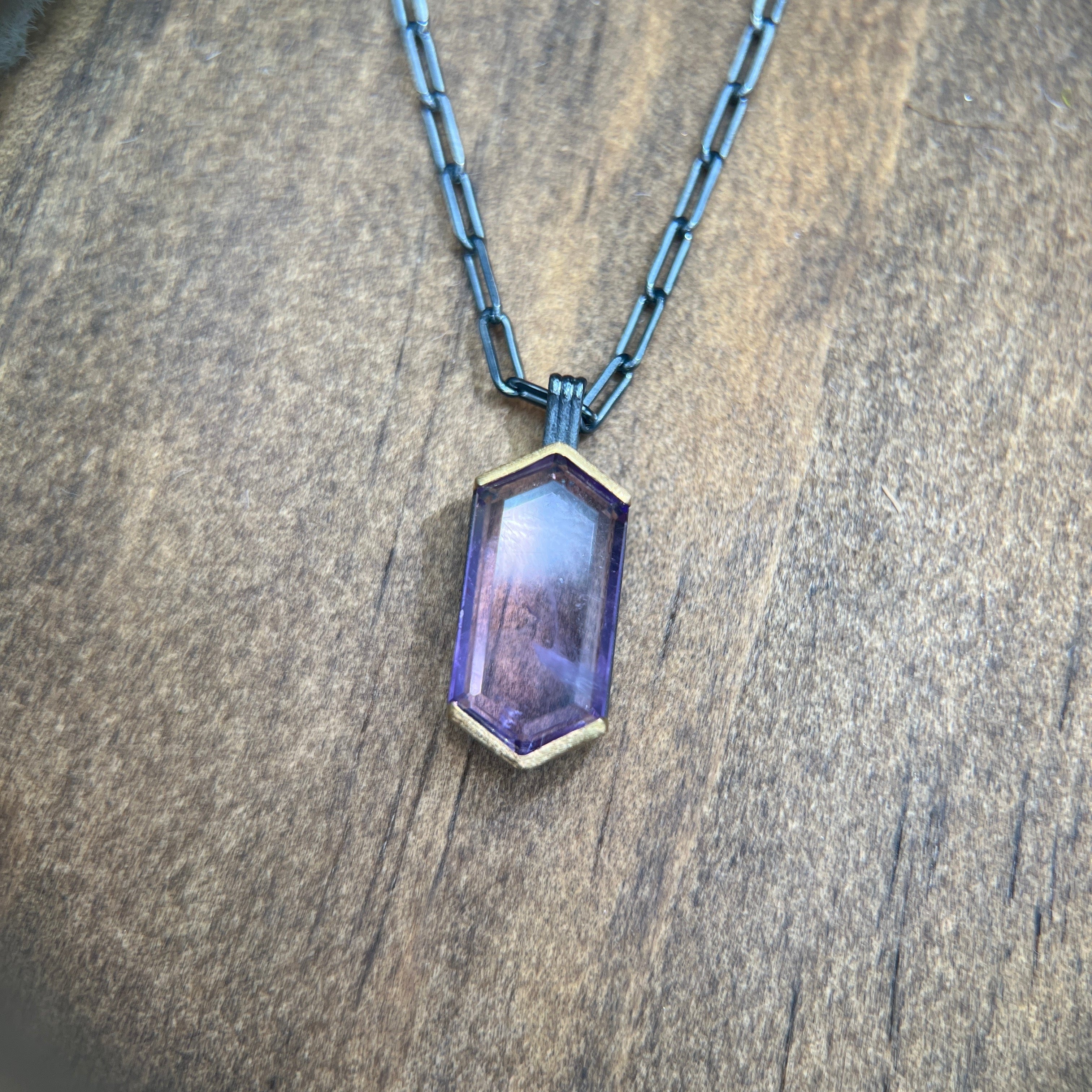 A lovely, light lavender amethyst tablet is the star of the show in this elegant pendant. The elongated hexagon stone is set in a partial 18k yellow gold bezel with an oxidized silver base and bail. The stone pendant measures 20mm long and glides on an oxidized silver paperclip style chain measuring 16" long.