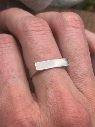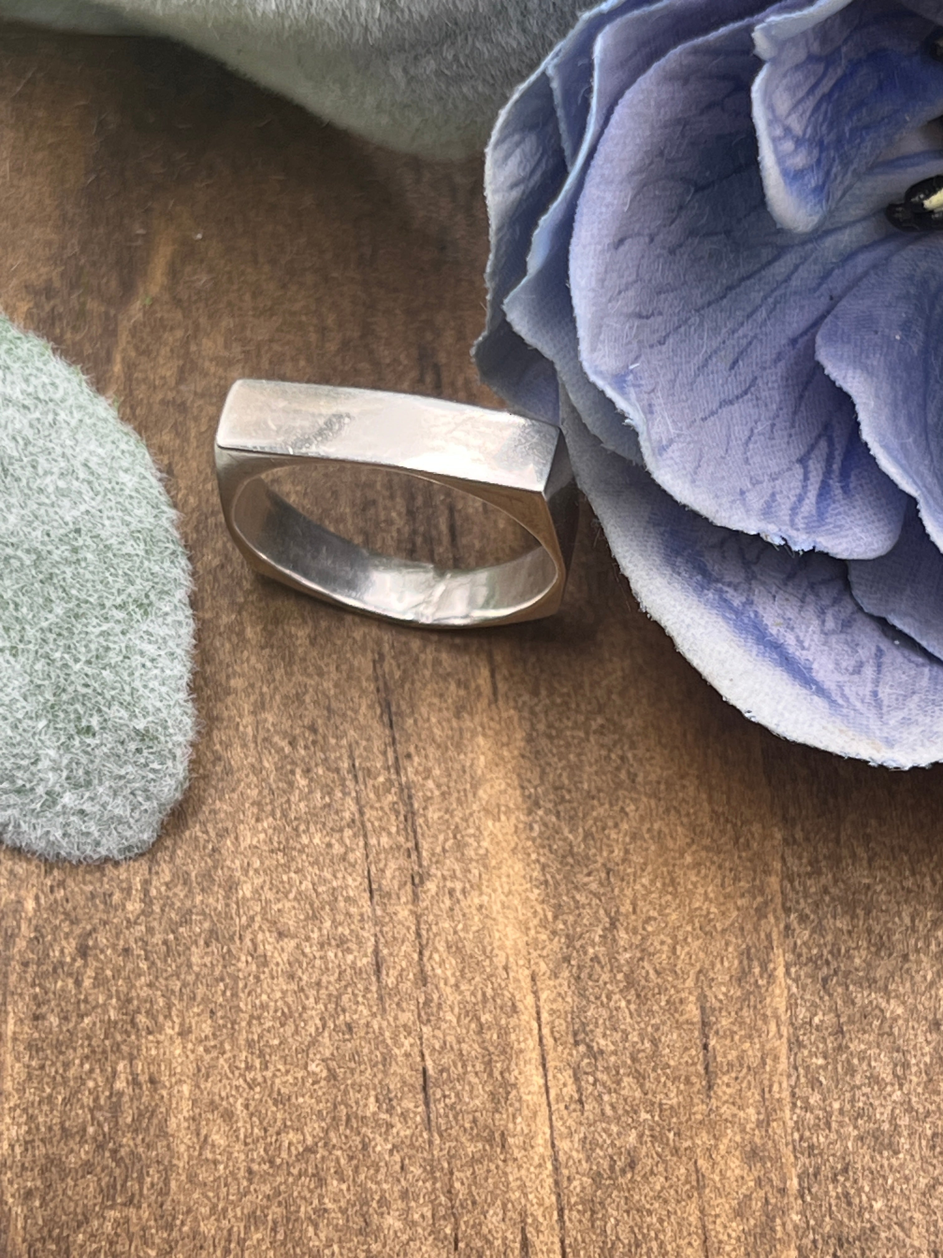 This contemporary rectangular ring made in sterling silver in a perfectly elegant and bold piece. This ring is currently a size 7, but can be resized on request. The top of the ring measures 0.5" across.