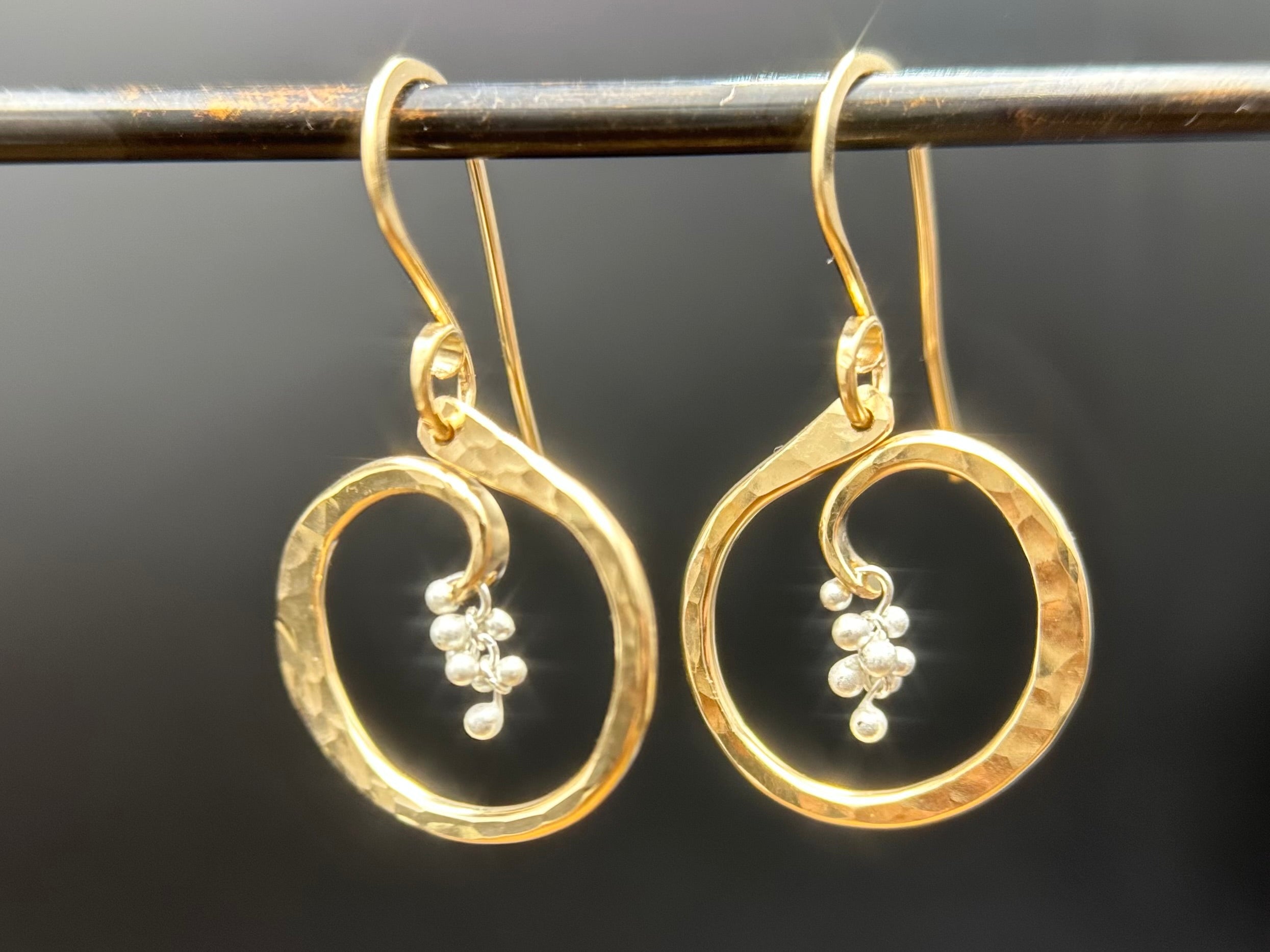Swirls of hand forged yellow gold filled wire are adorned with sterling silver accents. These earrings are just about 1 inch in length and rest on the ear with a gold-filled elegant earring wire.