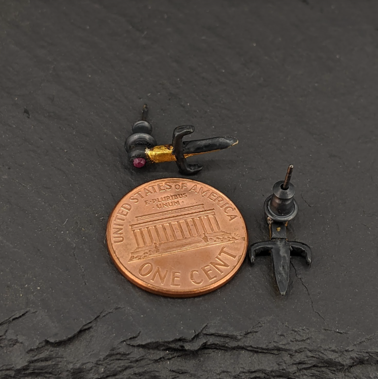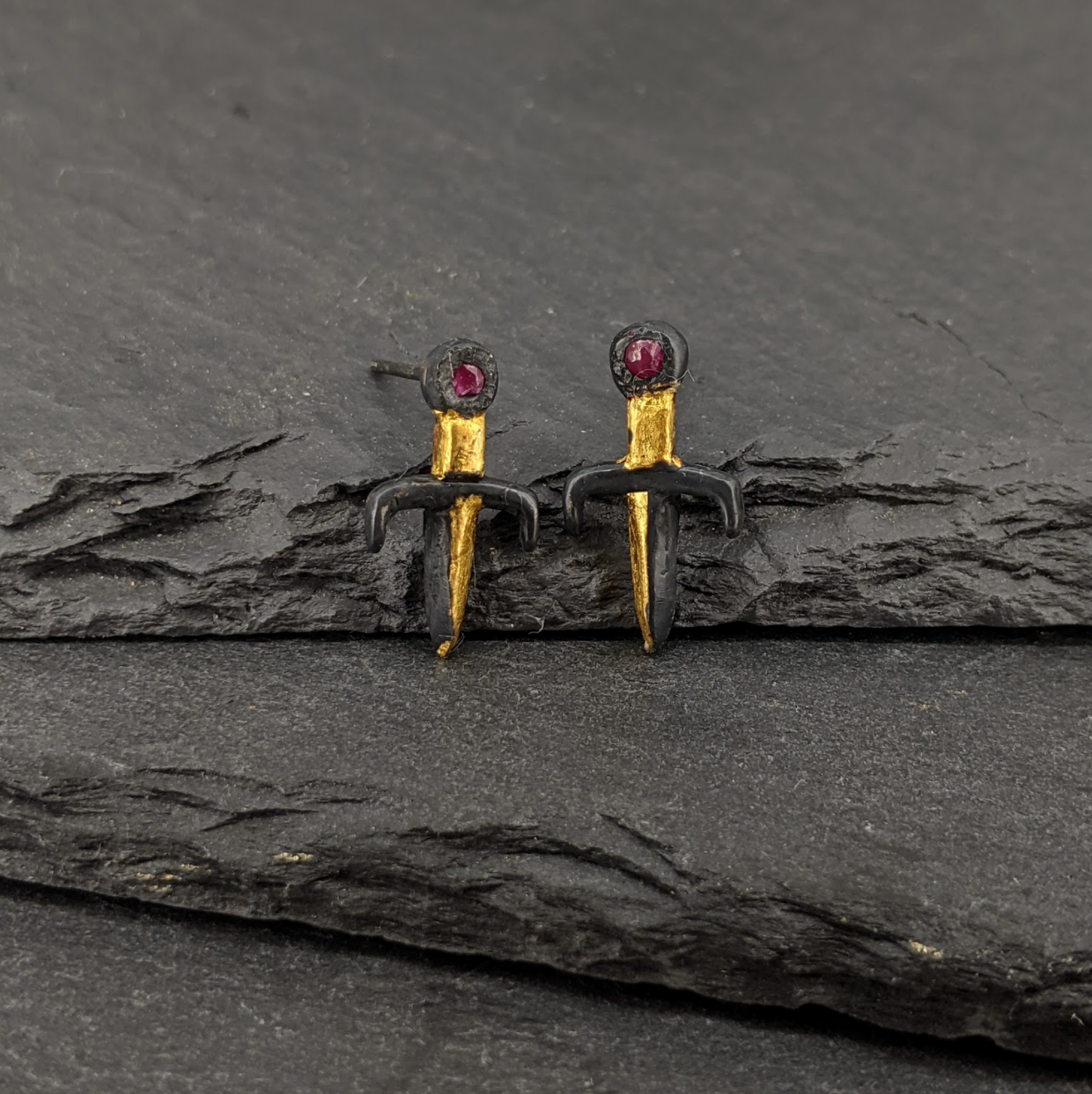 Petite daggers are crafted in oxidized sterling silver and 24 karat gold leaf with tiny rubies set in the hilt. These studs measure just over a half inch in length.