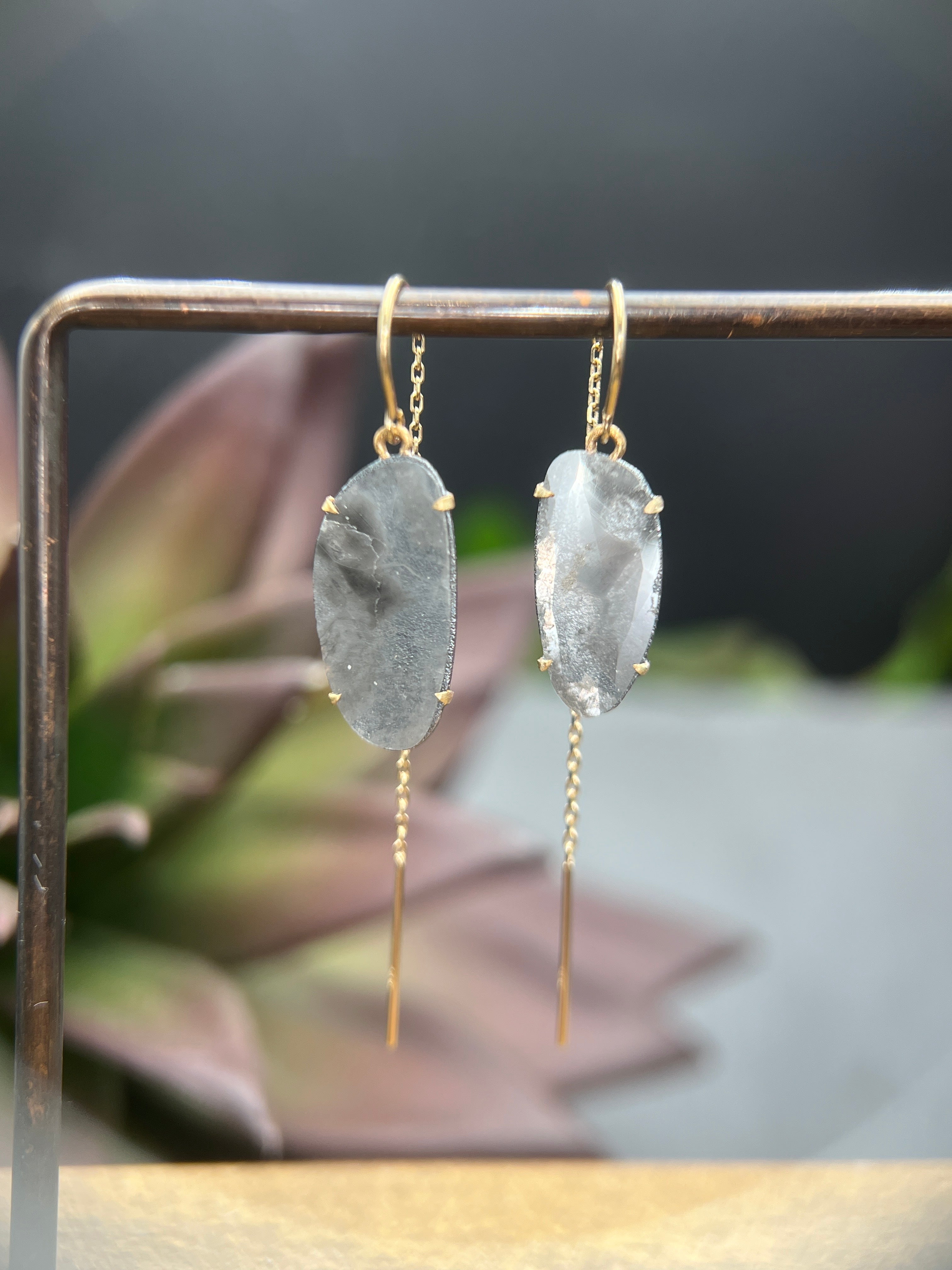 These beautifully delicate threader earrings feature mismatched rustic diamond slices (2.23ctw) held on a plate of oxidized silver by 14k yellow gold talon prongs, connected to 14k yellow gold chain threaders. The earring measure 2 inches in length.