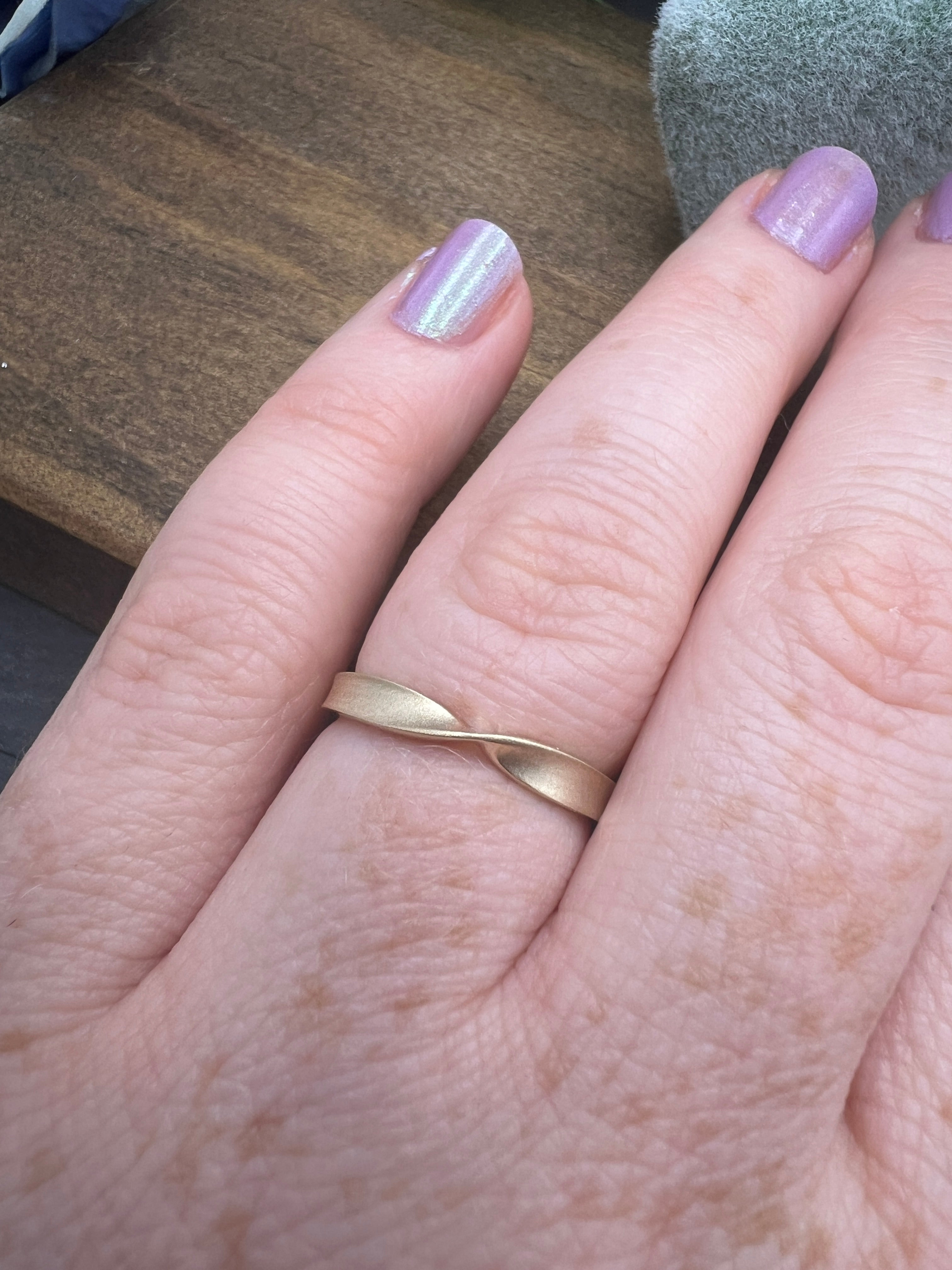 This lovely gold ring features a simple but elegant twist, as well as matte and polished yellow gold, with the matte seen from the top down, and the polished shine seen from the sides. Looks great on its own, and would stack nicely with other rings too. This ring is 14K yellow gold, and is 3mm wide. Currently a size 7, and can be resized.