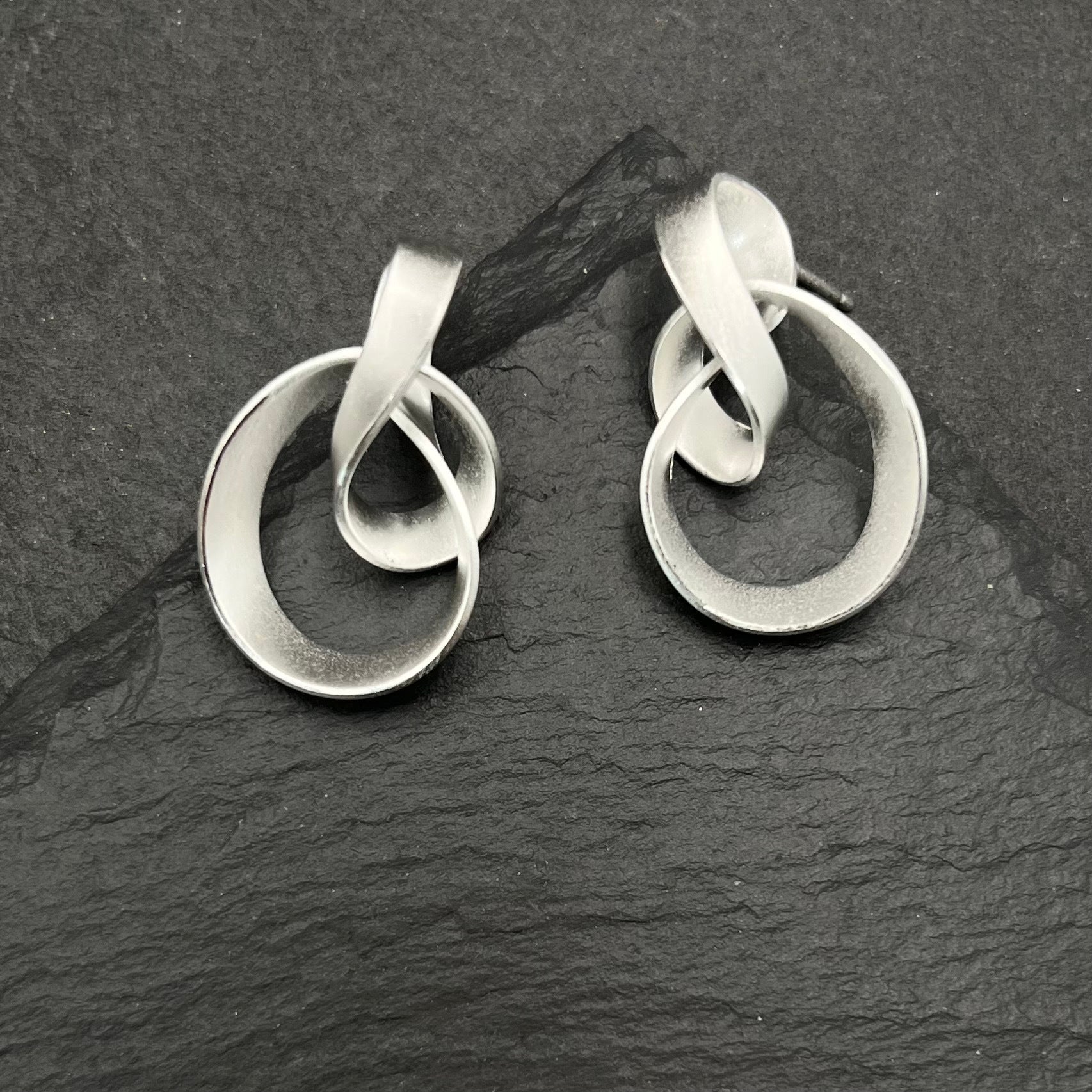 Swirled sterling silver post earrings in a brushed finish are just about 1 inch in length.
