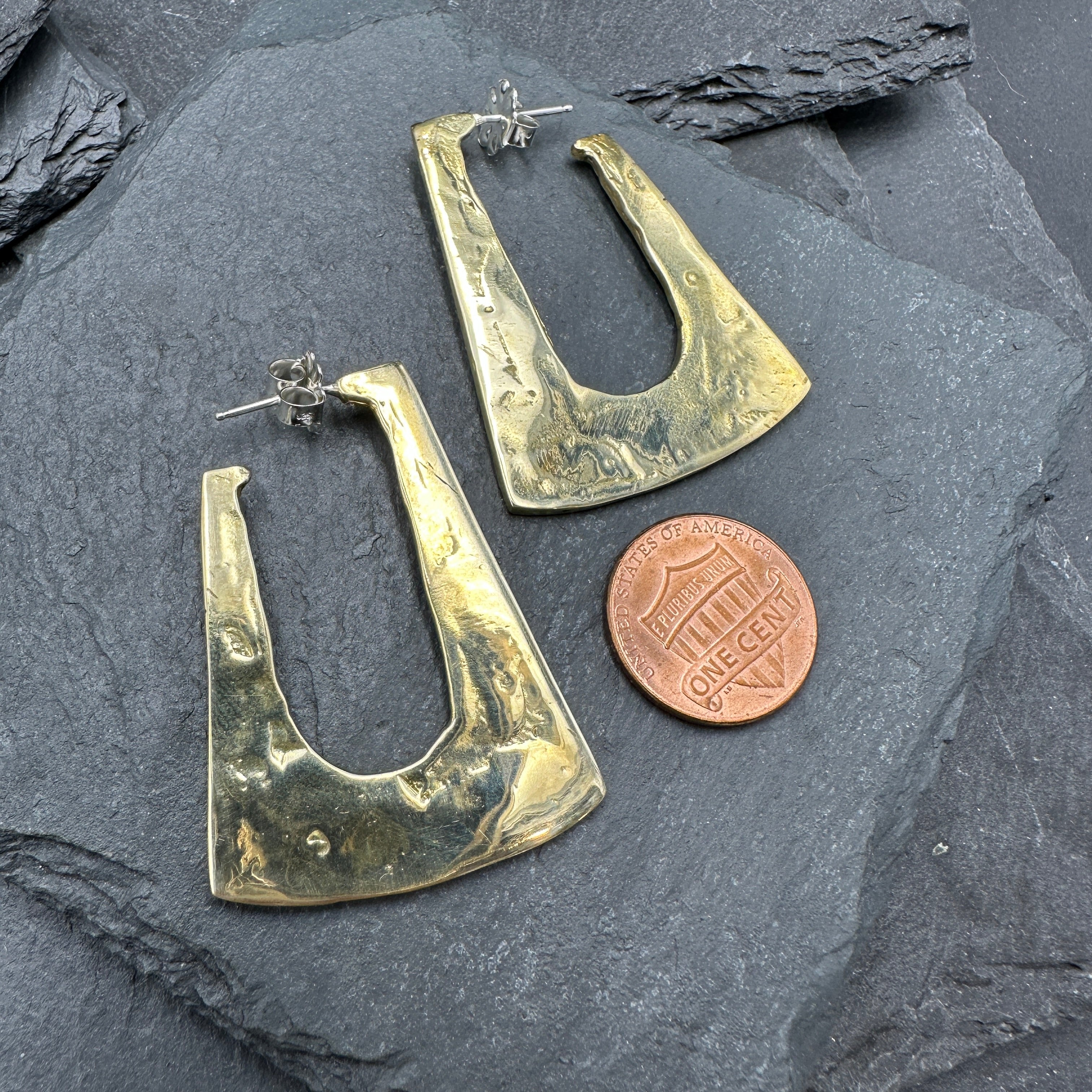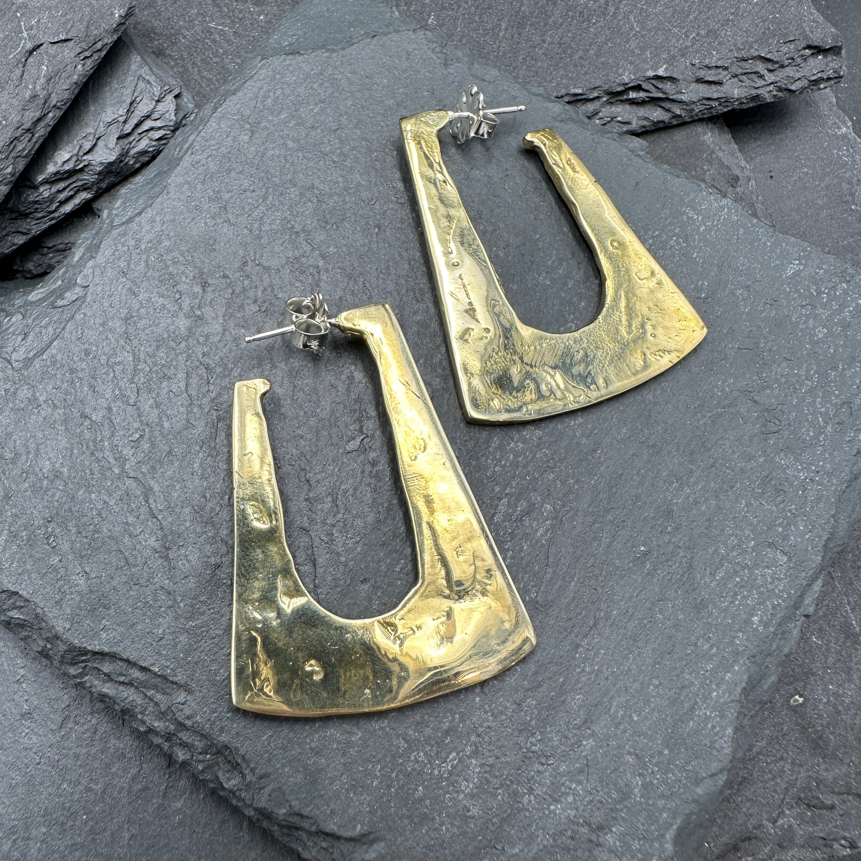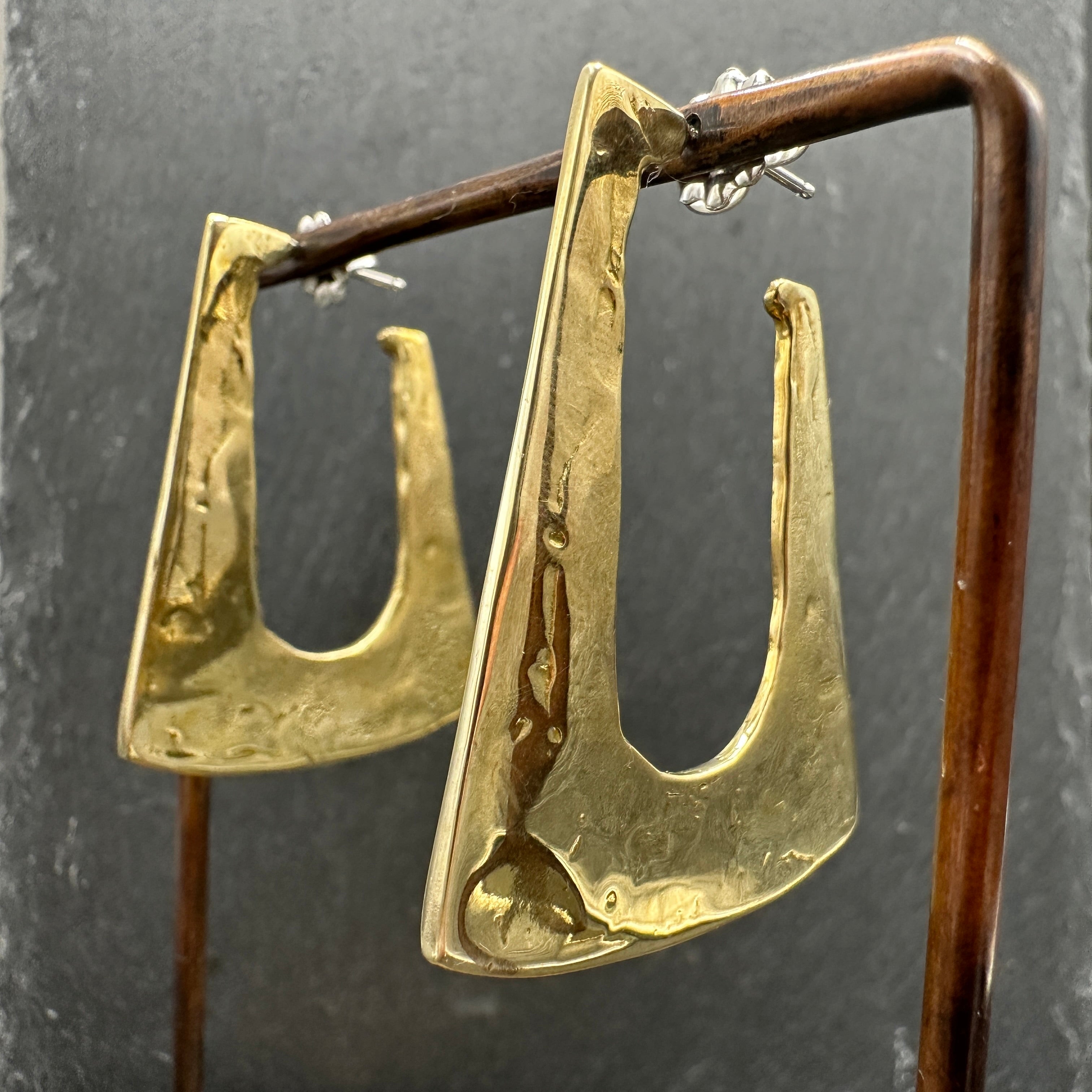 Bold sculptural forms in a modified hoop design with a soft high polished surface. These stunning earrings are approximately 1 3/4 inches long by 1 1/2 inches deep, are solid brass, and have sterling silver ear wires.