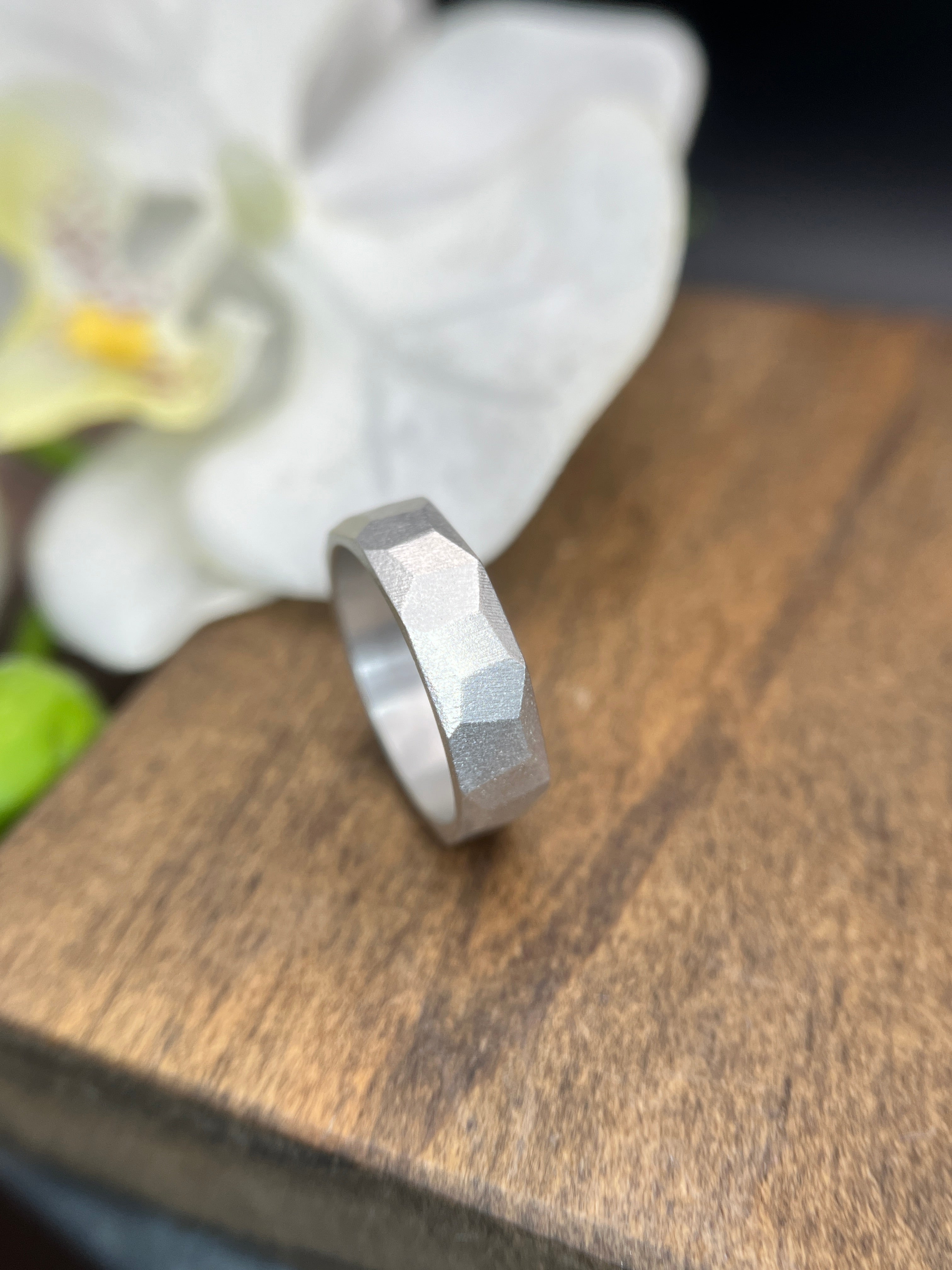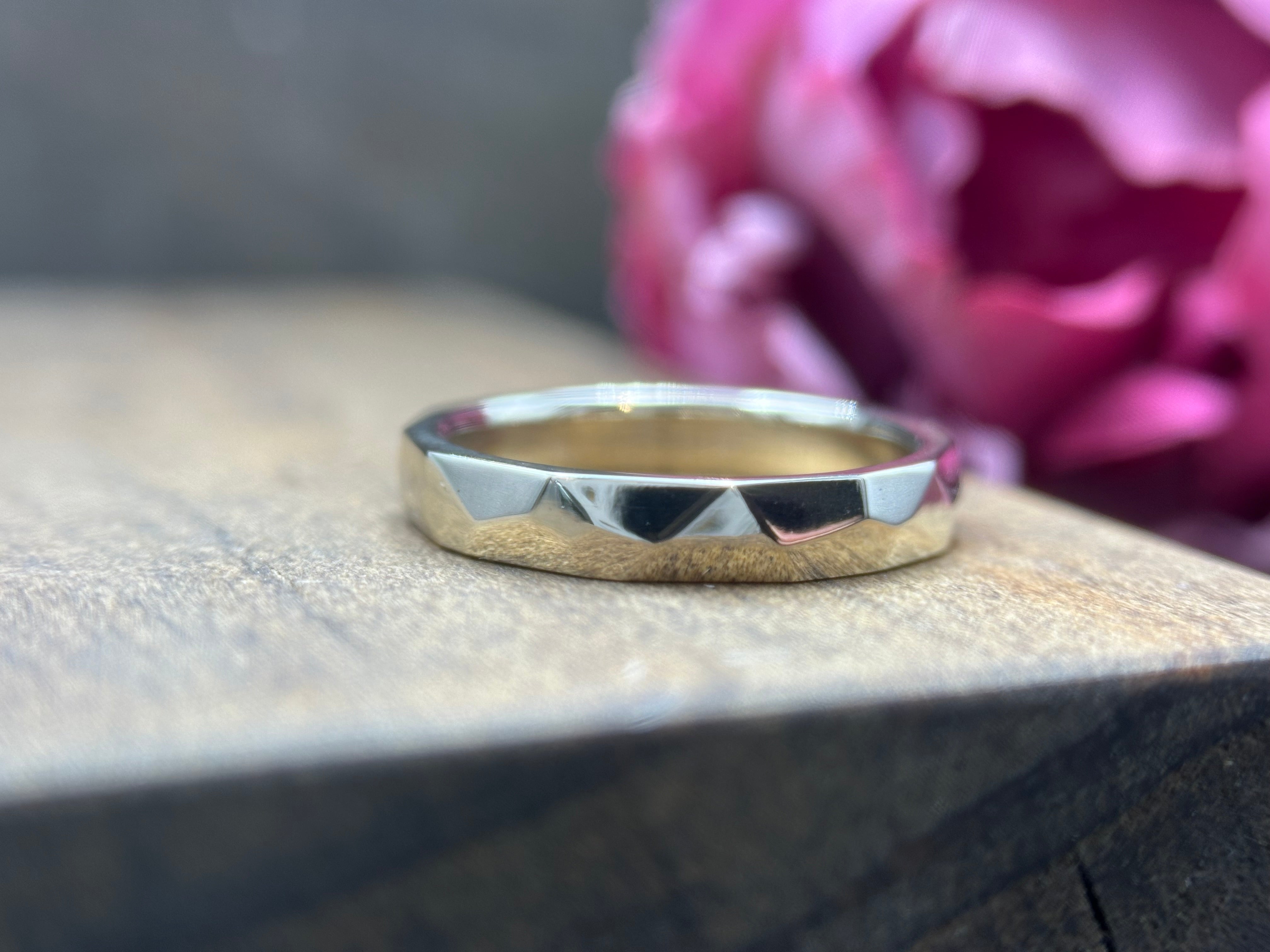 Our facet bands offer the perfect bit of edginess for a wedding band! Each band varies slightly in the placement and angle of the facets.