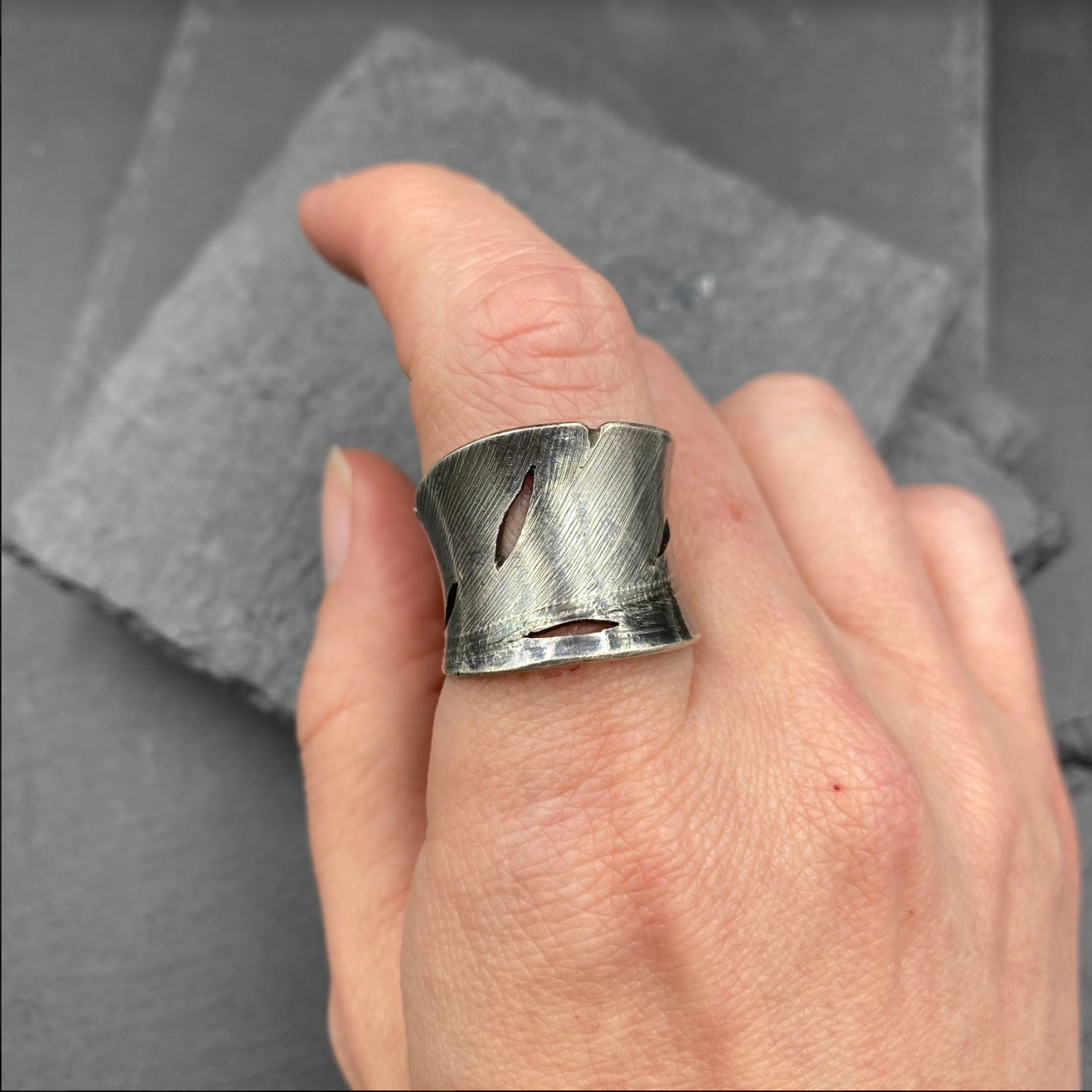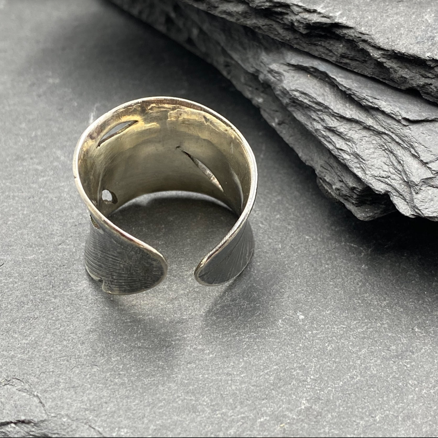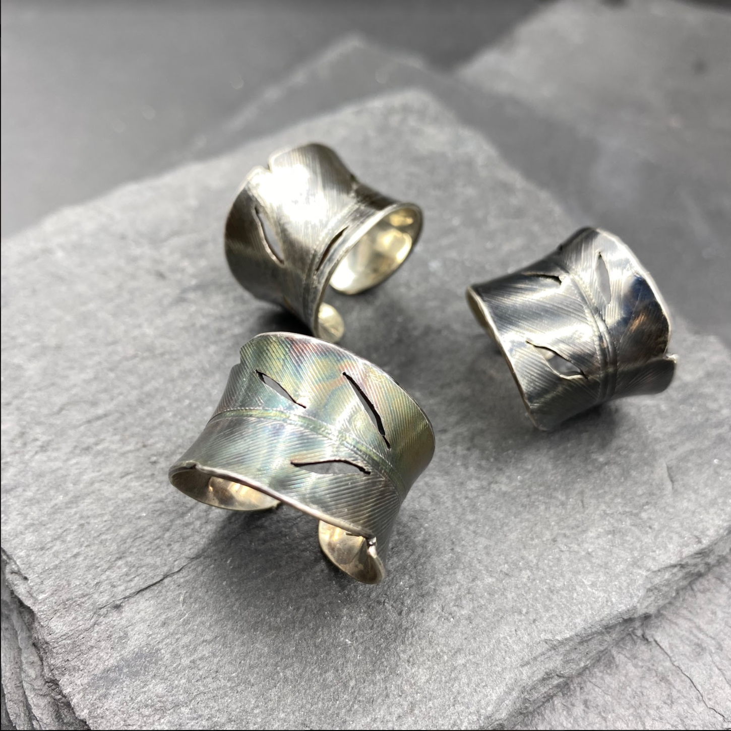 Sterling silver feather rings with cut out detailing. These rings are slightly adjustable because of their open back, and are approximately 3/4 inches across at their widest point. Handmade in Denver, CO.