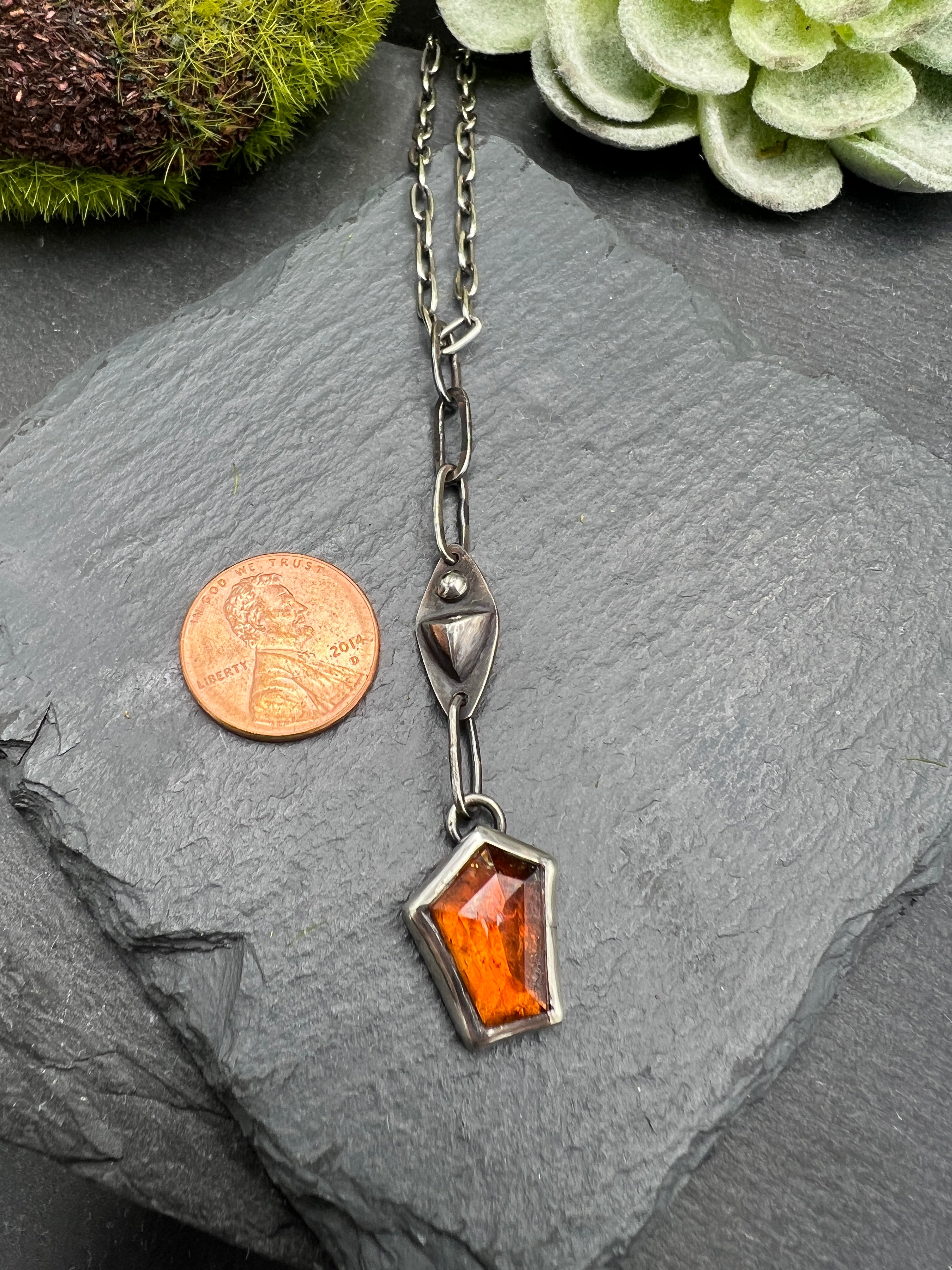 This one of a kind necklace has a geometrically cut garnet dangling below an abstract design in oxidized sterling silver. The design measures 2.5 inches long and hangs from a 22 inch oxidized sterling silver chain.