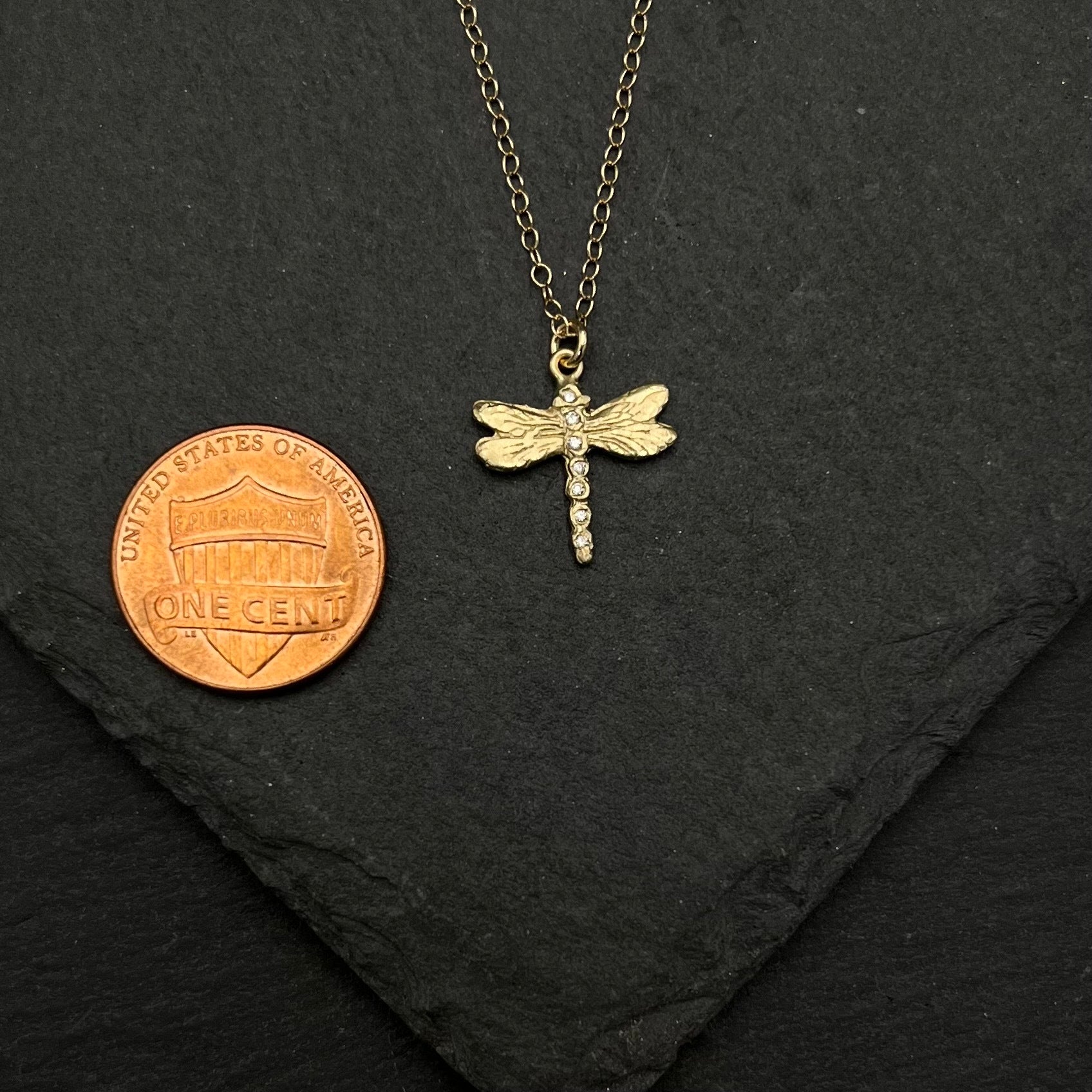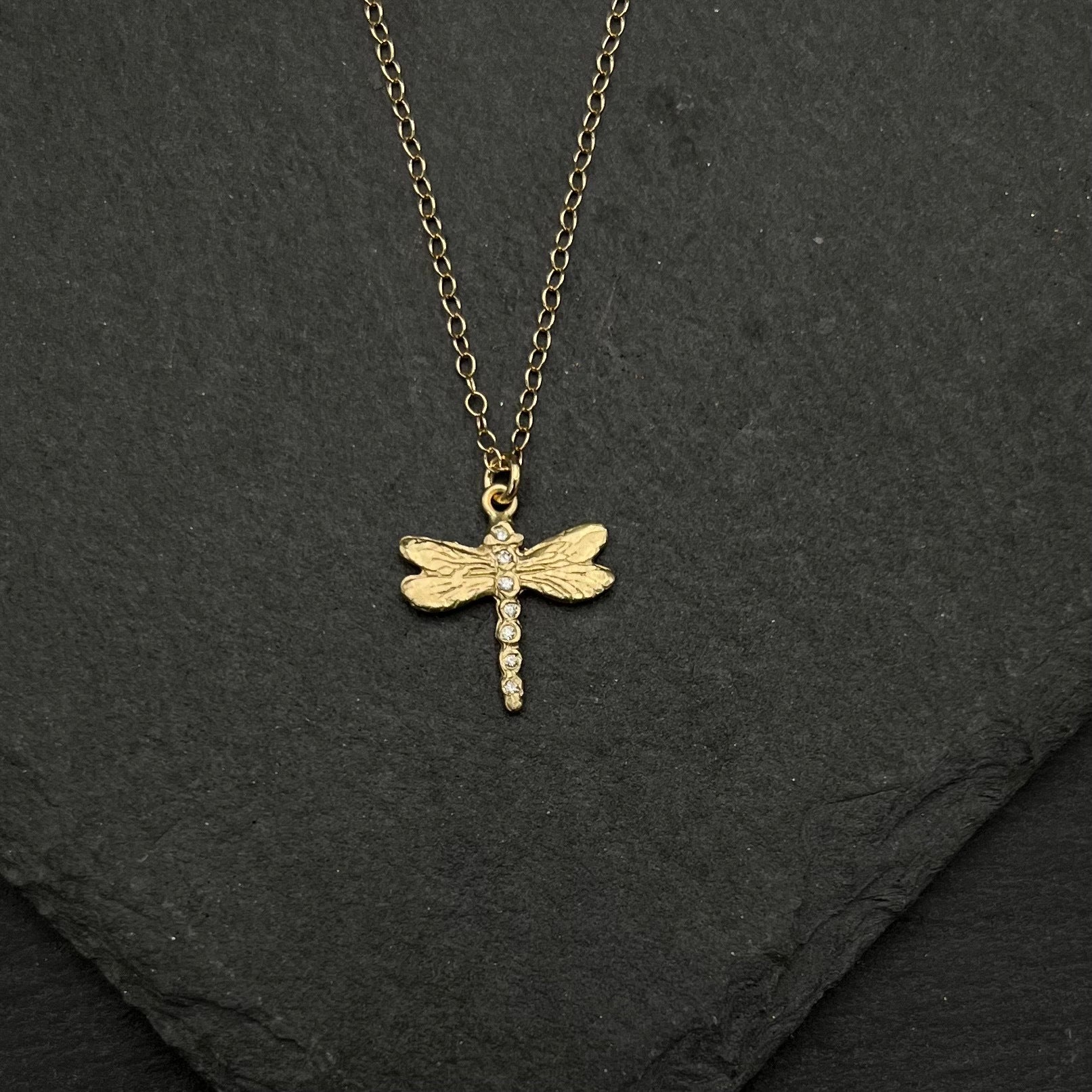 This 14k yellow gold dragonfly is beautifully textured and features 7 diamonds along the body, creating a playful yet elegant pendant.