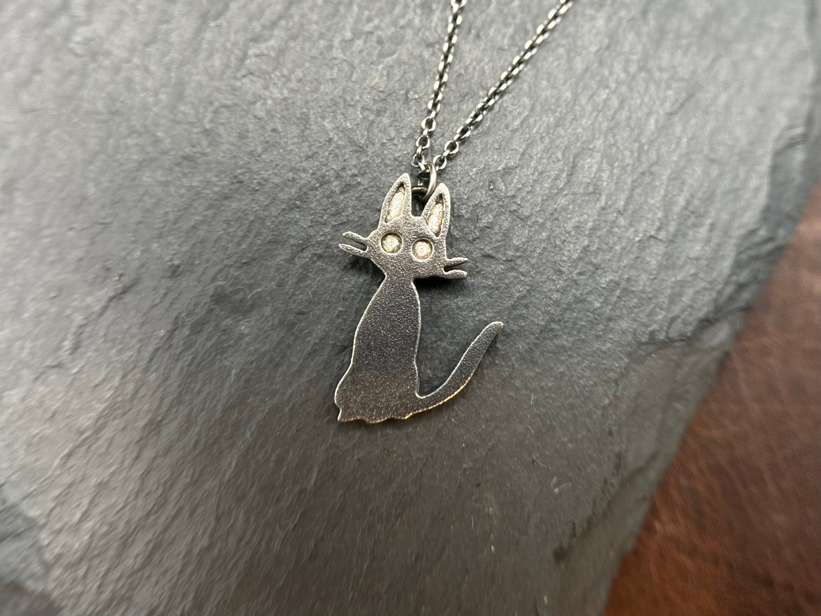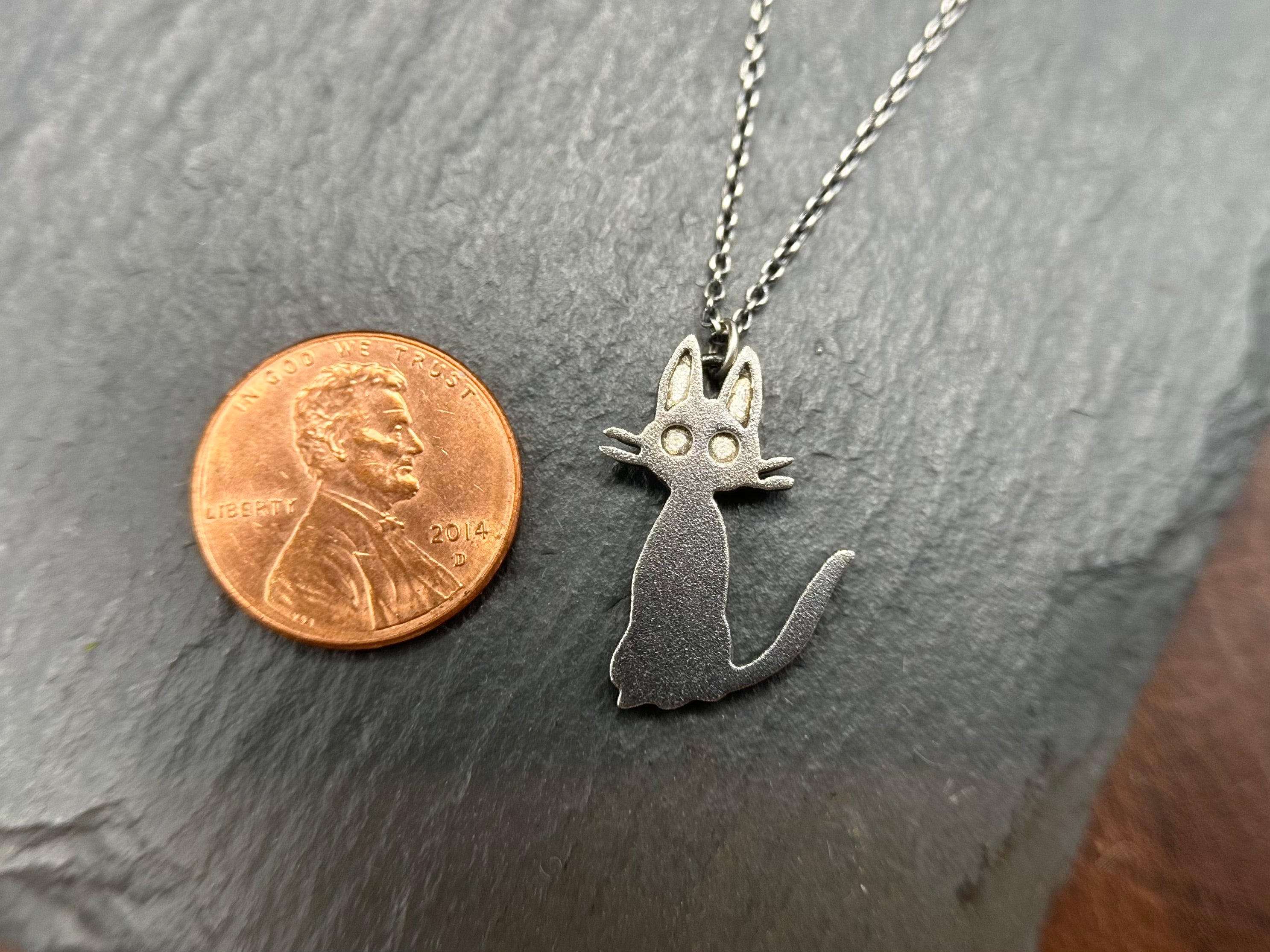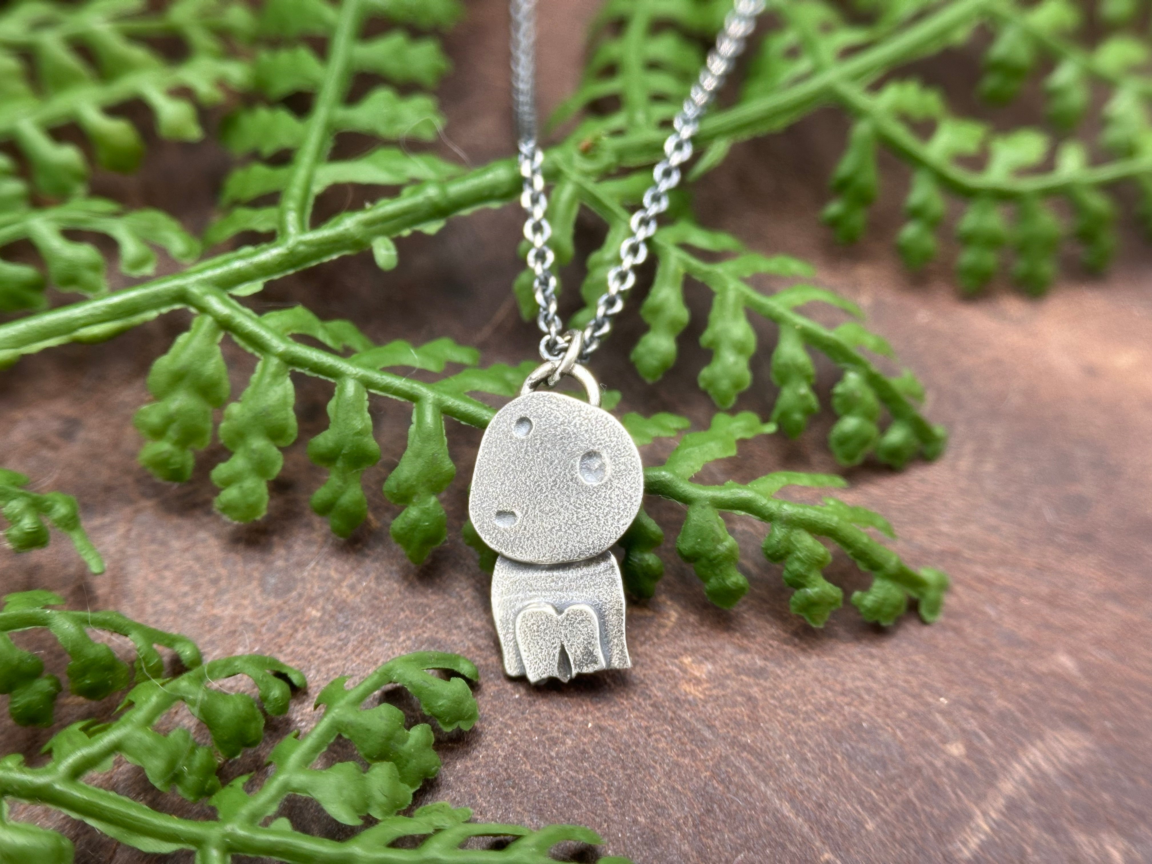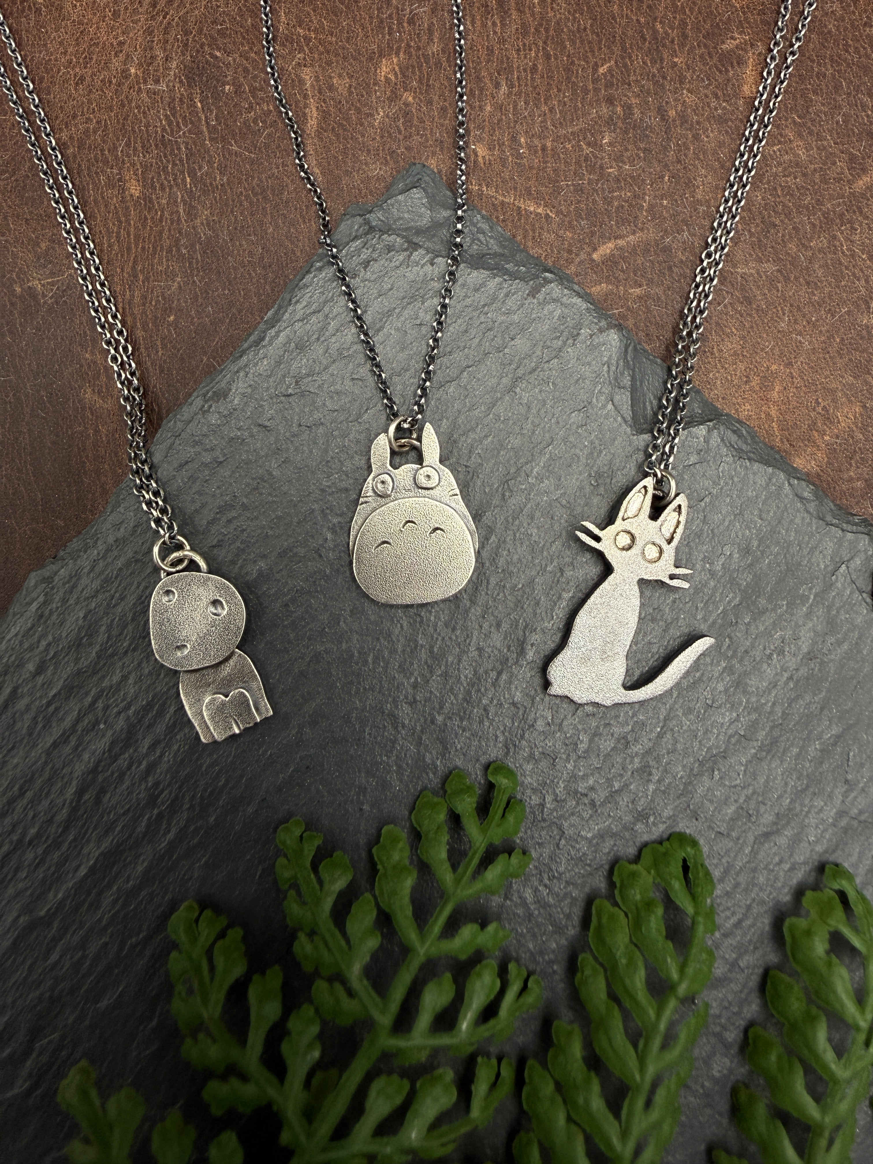 These darling little necklaces hold some of our favorite film creatures- a tree spirit, a cuddly guardian of the forest, and a witty black cat. Each pendant is made in sterling silver, and hangs approximately half under an inch off of an oxidized sterling silver 18” cable chain.