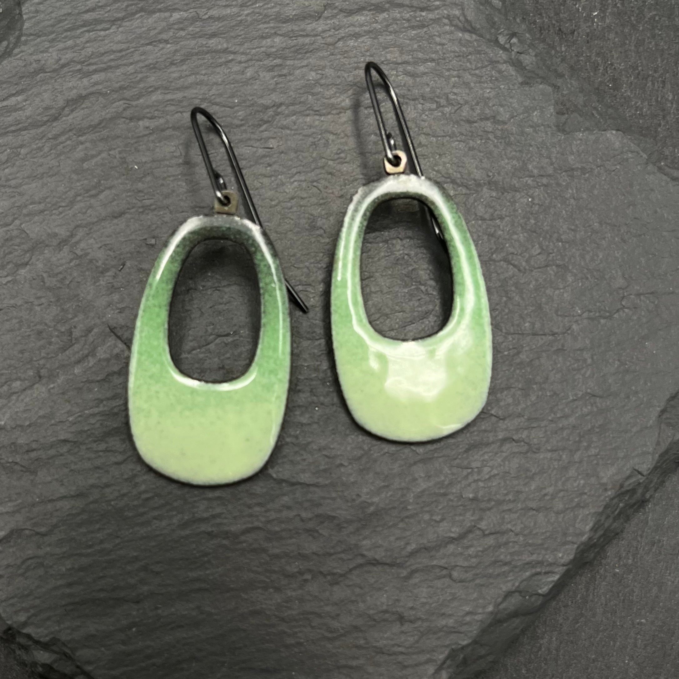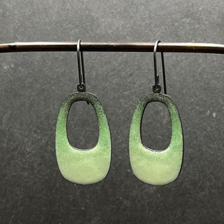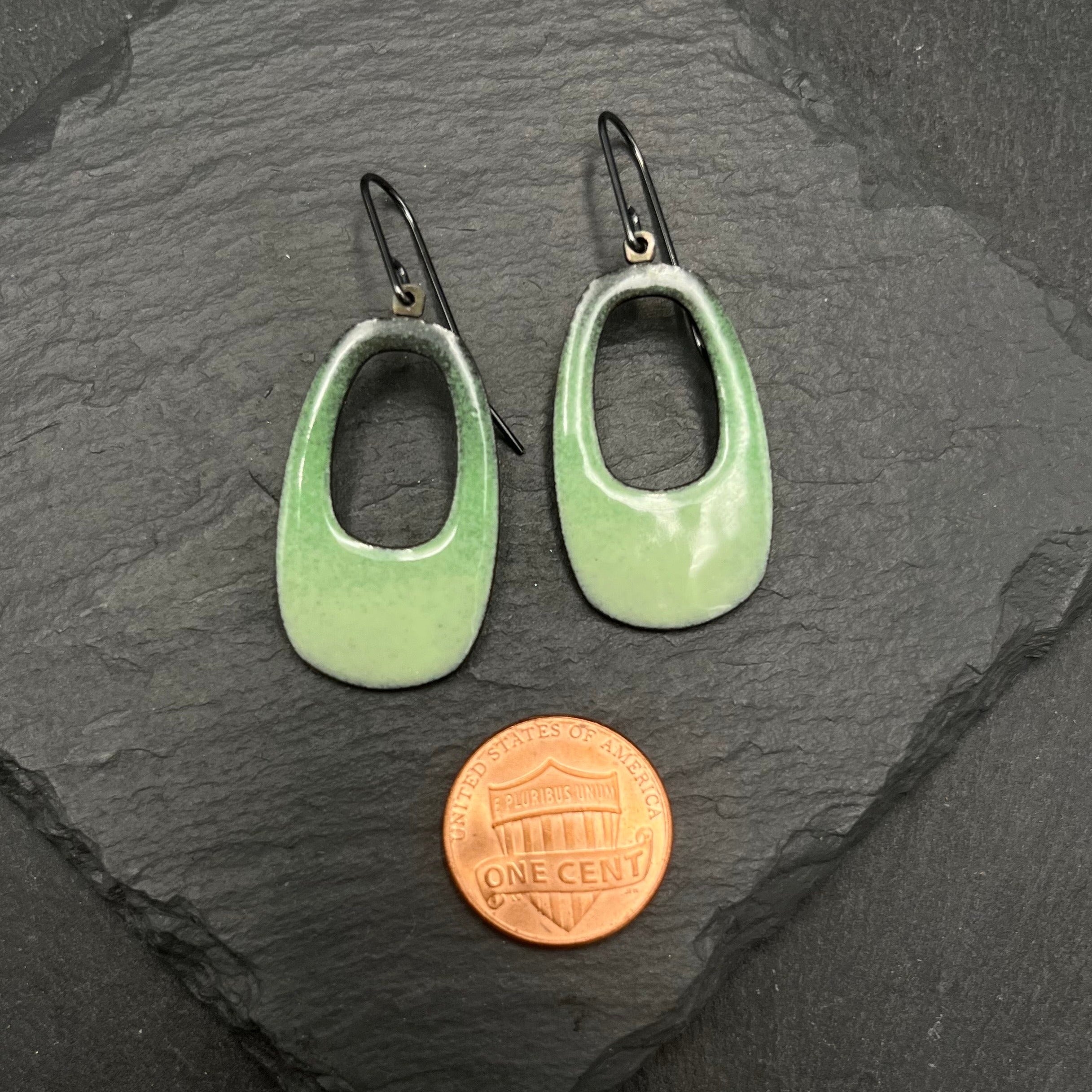 Made of steel with a beautiful ombre light green enamel and oxidized sterling silver earwire, these lovely cut-out earrings hang 1.75 inches in length.