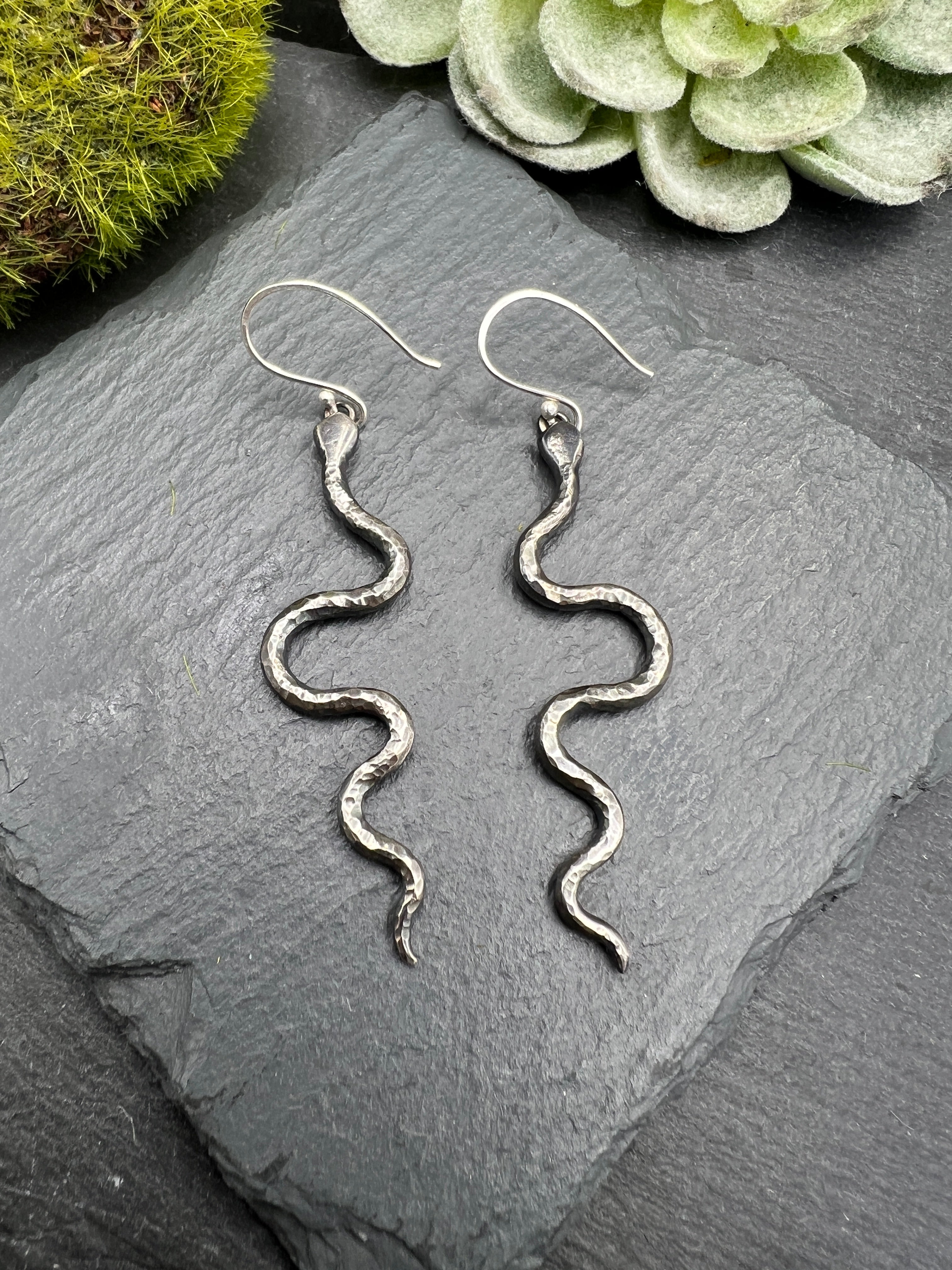 Swirly snakes are hand forged in sterling silver and oxidized to epmhasize their texture. and hang from handmade sterling silver earring hooks. These snake babies are 2 inches in length and hang 2.5 inches in total.