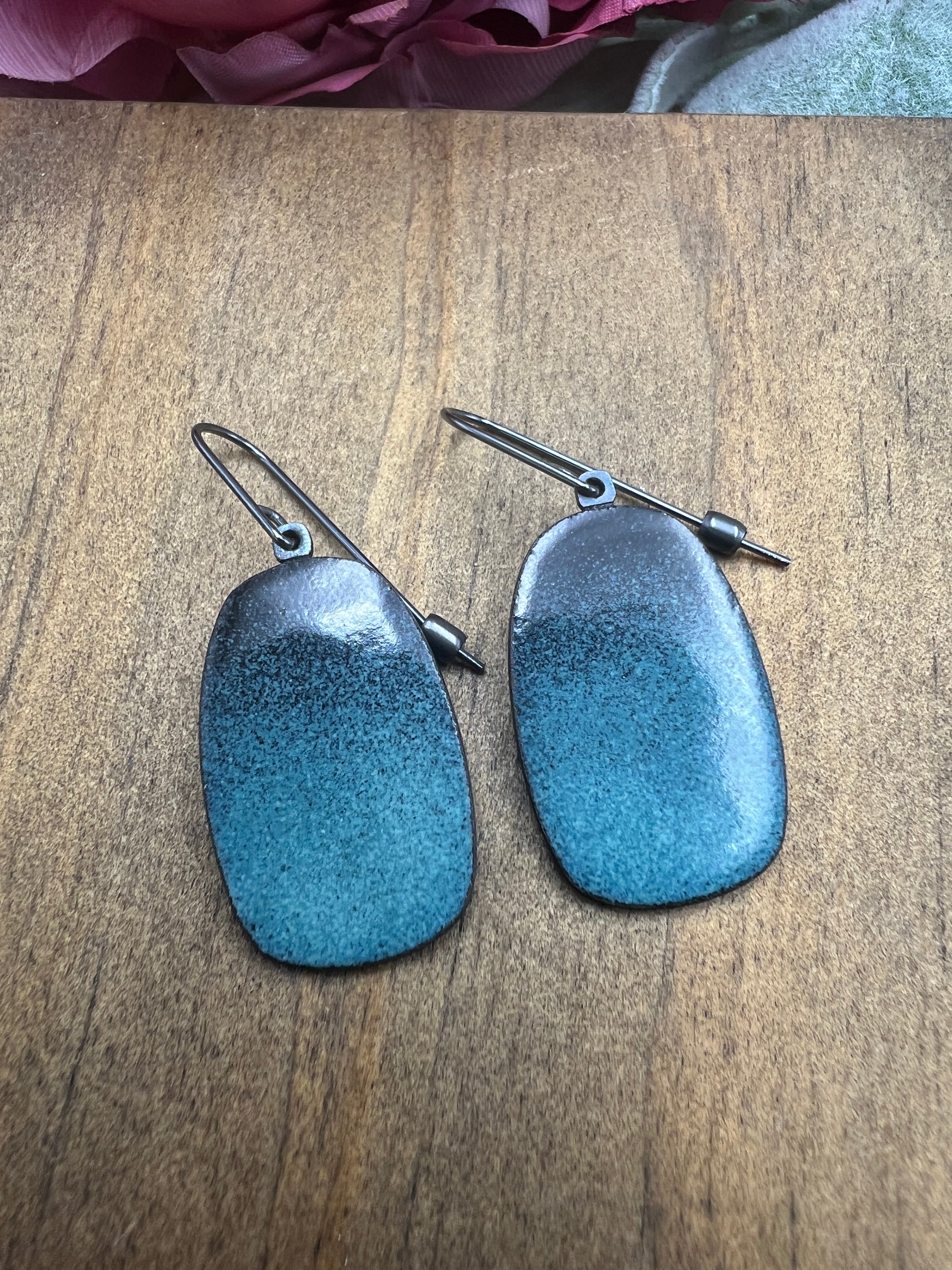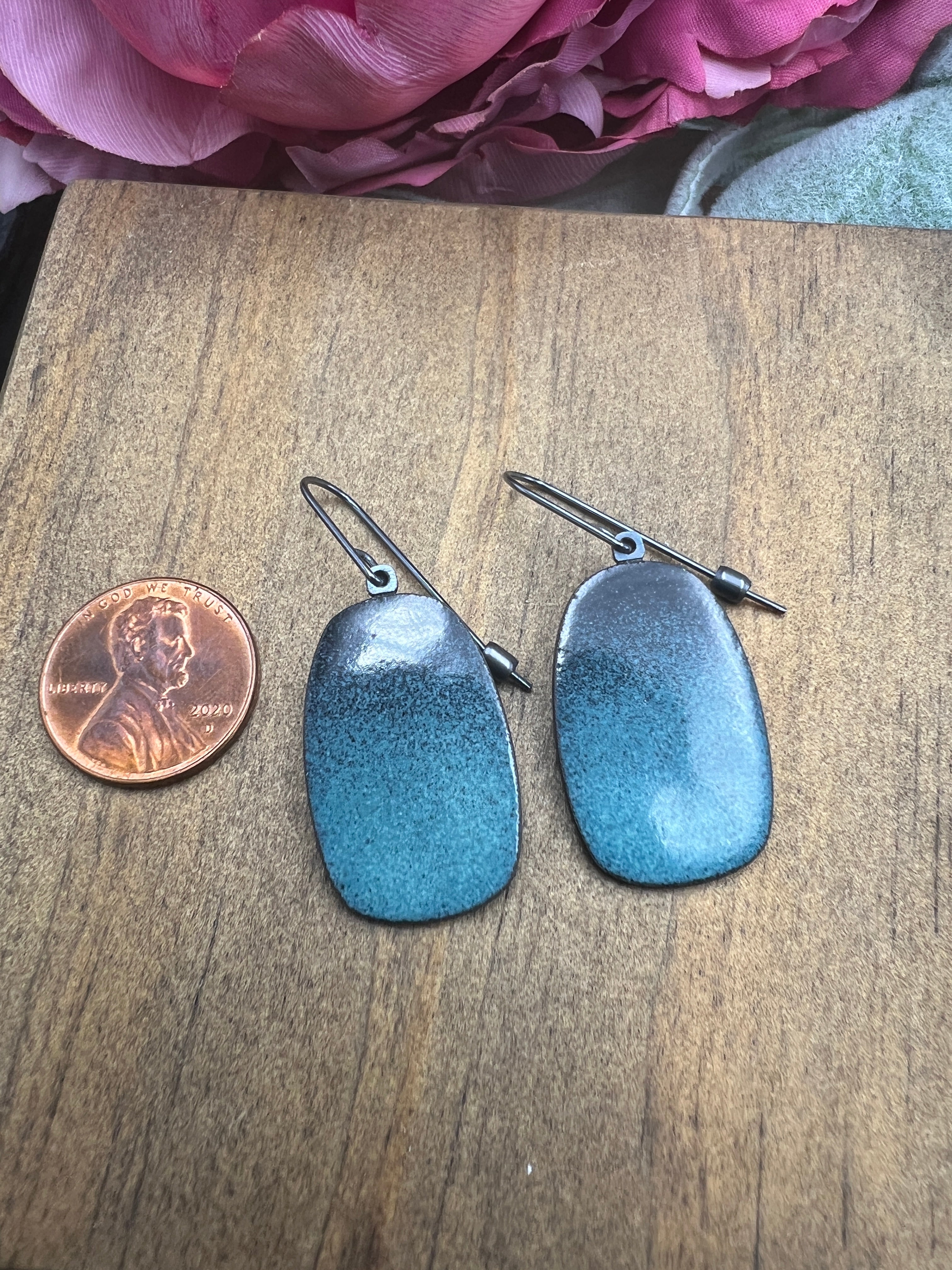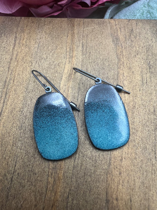 Made from steel, these earrings feature a subtle turquoise colored enamel and oxidized sterling silver earwire. These earrings hang 1 inch in length.