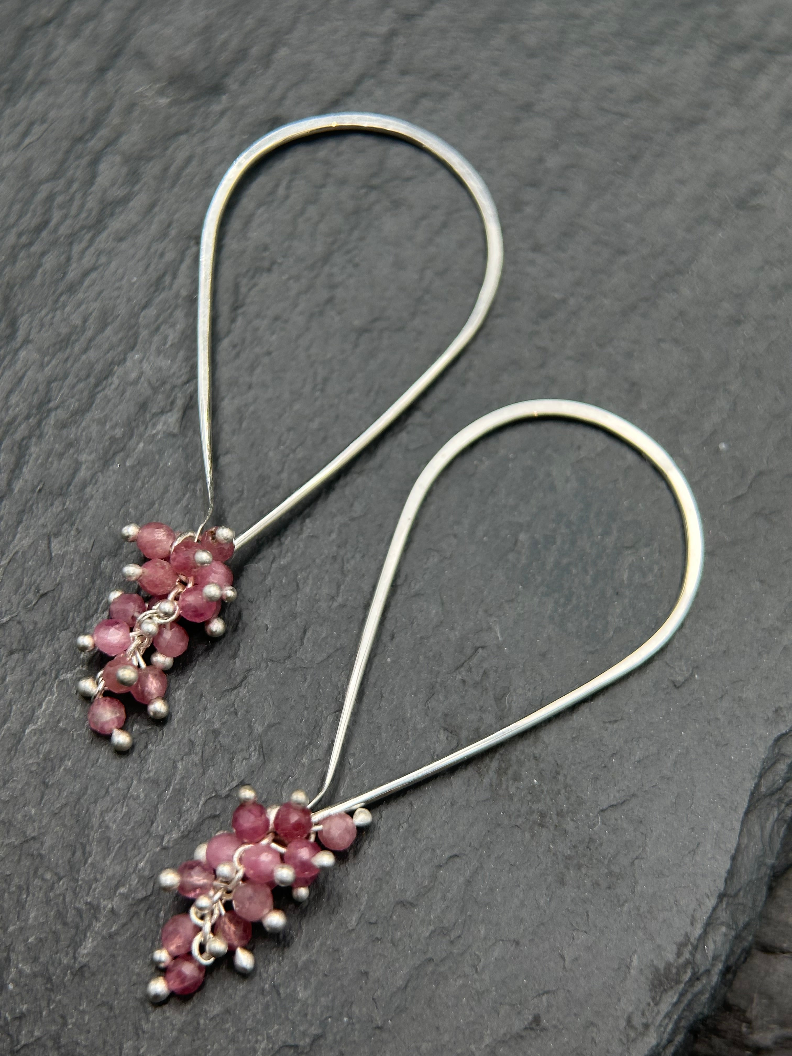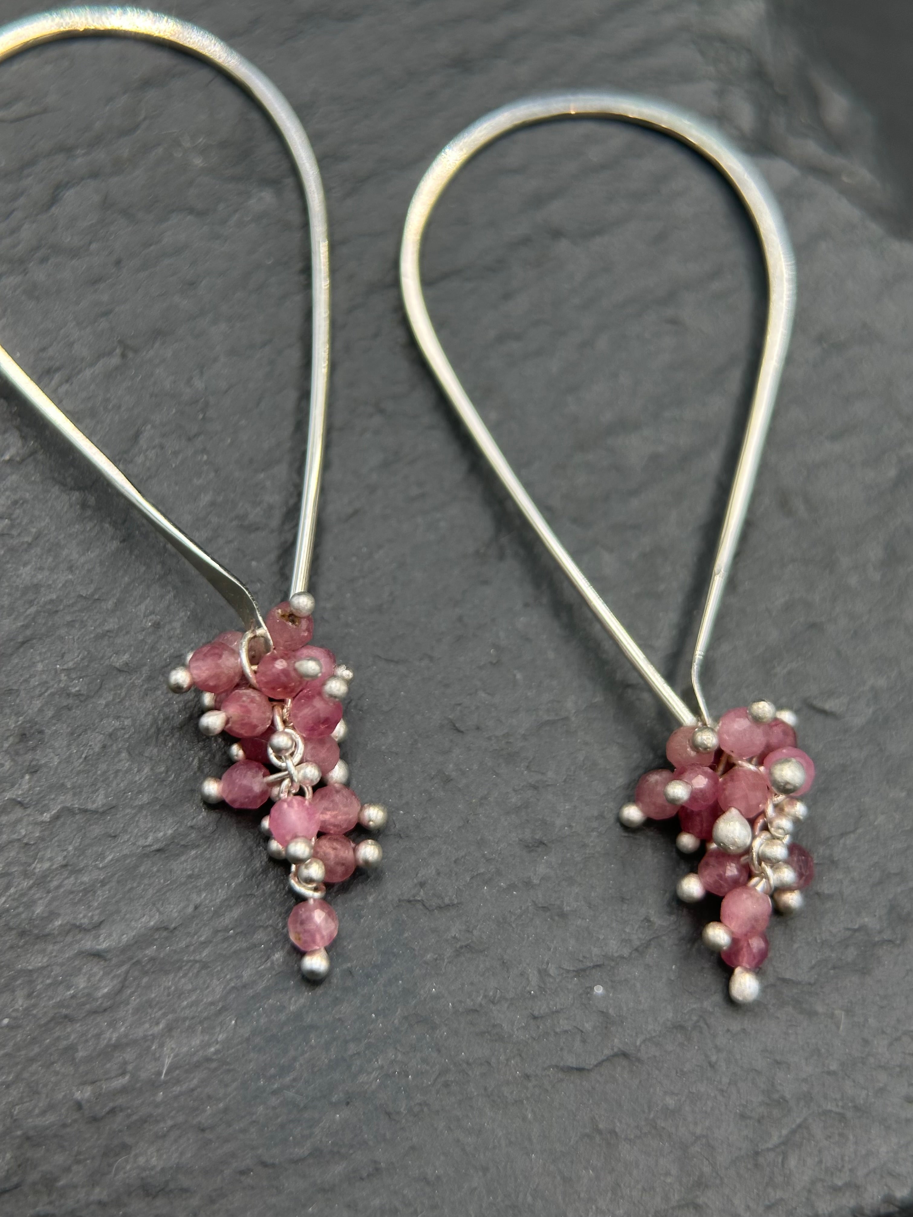 Sterling silver wire is shaped into elongated tear-shaped ear wires with handmade pink tourmaline beads on the bottom. These earrings are approximately 1.25 inches in length.