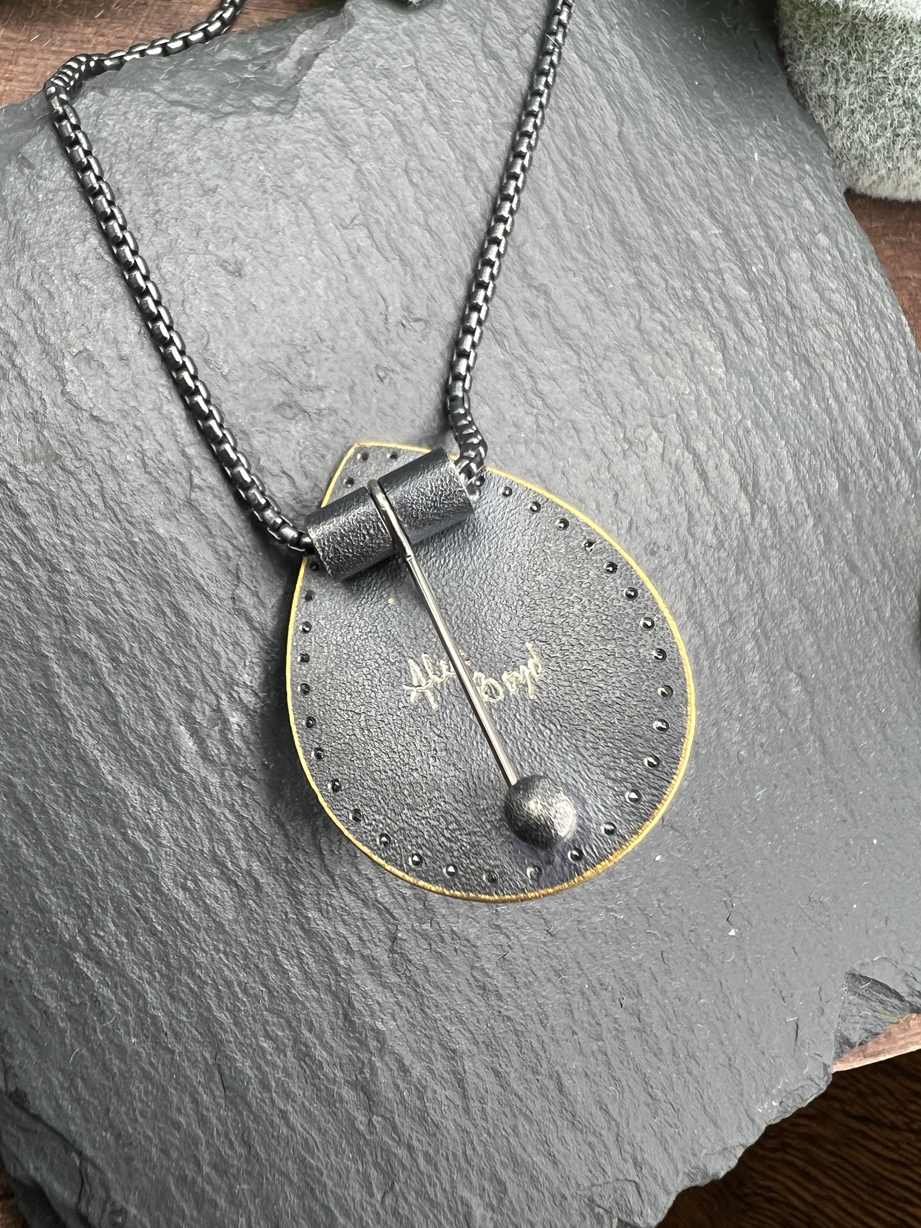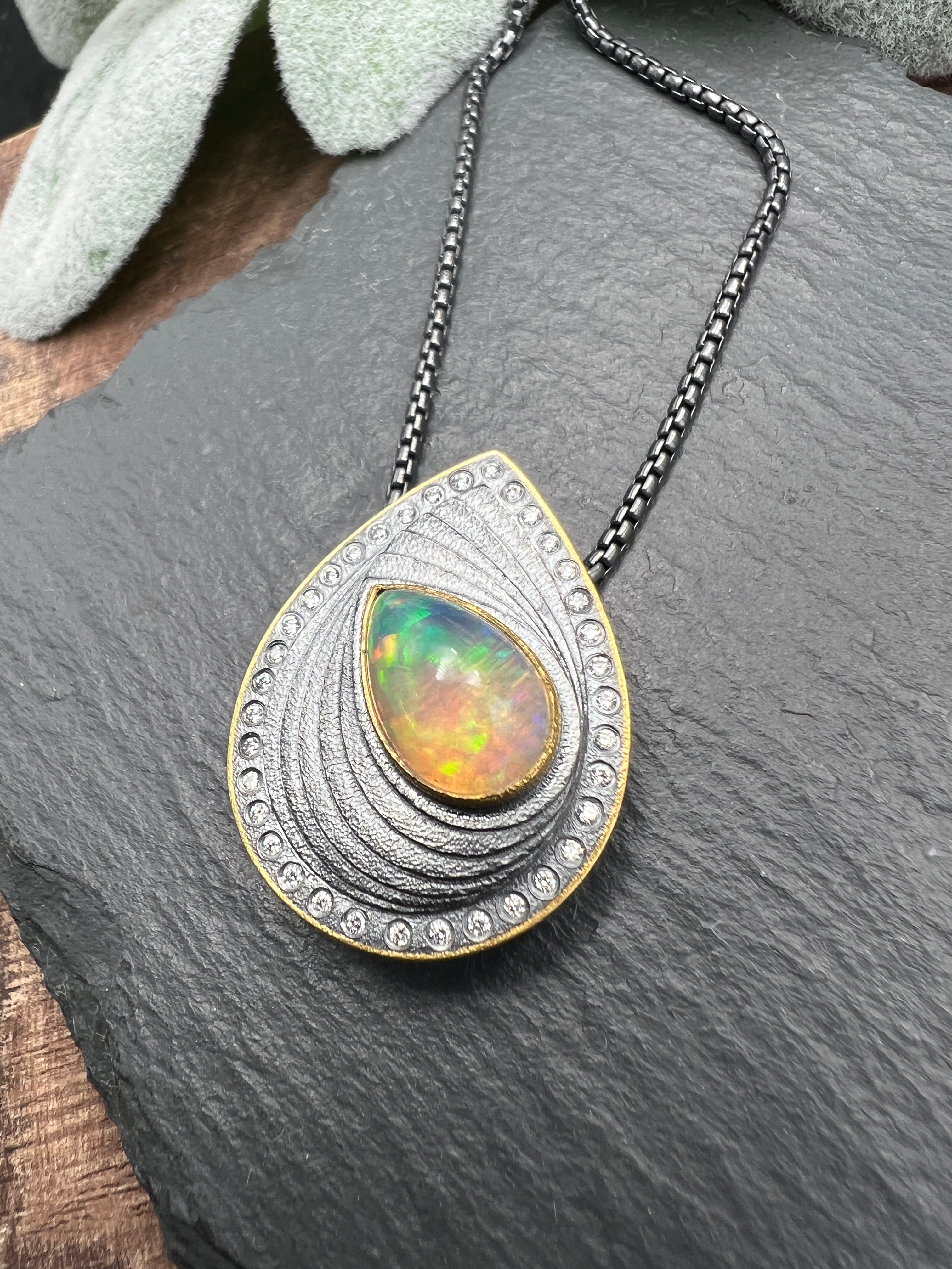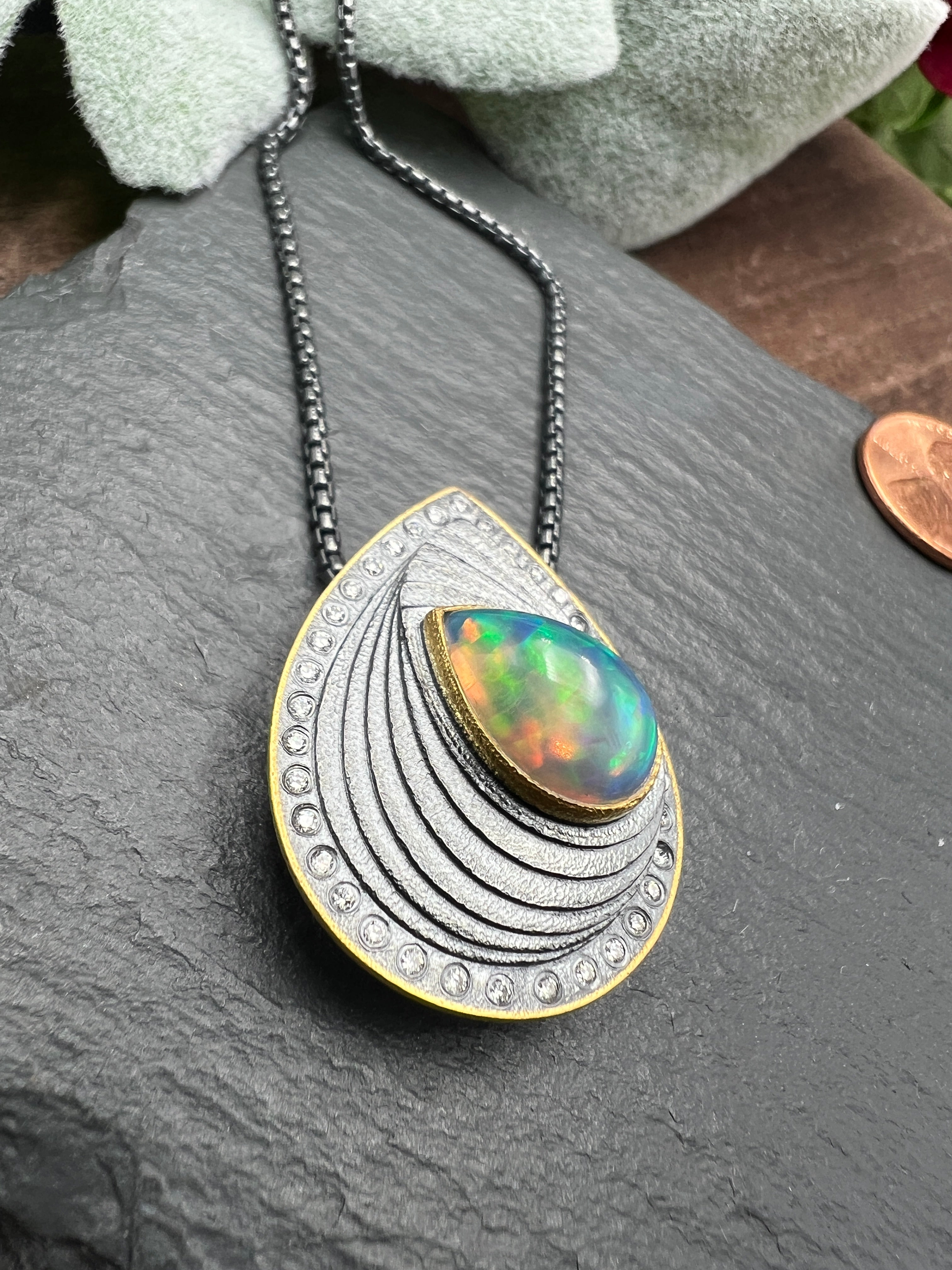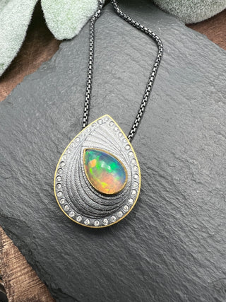 An incredible statement piece which can be worn as a necklace or a brooch features a glowing Ethiopian opal set in 18k yellow gold, with layers of oxidized silver, and a halo of diamonds at .36ctw.